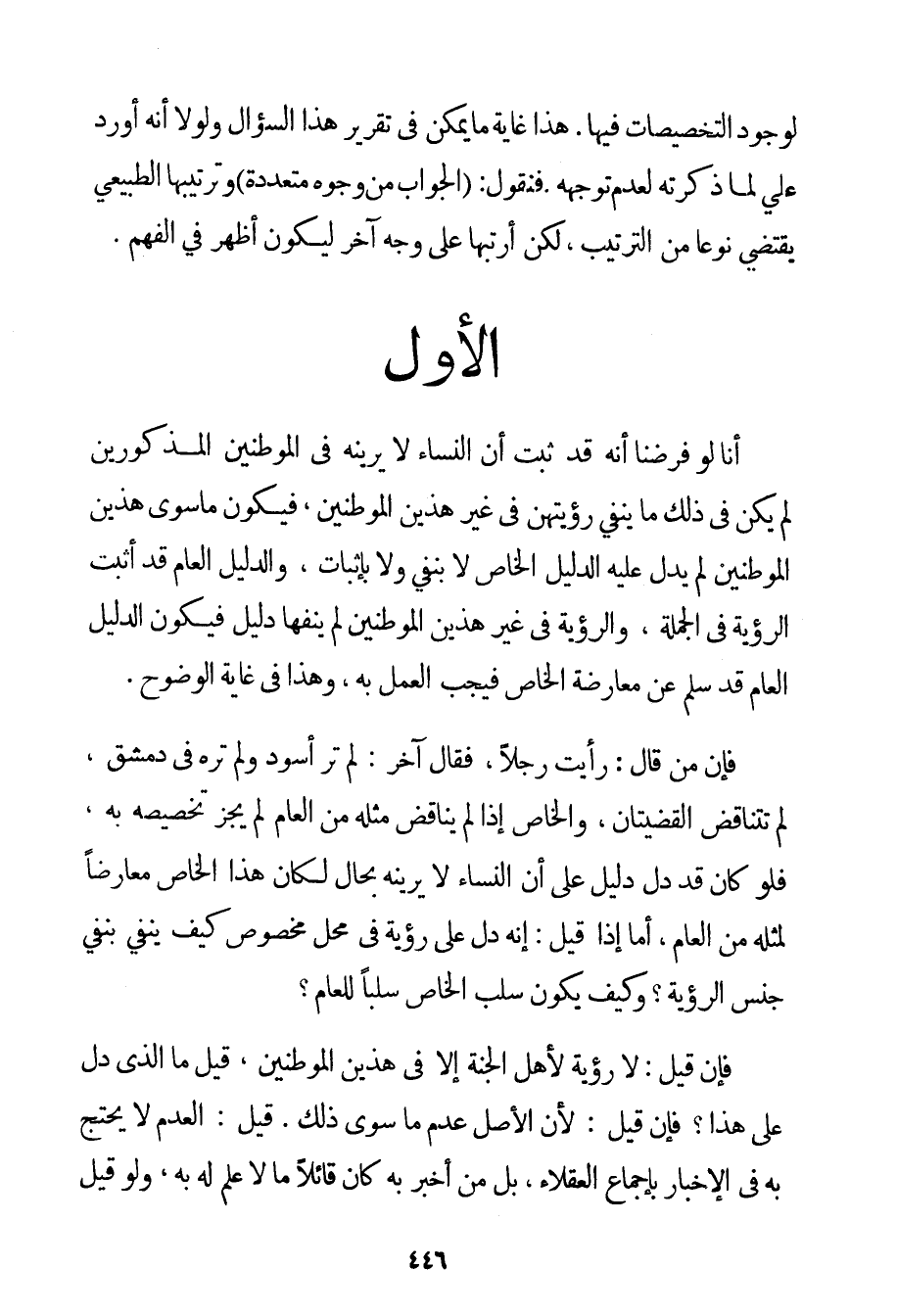 لِوُجُودِ التَّخْصِيصَاتِ فِيهَا. هَذَا غَايَةُ مَا يُمْكِنُ فِي تَقْرِيرِ هَذَا السُّؤَالِ وَلَوْلَا أَنَّهُ أُورِدَ عَلَيَّ لَمَا ذَكَرْته لِعَدَمِ تَوَجُّهِهِ. فَنَقُولُ: الْجَوَابُ مِنْ وُجُوهٍ مُتَعَدِّدَةٍ وَتَرْتِيبُهَا الطَّبِيعِيُّ يَقْتَضِي نَوْعًا مِنْ التَّرْتِيبِ لَكِنْ أُرَتِّبُهَا عَلَى وَجْهٍ آخَرَ لِيَكُونَ أَظْهَرَ فِي الْفَهْمِ الْأَوَّلُ أَنَّا لَوْ فَرَضْنَا أَنَّهُ قَدْ ثَبَتَ أَنَّ النِّسَاءَ لَا يَرَيْنَهُ فِي الْمَوْطِنَيْنِ الْمَذْكُورَيْنِ لَمْ يَكُنْ فِي ذَلِكَ مَا يَنْفِي رُؤْيَتَهُنَّ فِي غَيْرِ هَذَيْنِ الْمَوْطِنَيْنِ فَيَكُونُ مَا سِوَى هَذَيْنِ الْمَوْطِنَيْنِ لَمْ يَدُلَّ عَلَيْهِ الدَّلِيلُ الْخَاصُّ لَا بِنَفْيٍ وَلَا بِإِثْبَاتِ وَالدَّلِيلُ الْعَامُّ قَدْ أَثْبَتَ الرُّؤْيَةَ فِي الْجُمْلَةِ وَالرُّؤْيَةُ فِي غَيْرِ هَذَيْنِ الْمَوْطِنَيْنِ لَمْ يَنْفِهَا دَلِيلٌ فَيَكُونَ الدَّلِيلُ الْعَامُّ قَدْ سَلِمَ عَنْ مُعَارَضَةِ الْخَاصِّ فَيَجِبَ الْعَمَلُ بِهِ وَهَذَا فِي غَايَةِ الْوُضُوحِ. فَإِنَّ مَنْ قَالَ: رَأَيْت رَجُلًا فَقَالَ آخَرُ: لَمْ تَرَ أَسْوَدَ وَلَمْ تَرَهُ فِي دِمَشْقَ لَمْ تَتَنَاقَضْ الْقَضِيَّتَانِ وَالْخَاصُّ إذَا لَمْ يُنَاقِضْ مِثْلَهُ مِنْ الْعَامِّ لَمْ يَجُزْ تَخْصِيصُهُ بِهِ فَلَوْ كَانَ قَدْ دَلَّ دَلِيلٌ عَلَى أَنَّ النِّسَاءَ لَا يَرَيْنَهُ بِحَالِ لَكَانَ هَذَا الْخَاصُّ مُعَارِضًا لِمِثْلِهِ مِنْ الْعَامِّ أَمَّا إذَا قِيلَ: إنَّهُ دَلَّ عَلَى رُؤْيَةٍ فِي مَحَلٍّ مَخْصُوصٍ كَيْفَ يُنْفَى بِنَفْيِ جِنْسِ الرُّؤْيَةِ؟ وَكَيْفَ يَكُونُ سَلْبُ الْخَاصِّ سَلْبًا لِلْعَامِّ؟ فَإِنْ قِيلَ: لَا رُؤْيَةَ لِأَهْلِ الْجَنَّةِ إلَّا فِي هَذَيْنِ الْمَوْطِنَيْنِ قِيلَ مَا الَّذِي دَلَّ عَلَى هَذَا؟ فَإِنْ قِيلَ: لِأَنَّ الْأَصْلَ عَدَمُ مَا سِوَى ذَلِكَ. قِيلَ: الْعَدَمُ لَا يُحْتَجُّ بِهِ فِي الْأَخْبَارِ بِإِجْمَاعِ الْعُقَلَاءِ بَلْ مَنْ أَخْبَرَ بِهِ كَانَ قَائِلًا مَا لَا عِلْمَ لَهُ بِهِ وَلَوْ قِيلَ