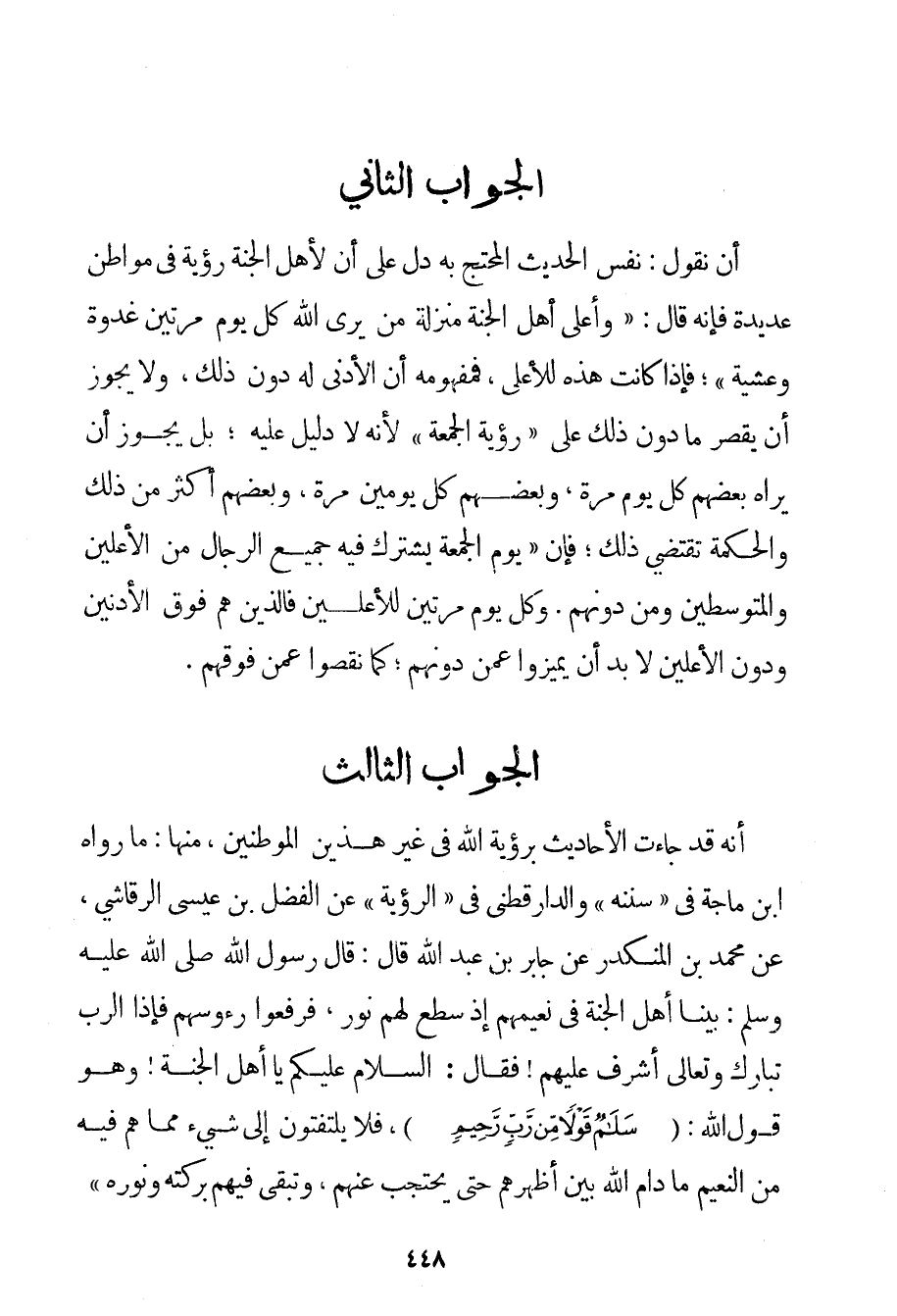 أَنْ نَقُولَ: نَفْسُ الْحَدِيثِ الْمُحْتَجِّ بِهِ دَلَّ عَلَى أَنَّ لِأَهْلِ الْجَنَّةِ رُؤْيَةً فِي مَوَاطِنَ عَدِيدَةٍ فَإِنَّهُ {قَالَ: وَأَعْلَى أَهْلِ الْجَنَّةِ مَنْزِلَةً مَنْ يَرَى اللَّهَ كُلَّ يَوْمٍ مَرَّتَيْنِ غَدْوَةً وَعَشِيَّةً} فَإِذَا كَانَتْ هَذِهِ لِلْأَعْلَى فَمَفْهُومُهُ أَنَّ الْأَدْنَى لَهُ دُونَ ذَلِكَ وَلَا يَجُوزُ أَنْ يُقْصَرَ مَا دُونَ ذَلِكَ عَلَى " رُؤْيَةِ الْجُمُعَةِ " لِأَنَّهُ لَا دَلِيلَ عَلَيْهِ؛ بَلْ يَجُوزُ أَنْ يَرَاهُ بَعْضُهُمْ كُلَّ يَوْمٍ مَرَّةً وَبَعْضُهُمْ كُلَّ يَوْمَيْنِ مَرَّةً وَبَعْضُهُمْ أَكْثَرَ مِنْ ذَلِكَ وَالْحِكْمَةُ تَقْتَضِي ذَلِكَ؛ فَإِنَّ " يَوْمَ الْجُمُعَةِ يَشْتَرِكُ فِيهِ جَمِيعُ الرِّجَالِ مِنْ الْأَعْلَيْنَ والمتوسطين وَمَنْ دُونَهُمْ. وَكُلَّ يَوْمٍ مَرَّتَيْنِ لِلْأَعْلَيْنَ فَاَلَّذِينَ هُمْ فَوْقَ الْأَدْنَيْنَ وَدُونَ الْأَعْلَيْنَ لَا بُدَّ أَنْ يُمَيَّزُوا عَمَّنْ دُونَهُمْ؛ كَمَا نُقِصُوا عَمَّنْ فَوْقَهُمْ. الْجَوَابُ الثَّالِثُ أَنَّهُ قَدْ جَاءَتْ الْأَحَادِيثُ بِرُؤْيَةِ اللَّهِ فِي غَيْرِ هَذَيْنِ الْمَوْطِنَيْنِ مِنْهَا: مَا رَوَاهُ ابْنُ مَاجَهُ فِي " سُنَنِهِ " وَالدَّارَقُطْنِي فِي " الرُّؤْيَةِ " عَنْ الْفَضْلِ بْنِ عِيسَى بْنِ الْمُنْكَدِرِ عَنْ جَابِرِ بْنِ عَبْدِ اللَّهِ قَالَ: {قَالَ رَسُولُ اللَّهِ صَلَّى اللَّهُ عَلَيْهِ وَسَلَّمَ بينا أَهْلُ الْجَنَّةِ فِي نَعِيمِهِمْ إذْ سَطَعَ لَهُمْ نُورٌ فَرَفَعُوا رُءُوسَهُمْ فَإِذَا الرَّبُّ تَبَارَكَ وَتَعَالَى أَشْرَفَ عَلَيْهِمْ فَقَالَ: السَّلَامُ عَلَيْكُمْ يَا أَهْلَ الْجَنَّةِ وَهُوَ قَوْلُ اللَّهِ: {سَلَامٌ قَوْلًا مِنْ رَبٍّ رَحِيمٍ} فَلَا يَلْتَفِتُونَ إلَى شَيْءٍ مِمَّا هُمْ فِيهِ مِنْ النَّعِيمِ مَا دَامَ اللَّهُ بَيْنَ أَظْهُرِهِمْ حَتَّى يَحْتَجِبَ عَنْهُمْ وَتَبْقَى فِيهِمْ بَرَكَتُهُ وَنُورُهُ}