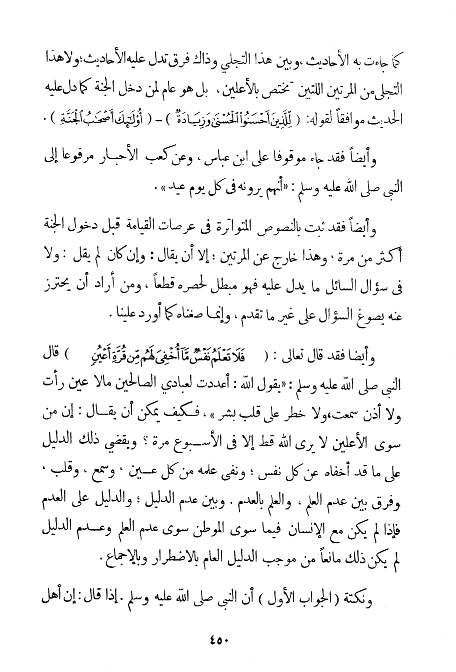 كَمَا جَاءَتْ بِهِ الْأَحَادِيثُ وَبَيْنَ هَذَا التَّجَلِّي وَذَاكَ فَرْقٌ تَدُلُّ عَلَيْهِ الْأَحَادِيثُ؛ وَلَا هَذَا التَّجَلِّي مِنْ الْمَرَّتَيْنِ اللَّتَيْنِ تَخْتَصُّ بِالْأَعْلَيْنَ بَلْ هُوَ عَامٌّ لِمَنْ دَخَلَ الْجَنَّةَ كَمَا دَلَّ عَلَيْهِ الْحَدِيثُ مُوَافِقًا لِقَوْلِهِ: {لِلَّذِينَ أَحْسَنُوا الْحُسْنَى وَزِيَادَةٌ} - {أُولَئِكَ أَصْحَابُ الْجَنَّةِ} . وَأَيْضًا فَقَدْ جَاءَ مَوْقُوفًا عَلَى ابْنِ عَبَّاسٍ وَعَنْ كَعْبِ الْأَحْبَارِ مَرْفُوعًا إلَى النَّبِيِّ صَلَّى اللَّهُ عَلَيْهِ وَسَلَّمَ {أَنَّهُمْ يَرَوْنَهُ فِي كُلِّ يَوْمِ عِيدٍ} . وَأَيْضًا فَقَدْ ثَبَتَ بِالنُّصُوصِ الْمُتَوَاتِرَةِ فِي عَرَصَاتِ الْقِيَامَةِ قَبْلَ دُخُولِ الْجَنَّةِ أَكْثَرَ مِنْ مَرَّةٍ وَهَذَا خَارِجٌ عَنْ الْمَرَّتَيْنِ؛ إلَّا أَنْ يُقَالَ: وَإِنْ كَانَ لَمْ يَقُلْ: وَلَا فِي سُؤَالِ السَّائِلِ مَا يَدُلُّ عَلَيْهِ فَهُوَ مُبْطِلٌ لِحَصْرِهِ قَطْعًا وَمَنْ أَرَادَ أَنْ يَحْتَرِزَ عَنْهُ يَصُوغُ السُّؤَالُ عَلَى غَيْرِ مَا تَقَدَّمَ وَإِنَّمَا صُغْنَاهُ كَمَا أُورِدَ عَلَيْنَا. وَأَيْضًا فَقَدْ قَالَ تَعَالَى: {فَلَا تَعْلَمُ نَفْسٌ مَا أُخْفِيَ لَهُمْ مِنْ قُرَّةِ أَعْيُنٍ} {قَالَ النَّبِيُّ صَلَّى اللَّهُ عَلَيْهِ وَسَلَّمَ يَقُولُ اللَّهُ: أَعْدَدْت لِعِبَادِي الصَّالِحِينَ مَا لَا عَيْنٌ رَأَتْ وَلَا أُذُنٌ سَمِعَتْ وَلَا خَطَرَ عَلَى قَلْبِ بَشَرٍ} فَكَيْفَ يُمْكِنُ أَنْ يُقَالَ: إنَّ مَنْ سِوَى الْأَعْلَيْنَ لَا يَرَى اللَّهَ قَطُّ إلَّا فِي الْأُسْبُوعِ مَرَّةً؟ وَيَقْضِي ذَلِكَ الدَّلِيلُ عَلَى مَا قَدْ أَخْفَاهُ عَنْ كُلِّ نَفْسٍ؛ وَنَفَى عِلْمَهُ مِنْ كُلِّ عَيْنٍ وَسَمْعٍ وَقَلْبٍ وَفَرَّقَ بَيْنَ عَدَمِ الْعِلْمِ وَالْعِلْمِ بِالْعَدَمِ. وَبَيْنَ عَدَمِ الدَّلِيلِ؛ وَالدَّلِيلِ عَلَى الْعَدَمِ فَإِذَا لَمْ يَكُنْ مَعَ الْإِنْسَانِ فِيمَا سِوَى الْمَوْطِنِ سِوَى عَدَمِ الْعِلْمِ وَعَدَمِ الدَّلِيلِ لَمْ يَكُنْ ذَلِكَ مَانِعًا مِنْ مُوجَبِ الدَّلِيلِ الْعَامِّ بِالِاضْطِرَارِ وَبِالْإِجْمَاعِ. وَنُكْتَةُ الْجَوَابِ الْأَوَّلِ أَنَّ النَّبِيَّ صَلَّى اللَّهُ عَلَيْهِ وَسَلَّمَ. إذَا قَالَ: إنَّ أَهْلَ