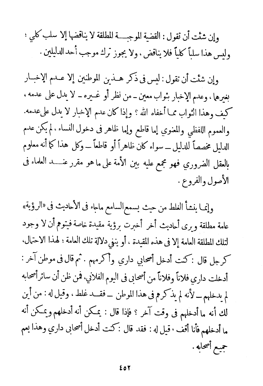وَإِنْ شِئْت أَنْ تَقُولَ: الْقَضِيَّةُ الْمُوجَبَةُ الْمُطْلَقَةُ لَا يُنَاقِضُهَا إلَّا سَلْبٌ كُلِّيٌّ؛ وَلَيْسَ هَذَا سَلْبًا كُلِّيًّا فَلَا يُنَاقِضُ وَلَا يَجُوزُ تَرْكُ مُوجَبِ أَحَدِ الدَّلِيلَيْنِ وَإِنْ شِئْت أَنْ تَقُولَ: لَيْسَ فِي ذِكْرِ هَذَيْنِ الْمَوْطِنَيْنِ إلَّا عَدَمُ الْإِخْبَارِ بِغَيْرِهِمَا وَعَدَمُ الْإِخْبَارِ بِثَوَابِ مُعَيَّنٍ - مِنْ نَظَرٍ أَوْ غَيْرِهِ - لَا يَدُلُّ عَلَى عَدَمِهِ كَيْفَ وَهَذَا الثَّوَابُ مِمَّا أَخْفَاهُ اللَّهُ؟ وَإِذَا كَانَ عَدَمُ الْإِخْبَارِ لَا يَدُلُّ عَلَى عَدَمِهِ. وَالْعُمُومُ اللَّفْظِيُّ وَالْمَعْنَوِيُّ إمَّا قَاطِعٌ وَإِمَّا ظَاهِرٌ فِي دُخُولِ النِّسَاءِ لَمْ يَكُنْ عَدَمُ الدَّلِيلِ مُخَصِّصًا لِلدَّلِيلِ - سَوَاءٌ كَانَ ظَاهِرًا أَوْ قَاطِعًا - وَكُلُّ هَذَا كَمَا أَنَّهُ مَعْلُومٌ بِالْعَقْلِ الضَّرُورِيِّ فَهُوَ مَجْمَعٌ عَلَيْهِ بَيْنَ الْأُمَّةِ عَلَى مَا هُوَ مُقَرَّرٌ عِنْدَ الْعُلَمَاءِ فِي الْأُصُولِ وَالْفُرُوعِ. وَإِنَّمَا يَنْشَأُ الْغَلَطُ مِنْ حَيْثُ يَسْمَعُ السَّامِعُ مَا جَاءَ فِي الْأَحَادِيثِ فِي " الرُّؤْيَةِ " عَامَّةً مُطْلَقَةً وَيَرَى أَحَادِيثَ أُخَرَ أَخْبَرَتْ بِرُؤْيَةِ مُقَيَّدَةٍ خَاصَّةٍ فَيُتَوَهَّمُ أَنْ لَا وُجُودَ لِتِلْكَ الْمُطْلَقَةِ الْعَامَّةِ إلَّا فِي هَذِهِ الْمُقَيَّدَةِ أَوْ يَنْفِي دَلَالَةَ تِلْكَ الْعَامَّةِ؛ لِهَذَا الِاحْتِمَالِ كَرَجُلِ قَالَ: كُنْت أُدْخِلُ أَصْحَابِي دَارِي وَأُكْرِمُهُمْ. ثُمَّ قَالَ فِي مَوْطِنٍ آخَرَ: أَدْخَلْت دَارِي فُلَانًا وَفُلَانًا مِنْ أَصْحَابِي فِي الْيَوْمِ الْفُلَانِيِّ فَمَنْ ظَنَّ أَنَّ سَائِرَ أَصْحَابِهِ لَمْ يُدْخِلْهُمْ - لِأَنَّهُ لَمْ يَذْكُرْهُمْ فِي هَذَا الْمَوْطِنِ - فَقَدْ غَلِطَ وَقِيلَ لَهُ: مِنْ أَيْنَ لَك أَنَّهُ مَا أَدْخَلَهُمْ فِي وَقْتٍ آخَرَ؟ فَإِذَا قَالَ: يُمْكِنُ أَنَّهُ أَدْخَلَهُمْ وَيُمْكِنُ أَنَّهُ مَا أَدْخَلَهُمْ فَأَنَا أَقِفُ قِيلَ لَهُ: فَقَدْ قَالَ: كُنْت أُدْخِلُ أَصْحَابِي دَارِي وَهَذَا يَعُمُّ جَمِيعَ أَصْحَابِهِ.