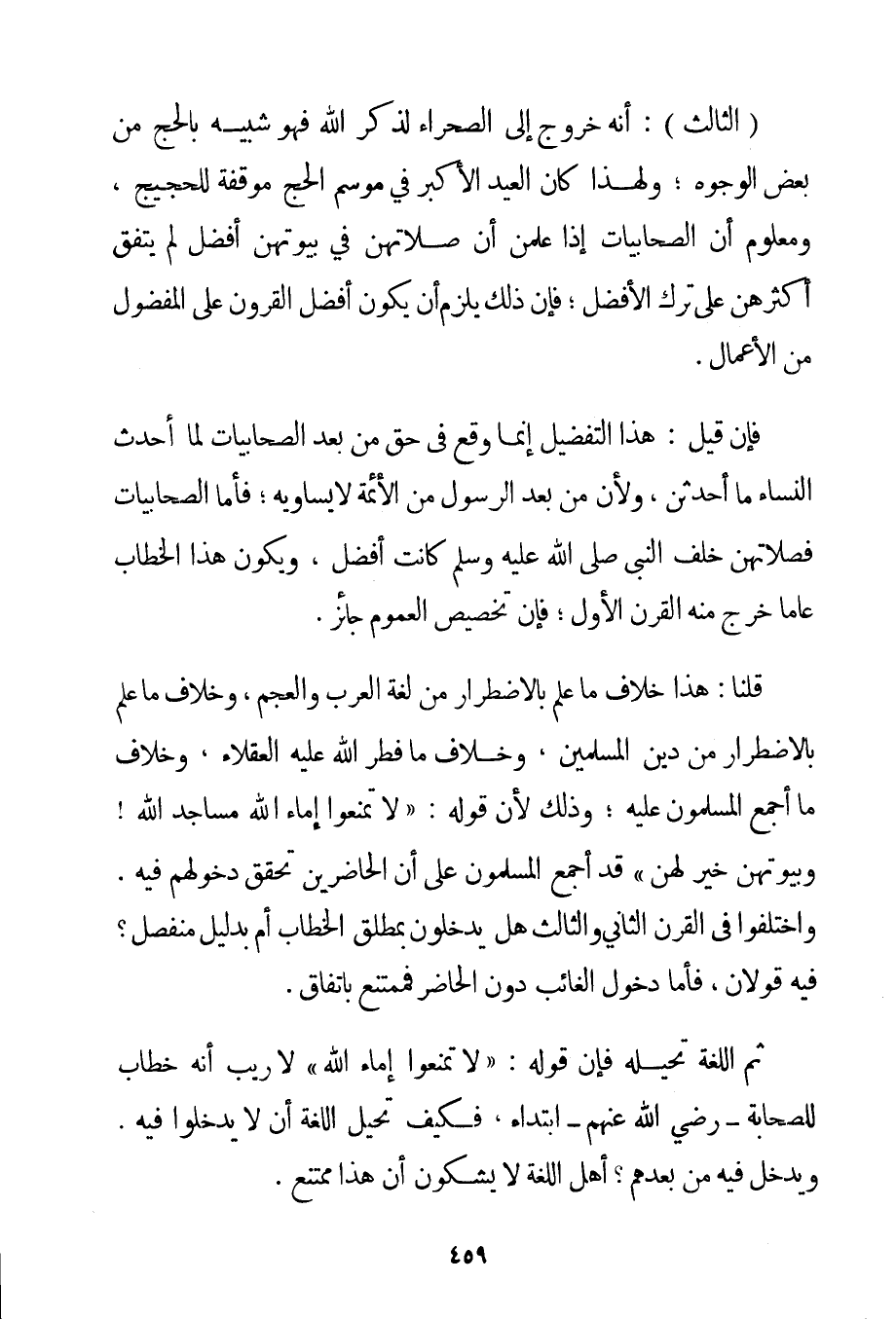 الثَّالِثُ: أَنَّهُ خُرُوجٌ إلَى الصَّحْرَاءِ لِذِكْرِ اللَّهِ فَهُوَ شَبِيهٌ بِالْحَجِّ مِنْ بَعْضِ الْوُجُوهِ؛ وَلِهَذَا كَانَ الْعِيدُ الْأَكْبَرُ فِي مَوْسِمِ الْحَجِّ موقفة لِلْحَجِيجِ وَمَعْلُومٌ أَنَّ الصَّحَابِيَّاتِ إذَا عَلِمْنَ أَنَّ صَلَاتَهُنَّ فِي بُيُوتِهِنَّ أَفْضَلُ لَمْ يَتَّفِقْ أَكْثَرُهُنَّ عَلَى تَرْكِ الْأَفْضَلِ؛ فَإِنَّ ذَلِكَ يَلْزَمُ أَنْ يَكُونَ أَفْضَلُ الْقُرُونِ عَلَى الْمَفْضُولِ مِنْ الْأَعْمَالِ. فَإِنْ قِيلَ: هَذَا التَّفْضِيلُ إنَّمَا وَقَعَ فِي حَقِّ مَنْ بَعْدَ الصَّحَابِيَّاتِ لَمَّا أَحْدَثَ النِّسَاءُ مَا أَحْدَثْنَ وَلِأَنَّ مَنْ بَعْدَ الرَّسُولِ مِنْ الْأَئِمَّةِ لَا يُسَاوِيهِ؛ فَأَمَّا الصَّحَابِيَّاتُ فَصَلَاتُهُنَّ خَلْفَ النَّبِيِّ صَلَّى اللَّهُ عَلَيْهِ وَسَلَّمَ كَانَتْ أَفْضَلَ وَيَكُونُ هَذَا الْخِطَابُ عَامًّا خَرَجَ مِنْهُ الْقَرْنُ الْأَوَّلُ؛ فَإِنَّ تَخْصِيصَ الْعُمُومِ جَائِزٌ. قُلْنَا: هَذَا خِلَافُ مَا عُلِمَ بِالِاضْطِرَارِ مِنْ لُغَةِ الْعَرَبِ وَالْعَجَمِ وَخِلَافُ مَا عُلِمَ بِالِاضْطِرَارِ مِنْ دِينِ الْمُسْلِمِينَ وَخِلَافُ مَا فَطَرَ اللَّهُ عَلَيْهِ الْعُقَلَاءَ وَخِلَافُ مَا أَجْمَعَ الْمُسْلِمُونَ عَلَيْهِ؛ وَذَلِكَ لِأَنَّ قَوْلَهُ: {لَا تَمْنَعُوا إمَاءَ اللَّهِ مَسَاجِدَ اللَّهِ وَبُيُوتُهُنَّ خَيْرٌ لَهُنَّ} قَدْ أَجْمَعَ الْمُسْلِمُونَ عَلَى أَنَّ الْحَاضِرِينَ تَحَقَّقَ دُخُولُهُمْ فِيهِ. وَاخْتَلَفُوا فِي الْقَرْنِ الثَّانِي وَالثَّالِثِ هَلْ يَدْخُلُونَ بِمُطْلَقِ الْخِطَابِ أَمْ بِدَلِيلِ مُنْفَصِلٍ؟ فِيهِ قَوْلَانِ فَأَمَّا دُخُولُ الْغَائِبِ دُونَ الْحَاضِرِ فَمُمْتَنِعٌ بِاتِّفَاقِ. ثُمَّ اللُّغَةُ تُحِيلُهُ فَإِنَّ قَوْلَهُ: {لَا تَمْنَعُوا إمَاءَ اللَّهِ} لَا رَيْبَ أَنَّهُ خِطَابٌ لِلصَّحَابَةِ - رَضِيَ اللَّهُ عَنْهُمْ - ابْتِدَاءً فَكَيْفَ تُحِيلُ اللُّغَةُ أَنْ لَا يَدْخُلُوا فِيهِ. وَيَدْخُلُ فِيهِ مَنْ بَعْدَهُمْ؟ أَهْلُ اللُّغَةِ لَا يَشُكُّونَ أَنَّ هَذَا مُمْتَنِعٌ.