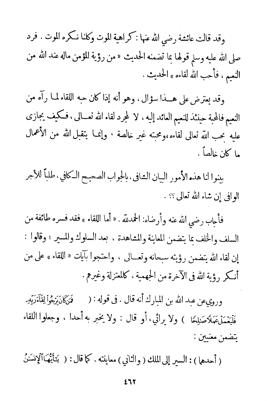الْحَمْدُ لِلَّهِ، " أَمَّا اللِّقَاءُ " فَقَدْ فَسَّرَهُ طَائِفَة مِنْ السَّلَفِ وَالْخَلَفِ بِمَا يَتَضَمَّنُ الْمُعَايَنَةَ وَالْمُشَاهَدَةَ بَعْدَ السُّلُوكِ وَالْمَسِيرِ؛ وَقَالُوا: إنَّ لِقَاءَ اللَّهِ يَتَضَمَّنُ رُؤْيَتَهُ سُبْحَانَهُ وَتَعَالَى وَاحْتَجُّوا بِآيَاتِ " اللِّقَاءِ " عَلَى مَنْ أَنْكَرَ رُؤْيَةَ اللَّهِ فِي الْآخِرَةِ مِنْ الْجَهْمِيَّة كَالْمُعْتَزِلَةِ وَغَيْرِهِمْ. وَرُوِيَ عَنْ عَبْدِ اللَّهِ بْنِ الْمُبَارَكِ أَنَّهُ قَالَ. فِي قَوْلِهِ: {فَمَنْ كَانَ يَرْجُوا لِقَاءَ رَبِّهِ فَلْيَعْمَلْ عَمَلًا صَالِحًا وَلَا يُشْرِكْ بِعِبَادَةِ رَبِّهِ أَحَدًا} وَلَا يُرَائِي أَوْ قَالَ: وَلَا يُخْبِرُ بِهِ أَحَدًا وَجَعَلُوا اللِّقَاءَ يَتَضَمَّنُ مَعْنَيَيْنِ: أَحَدُهُمَا: السَّيْرُ إلَى الْمَلِكِ وَالثَّانِي مُعَايَنَتُهُ. كَمَا قَالَ: {يَا أَيُّهَا الْإِنْسَانُ