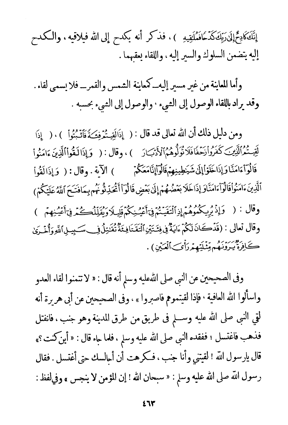إنَّكَ كَادِحٌ إلَى رَبِّكَ كَدْحًا فَمُلَاقِيهِ} فَذَكَرَ أَنَّهُ يَكْدَحُ إلَى اللَّهِ فَيُلَاقِيهِ وَالْكَدْحُ إلَيْهِ يَتَضَمَّنُ السُّلُوكَ وَالسَّيْرَ إلَيْهِ وَاللِّقَاءُ يَعْقُبُهُمَا. وَأَمَّا الْمُعَايَنَةُ مِنْ غَيْرِ مَسِيرٍ إلَيْهِ - كَمُعَايَنَةِ الشَّمْسِ وَالْقَمَرِ - فَلَا يُسَمَّى لِقَاءً. وَقَدْ يُرَادُ بِاللِّقَاءِ الْوُصُولُ إلَى الشَّيْءِ وَالْوُصُولُ إلَى الشَّيْءِ بِحَسَبِهِ. وَمِنْ دَلِيلِ ذَلِكَ أَنَّ اللَّهَ تَعَالَى قَدْ قَالَ: {إذَا لَقِيتُمْ فِئَةً فَاثْبُتُوا} {إذَا لَقِيتُمُ الَّذِينَ كَفَرُوا زَحْفًا فَلَا تُوَلُّوهُمُ الْأَدْبَارَ} وَقَالَ: {وَإِذَا لَقُوا الَّذِينَ آمَنُوا قَالُوا آمَنَّا وَإِذَا خَلَوْا إلَى شَيَاطِينِهِمْ قَالُوا إنَّا مَعَكُمْ} الْآيَةَ. وَقَالَ: {وَإِذَا لَقُوا الَّذِينَ آمَنُوا قَالُوا آمَنَّا وَإِذَا خَلَا بَعْضُهُمْ إلَى بَعْضٍ قَالُوا أَتُحَدِّثُونَهُمْ بِمَا فَتَحَ اللَّهُ عَلَيْكُمْ} وَقَالَ: {وَإِذْ يُرِيكُمُوهُمْ إذِ الْتَقَيْتُمْ فِي أَعْيُنِكُمْ قَلِيلًا وَيُقَلِّلُكُمْ فِي أَعْيُنِهِمْ} . وَقَالَ تَعَالَى: {قَدْ كَانَ لَكُمْ آيَةٌ فِي فِئَتَيْنِ الْتَقَتَا فِئَةٌ تُقَاتِلُ فِي سَبِيلِ اللَّهِ وَأُخْرَى كَافِرَةٌ يَرَوْنَهُمْ مِثْلَيْهِمْ رَأْيَ الْعَيْنِ} . وَفِي الصَّحِيحَيْنِ عَنْ النَّبِيِّ صَلَّى اللَّهُ عَلَيْهِ وَسَلَّمَ أَنَّهُ قَالَ: {لَا تَتَمَنَّوْا لِقَاءَ الْعَدُوِّ وَاسْأَلُوا اللَّهَ الْعَافِيَةَ فَإِذَا لَقِيتُمُوهُمْ فَاصْبِرُوا} وَفِي الصَّحِيحَيْنِ {عَنْ أَبِي هُرَيْرَةَ أَنَّهُ لَقِيَ النَّبِيَّ صَلَّى اللَّهُ عَلَيْهِ وَسَلَّمَ فِي طَرِيقٍ مِنْ طُرُقِ الْمَدِينَةِ وَهُوَ جُنُبٌ فَانْفَتَلَ فَذَهَبَ فَاغْتَسَلَ؛ فَفَقَدَهُ النَّبِيُّ صَلَّى اللَّهُ عَلَيْهِ وَسَلَّمَ فَلَمَّا جَاءَ قَالَ: أَيْنَ كُنْت؟ قَالَ يَا رَسُولَ اللَّهِ لَقِيتَنِي وَأَنَا جُنُبٌ فَكَرِهْت أَنْ أُجَالِسَك حَتَّى أَغْتَسِلَ. فَقَالَ رَسُولُ اللَّهِ صَلَّى اللَّهُ عَلَيْهِ وَسَلَّمَ سُبْحَانَ اللَّهِ إنَّ الْمُؤْمِنَ لَا يَنْجُسُ} وَفِي لَفْظٍ: