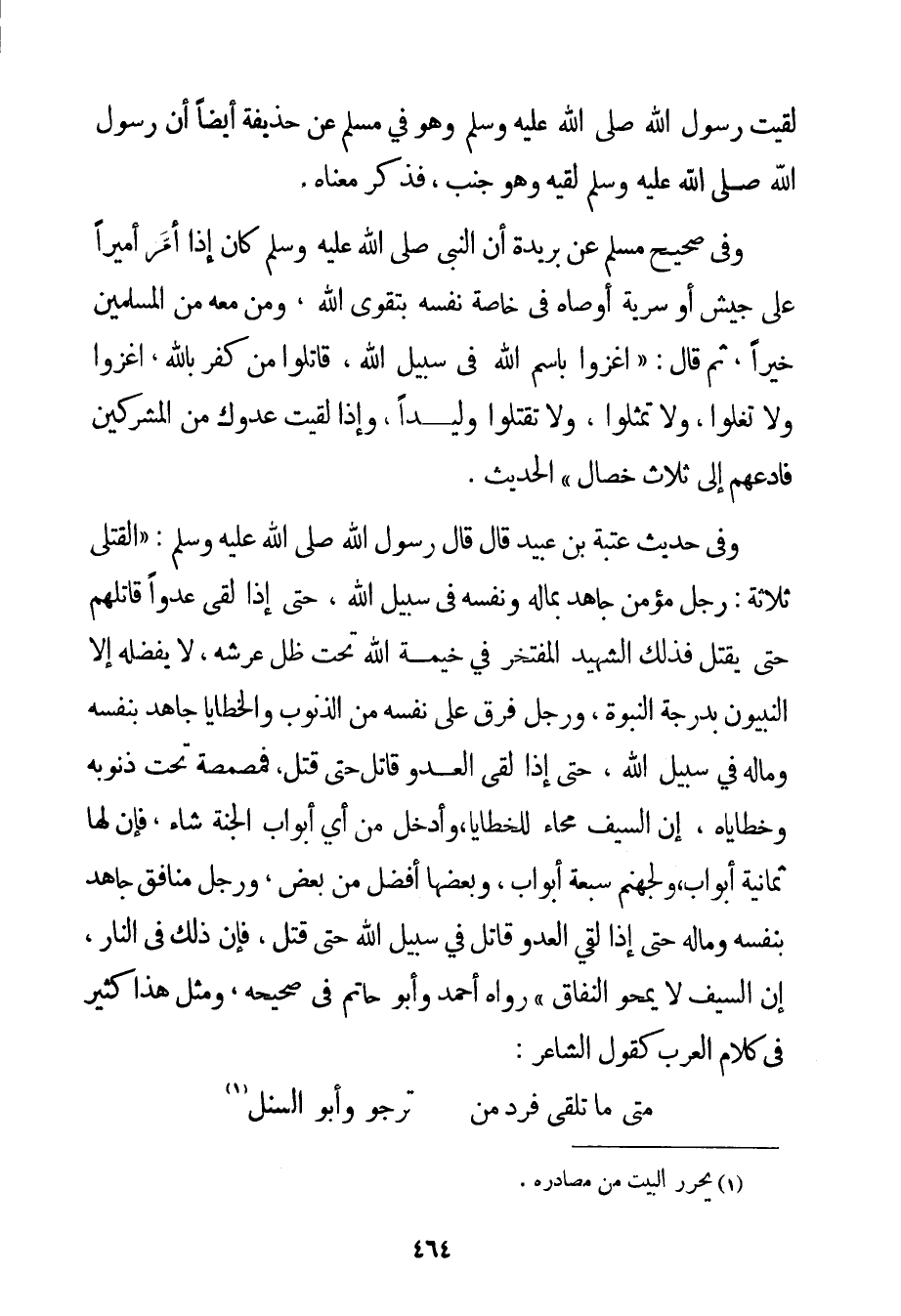 {لَقِيت رَسُولَ اللَّهِ صَلَّى اللَّهُ عَلَيْهِ وَسَلَّمَ} وَهُوَ فِي مُسْلِمٍ عَنْ حُذَيْفَةَ أَيْضًا {أَنَّ رَسُولَ اللَّهِ صَلَّى اللَّهُ عَلَيْهِ وَسَلَّمَ لَقِيَهُ وَهُوَ جُنُبٌ فَذَكَرَ مَعْنَاهُ} . وَفِي صَحِيحِ مُسْلِمٍ عَنْ بريدة {أَنَّ النَّبِيَّ صَلَّى اللَّهُ عَلَيْهِ وَسَلَّمَ كَانَ إذَا أَمَّرَ أَمِيرًا عَلَى جَيْشٍ أَوْ سَرِيَّةٍ أَوْصَاهُ فِي خَاصَّةِ نَفْسِهِ بِتَقْوَى اللَّهِ وَمَنْ مَعَهُ مِنْ الْمُسْلِمِينَ خَيْرًا ثُمَّ قَالَ: اُغْزُوا بِاسْمِ اللَّهِ فِي سَبِيلِ اللَّهِ قَاتِلُوا مَنْ كَفَرَ بِاَللَّهِ اُغْزُوا وَلَا تَغْلُوا وَلَا تُمَثِّلُوا وَلَا تَقْتُلُوا وَلِيدًا وَإِذَا لَقِيت عَدُوَّك مِنْ الْمُشْرِكِينَ فَادْعُهُمْ إلَى ثَلَاثِ خِصَالٍ} الْحَدِيثَ. وَفِي حَدِيثِ عتبة بْنِ عُبَيْدٍ قَالَ قَالَ رَسُولُ اللَّهِ صَلَّى اللَّهُ عَلَيْهِ وَسَلَّمَ {الْقَتْلَى ثَلَاثَةٌ: رَجُلٌ مُؤْمِنٌ جَاهَدَ بِمَالِهِ وَنَفْسِهِ فِي سَبِيلِ اللَّهِ حَتَّى إذَا لَقِيَ عَدُوًّا قَاتَلَهُمْ حَتَّى يُقْتَلَ فَذَلِكَ الشَّهِيدُ الْمُفْتَخِرُ فِي خَيْمَةِ اللَّهِ تَحْتَ ظِلِّ عَرْشِهِ لَا يَفْضُلُهُ إلَّا النَّبِيُّونَ بِدَرَجَةِ النُّبُوَّةِ وَرَجُلٌ فَرَقَّ عَلَى نَفْسِهِ مِنْ الذُّنُوبِ وَالْخَطَايَا جَاهَدَ بِنَفْسِهِ وَمَالِهِ فِي سَبِيلِ اللَّهِ حَتَّى إذَا لَقِيَ الْعَدُوَّ قَاتَلَ حَتَّى قُتِلَ فَمَصْمَصَةٌ تَحْتَ ذُنُوبِهِ وَخَطَايَاهُ إنَّ السَّيْفَ مَحَّاءٌ لِلْخَطَايَا وَأُدْخِلَ مِنْ أَيِّ أَبْوَابِ الْجَنَّةِ شَاءَ فَإِنَّ لَهَا ثَمَانِيَةَ أَبْوَابٍ وَلِجَهَنَّمَ سَبْعَةُ أَبْوَابٍ وَبَعْضُهَا أَفْضَلُ مِنْ بَعْضٍ وَرَجُلٌ مُنَافِقٌ جَاهَدَ بِنَفْسِهِ وَمَالِهِ حَتَّى إذَا لَقِيَ الْعَدُوَّ قَاتَلَ فِي سَبِيلِ اللَّهِ حَتَّى قُتِلَ فَإِنَّ ذَلِكَ فِي النَّارِ إنَّ السَّيْفَ لَا يَمْحُو النِّفَاقَ} رَوَاهُ أَحْمَد وَأَبُو حَاتِمٍ فِي صَحِيحِهِ وَمِثْلُ هَذَا كَثِيرٌ فِي كَلَامِ الْعَرَبِ كَقَوْلِ الشَّاعِرِ: مَتَى مَا تَلْقَى فَرُدَّ مَنْ ... تَرْجُو وَأَبُو السنل