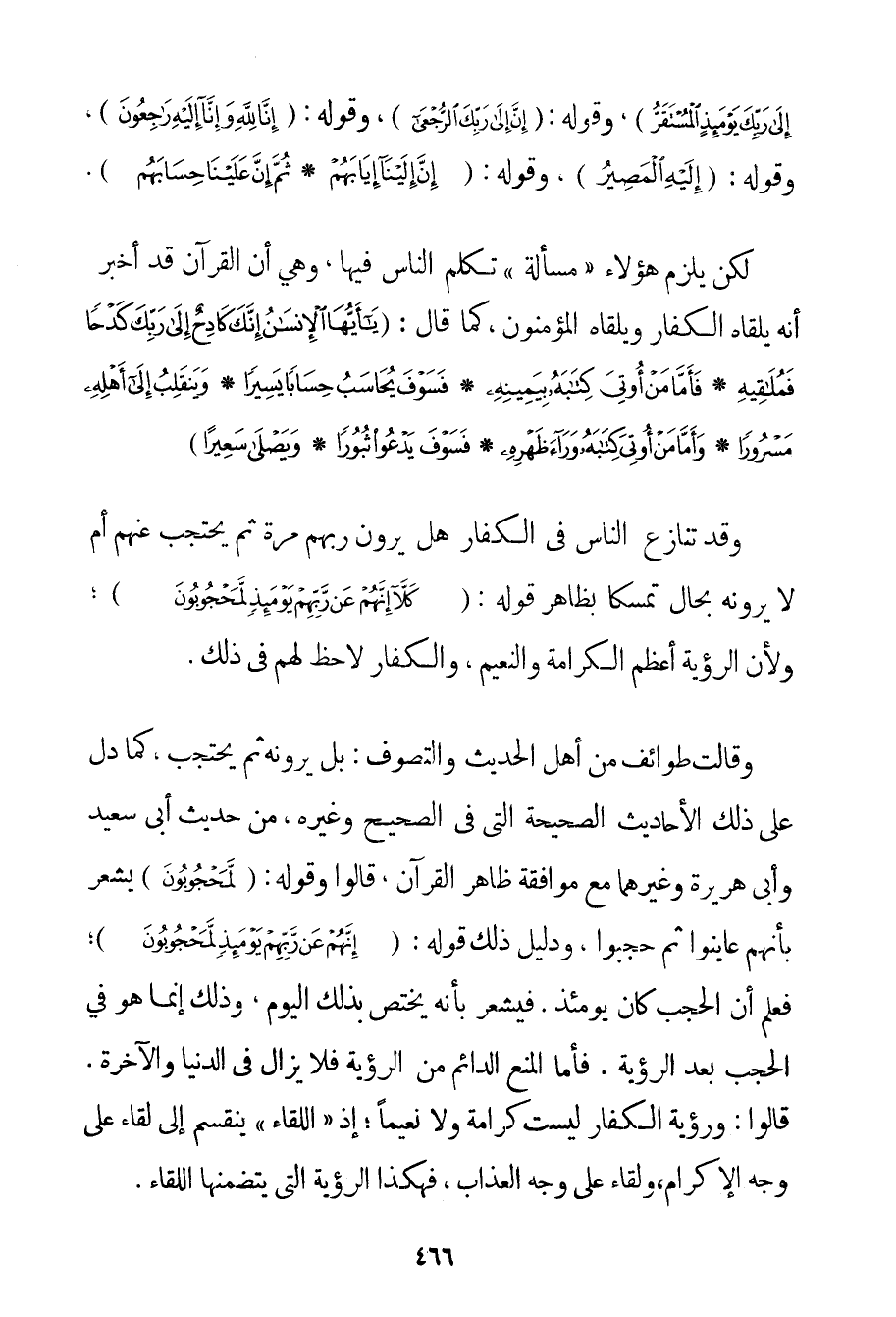 وَزَرَ} {إلَى رَبِّكَ يَوْمَئِذٍ الْمُسْتَقَرُّ} وَقَوْلُهُ: {إنَّ إلَى رَبِّكَ الرُّجْعَى} وَقَوْلُهُ: {إنَّا لِلَّهِ وَإِنَّا إلَيْهِ رَاجِعُونَ} وَقَوْلُهُ: {إلَيْهِ الْمَصِيرُ} وَقَوْلُهُ: {إنَّ إلَيْنَا إيَابَهُمْ} {ثُمَّ إنَّ عَلَيْنَا حِسَابَهُمْ} . لَكِنْ يَلْزَمُ هَؤُلَاءِ " مَسْأَلَةٌ " تَكَلَّمَ النَّاسُ فِيهَا وَهِيَ أَنَّ الْقُرْآنَ قَدْ أَخْبَرَ أَنَّهُ يَلْقَاهُ الْكُفَّارُ وَيَلْقَاهُ الْمُؤْمِنُونَ كَمَا قَالَ: {يَا أَيُّهَا الْإِنْسَانُ إنَّكَ كَادِحٌ إلَى رَبِّكَ كَدْحًا فَمُلَاقِيهِ} {فَأَمَّا مَنْ أُوتِيَ كِتَابَهُ بِيَمِينِهِ} {فَسَوْفَ يُحَاسَبُ حِسَابًا يَسِيرًا} {وَيَنْقَلِبُ إلَى أَهْلِهِ مَسْرُورًا} {وَأَمَّا مَنْ أُوتِيَ كِتَابَهُ وَرَاءَ ظَهْرِهِ} {فَسَوْفَ يَدْعُو ثُبُورًا} {وَيَصْلَى سَعِيرًا} وَقَدْ تَنَازَعَ النَّاسُ فِي الْكُفَّارِ هَلْ يَرَوْنَ رَبَّهُمْ مَرَّةً ثُمَّ يَحْتَجِبُ عَنْهُمْ أَمْ لَا يَرَوْنَهُ بِحَالِ تَمَسُّكًا بِظَاهِرِ قَوْلِهِ: {كَلَّا إنَّهُمْ عَنْ رَبِّهِمْ يَوْمَئِذٍ لَمَحْجُوبُونَ} وَلِأَنَّ الرُّؤْيَةَ أَعْظَمُ الْكَرَامَةِ وَالنَّعِيمِ وَالْكُفَّارُ لَا حَظَّ لَهُمْ فِي ذَلِكَ.