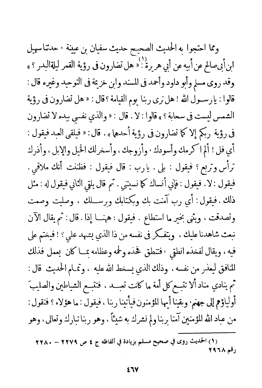قَالُوا: وَرُؤْيَةُ الْكُفَّارِ لَيْسَتْ كَرَامَةً وَلَا نَعِيمًا؛ إذْ " اللِّقَاءُ " يَنْقَسِمُ إلَى لِقَاءٍ عَلَى وَجْهِ الْإِكْرَامِ وَلِقَاءٍ عَلَى وَجْهِ الْعَذَابِ فَهَكَذَا الرُّؤْيَةُ الَّتِي يَتَضَمَّنُهَا اللِّقَاءُ. وَمِمَّا احْتَجُّوا بِهِ الْحَدِيثُ الصَّحِيحُ حَدِيثُ سُفْيَانَ بْنِ عُيَيْنَة حَدَّثَنَا سُهَيْلُ بْنُ أَبِي صَالِحٍ عَنْ أَبِيهِ عَنْ أَبِي هُرَيْرَةَ: {هَلْ تُضَارُّونَ فِي رُؤْيَةِ الْقَمَرِ لَيْلَةَ الْبَدْرِ؟} وَقَدْ رَوَى مُسْلِمٌ وَأَبُو دَاوُد وَأَحْمَد فِي الْمُسْنَدِ وَابْنُ خُزَيْمَة فِي التَّوْحِيدِ وَغَيْرِهِ قَالَ: {قَالُوا: يَا رَسُولَ اللَّهِ هَلْ نَرَى رَبَّنَا يَوْمَ الْقِيَامَةِ؟ قَالَ: هَلْ تُضَارُّونَ فِي رُؤْيَةِ الشَّمْسِ لَيْسَتْ فِي سَحَابَةٍ؟ قَالُوا: لَا. قَالَ: وَاَلَّذِي نَفْسِي بِيَدِهِ لَا تُضَارُّونَ فِي رُؤْيَةِ رَبِّكُمْ إلَّا كَمَا تُضَارُّونَ فِي رُؤْيَةِ أَحَدِهِمَا. قَالَ: فَيَلْقَى الْعَبْدُ فَيَقُولُ: أَيْ فل أَلَمْ أُكْرِمْك وَأُسَوِّدْك وَأُزَوِّجْك وَأُسَخِّرْ لَك الْخَيْلَ وَالْإِبِلَ وَأَذَرْك تَرْأَسُ وَتَرْبَعُ؟ فَيَقُولُ: بَلَى. يَا رَبِّ: قَالَ فَيَقُولُ: فَظَنَنْت أَنَّك مُلَاقِيَّ. فَيَقُولُ: لَا. فَيَقُولُ: فَإِنِّي أَنْسَاك كَمَا نَسِيتنِي. ثُمَّ قَالَ يَلْقَى الثَّانِيَ فَيَقُولُ لَهُ: مِثْلَ ذَلِكَ. فَيَقُولُ: أَيْ رَبِّ آمَنْت بِك وَبِكِتَابِك وَبِرُسُلِك وَصَلَّيْت وَصُمْت وَتَصَدَّقْت وَيُثْنِي بِخَيْرِ مَا اسْتَطَاعَ. فَيَقُولُ: هَاهُنَا إذًا. قَالَ: ثُمَّ يُقَالُ الْآنَ نَبْعَثُ شَاهِدَنَا عَلَيْك وَيَتَفَكَّرُ فِي نَفْسِهِ مَنْ ذَا الَّذِي يَشْهَدُ عَلَيَّ فَيُخْتَمُ عَلَى فِيهِ وَيُقَالُ لِفَخْذِهِ انْطِقِي؛ فَتَنْطِقُ فَخِذُهُ وَلَحْمُهُ وَعِظَامُهُ بِمَا كَانَ يَعْمَلُ فَذَلِكَ الْمُنَافِقُ لِيُعْذَرَ مِنْ نَفْسِهِ وَذَلِكَ الَّذِي يَسْخَطُ اللَّهُ عَلَيْهِ وَتَمَامُ الْحَدِيثِ قَالَ: ثُمَّ يُنَادِي مُنَادٍ أَلَا تَتَّبِعُ كُلُّ أُمَّةٍ مَا كَانَتْ تَعْبُدُ فَتَتَّبِعُ الشَّيَاطِينَ وَالصَّلِيبَ أَوْلِيَاؤُهُمْ إلَى جَهَنَّمَ وَبَقِينَا أَيُّهَا الْمُؤْمِنُونَ فَيَأْتِينَا رَبُّنَا فَيَقُولُ: مَا هَؤُلَاءِ؟ فَنَقُولُ: مِنْ عِبَادِ اللَّهِ الْمُؤْمِنِينَ آمَنَّا بِرَبِّنَا وَلَمْ نُشْرِكْ بِهِ شَيْئًا وَهُوَ رَبُّنَا تَبَارَكَ وَتَعَالَى وَهُوَ