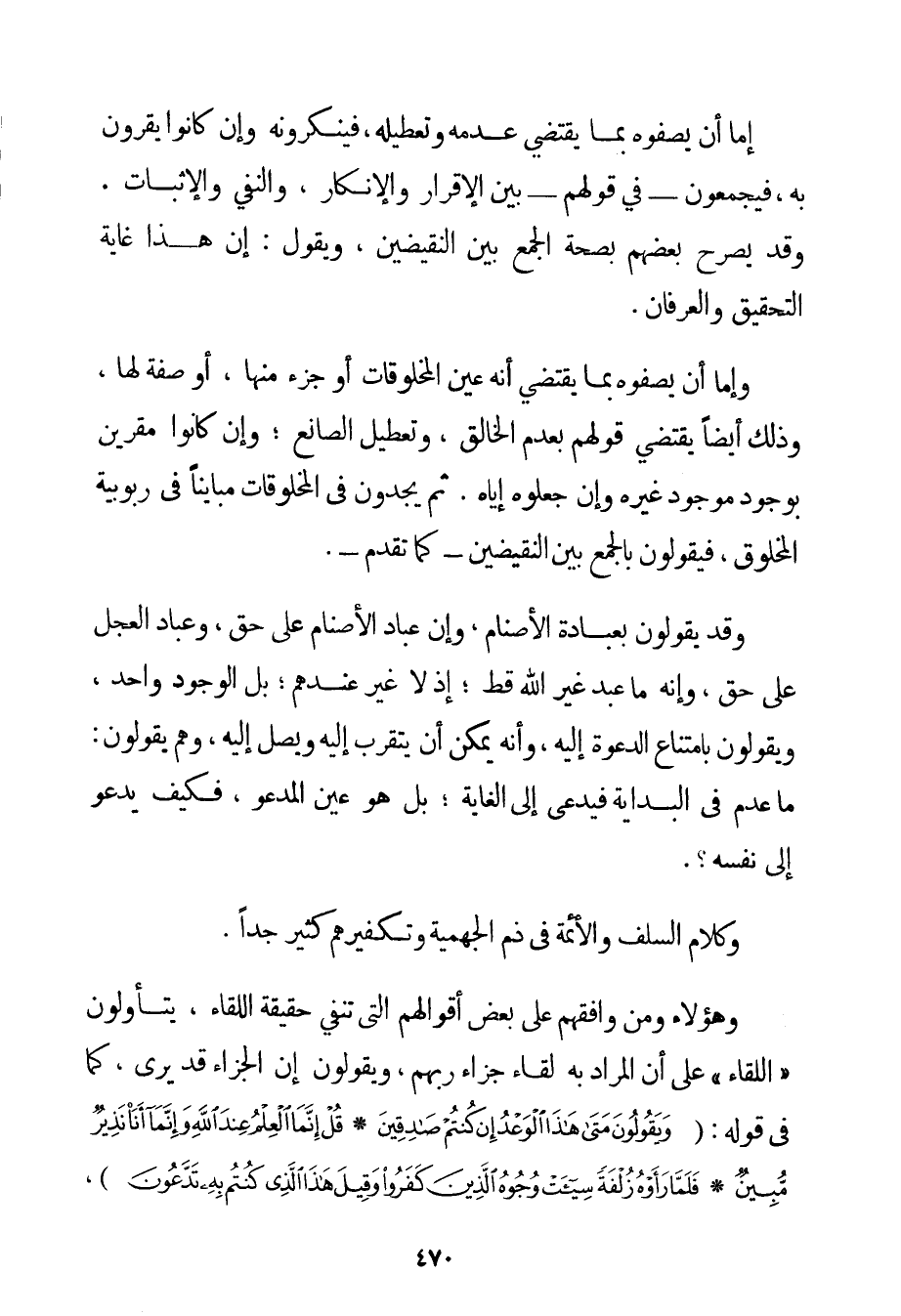 أَمْرَيْنِ: إمَّا أَنْ يَصِفُوهُ بِمَا يَقْتَضِي عَدَمَهُ وَتَعْطِيلَهُ فَيُنْكِرُونَهُ وَإِنْ كَانُوا يُقِرُّونَ بِهِ فَيَجْمَعُونَ - فِي قَوْلِهِمْ - بَيْنَ الْإِقْرَارِ وَالْإِنْكَارِ وَالنَّفْيِ وَالْإِثْبَاتِ. وَقَدْ يُصَرِّحُ بَعْضُهُمْ بِصِحَّةِ الْجَمْعِ بَيْنَ النَّقِيضَيْنِ وَيَقُولُ: إنَّ هَذَا غَايَةُ التَّحْقِيقِ وَالْعِرْفَانِ. وَإِمَّا أَنْ يَصِفُوهُ بِمَا يَقْتَضِي أَنَّهُ عَيْنُ الْمَخْلُوقَاتِ أَوْ جُزْءٌ مِنْهَا أَوْ صِفَةٌ لَهَا وَذَلِكَ أَيْضًا يَقْتَضِي قَوْلَهُمْ بِعَدَمِ الْخَالِقِ وَتَعْطِيلِ الصَّانِعِ؛ وَإِنْ كَانُوا مُقِرِّينَ بِوُجُودِ مَوْجُودٍ غَيْرِهِ وَإِنْ جَعَلُوهُ إيَّاهُ. ثُمَّ يَجِدُونَ فِي الْمَخْلُوقَاتِ مُبَايِنًا فِي رُبُوبِيَّةِ الْمَخْلُوقِ فَيَقُولُونَ بِالْجَمْعِ بَيْنَ النَّقِيضَيْنِ - كَمَا تَقَدَّمَ -. وَقَدْ يَقُولُونَ بِعِبَادَةِ الْأَصْنَامِ وَإِنَّ عُبَّادَ الْأَصْنَامِ عَلَى حَقٍّ وَعُبَّادَ الْعِجْلِ عَلَى حَقٍّ وَإِنَّهُ مَا عُبِدَ غَيْرُ اللَّهِ قَطُّ؛ إذْ لَا غَيْرَ عِنْدَهُمْ؛ بَلْ الْوُجُودُ وَاحِدٌ وَيَقُولُونَ بِامْتِنَاعِ الدَّعْوَةِ إلَيْهِ وَأَنَّهُ يُمْكِنُ أَنْ يُتَقَرَّبَ إلَيْهِ وَيَصِلَ إلَيْهِ وَهُمْ يَقُولُونَ: مَا عُدِمَ فِي الْبِدَايَةِ فَيُدْعَى إلَى الْغَايَةِ؛ بَلْ هُوَ عَيْنُ الْمَدْعُوِّ فَكَيْفَ يَدْعُو إلَى نَفْسِهِ؟ . وَكَلَامُ السَّلَفِ وَالْأَئِمَّةِ فِي ذَمِّ الْجَهْمِيَّة وَتَكْفِيرِهِمْ كَثِيرٌ جِدًّا. وَهَؤُلَاءِ وَمَنْ وَافَقَهُمْ عَلَى بَعْضِ أَقْوَالِهِمْ الَّتِي تَنْفِي حَقِيقَةَ اللِّقَاءِ يَتَأَوَّلُونَ " اللِّقَاءَ " عَلَى أَنَّ الْمُرَادَ بِهِ لِقَاءُ جَزَاءِ رَبِّهِمْ وَيَقُولُونَ إنَّ الْجَزَاءَ قَدْ يُرَى كَمَا فِي قَوْلِهِ: {وَيَقُولُونَ مَتَى هَذَا الْوَعْدُ إنْ كُنْتُمْ صَادِقِينَ} {قُلْ إنَّمَا الْعِلْمُ عِنْدَ اللَّهِ وَإِنَّمَا أَنَا نَذِيرٌ مُبِينٌ} {فَلَمَّا رَأَوْهُ زُلْفَةً سِيئَتْ وُجُوهُ الَّذِينَ كَفَرُوا وَقِيلَ هَذَا الَّذِي