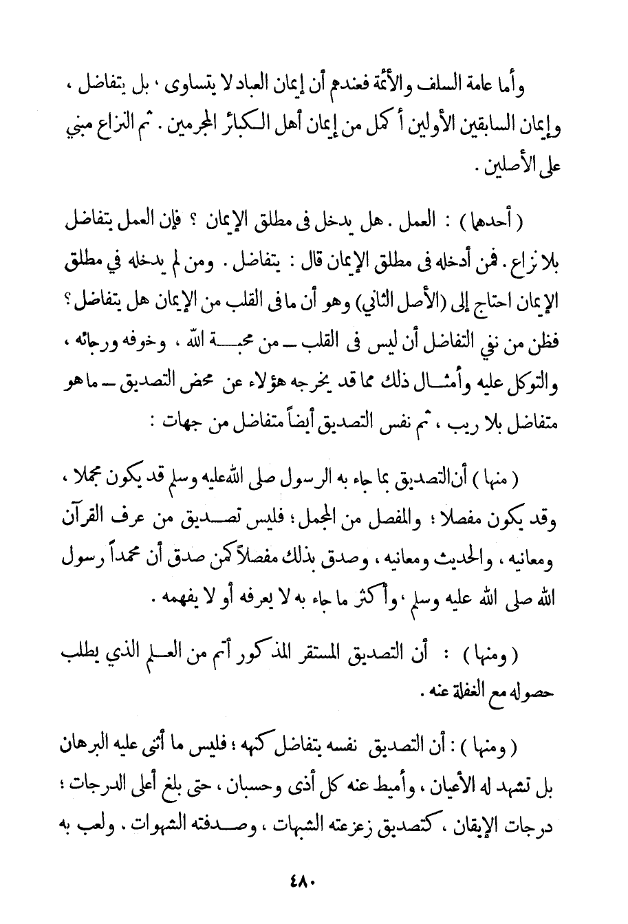 وَمَنْ لَمْ يُدْخِلْهُ فِي مُطْلَقِ الْإِيمَانِ احْتَاجَ إلَى الْأَصْلِ الثَّانِي وَهُوَ أَنَّ مَا فِي الْقَلْبِ مِنْ الْإِيمَانِ هَلْ يَتَفَاضَلُ؟ فَظَنَّ مَنْ نَفَى التَّفَاضُلَ أَنْ لَيْسَ فِي الْقَلْبِ - مِنْ مَحَبَّةِ اللَّهِ وَخَوْفِهِ وَرَجَائِهِ وَالتَّوَكُّلِ عَلَيْهِ وَأَمْثَالِ ذَلِكَ مِمَّا قَدْ يُخْرِجُهُ هَؤُلَاءِ عَنْ مَحْضِ التَّصْدِيقِ - مَا هُوَ مُتَفَاضِلٌ بِلَا رَيْبٍ ثُمَّ نَفْسُ التَّصْدِيقِ أَيْضًا مُتَفَاضِلٌ مِنْ جِهَاتٍ: