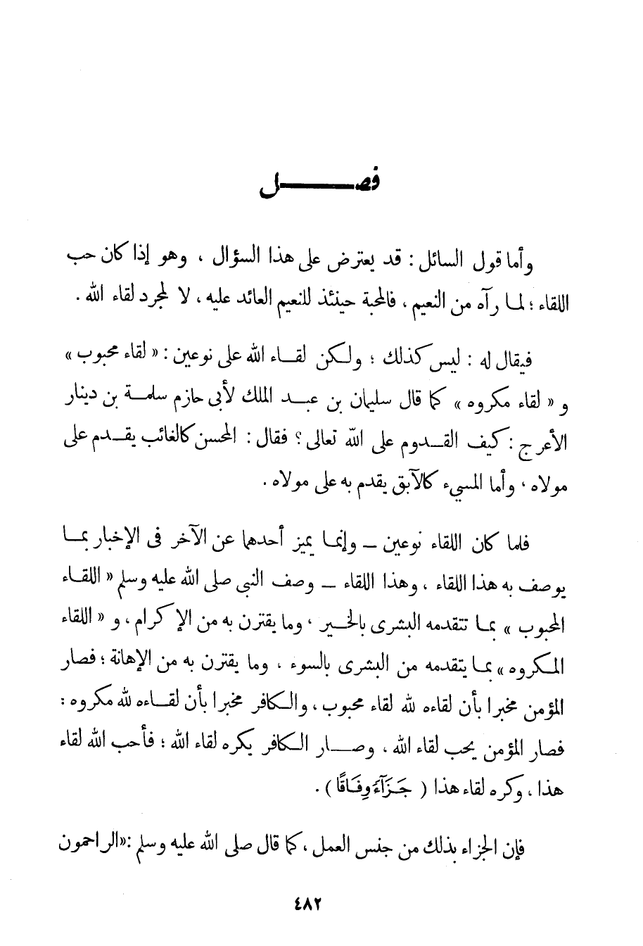 وَأَمَّا قَوْلُ السَّائِلِ: قَدْ يُعْتَرَضُ عَلَى هَذَا السُّؤَالِ وَهُوَ إذَا كَانَ حُبُّ اللِّقَاءِ؛ لِمَا رَآهُ مِنْ النَّعِيمِ فَالْمَحَبَّةُ حِينَئِذٍ لِلنَّعِيمِ الْعَائِدِ عَلَيْهِ لَا لِمُجَرَّدِ لِقَاءِ اللَّهِ. فَيُقَالُ لَهُ: لَيْسَ كَذَلِكَ؛ وَلَكِنَّ لِقَاءَ اللَّهِ عَلَى نَوْعَيْنِ: " لِقَاءِ مَحْبُوبٍ " وَ " لِقَاءِ مَكْرُوهٍ " كَمَا قَالَ سُلَيْمَانُ بْنُ عَبْدِ الْمَلِكِ لِأَبِي حَازِمٍ سَلَمَةَ بْنِ دِينَارٍ الْأَعْرَجِ: كَيْفَ الْقُدُومُ عَلَى اللَّهِ تَعَالَى؟ فَقَالَ: الْمُحْسِنُ كَالْغَائِبِ يَقْدَمُ عَلَى مَوْلَاهُ وَأَمَّا الْمُسِيءُ كَالْآبِقِ يُقْدَمُ بِهِ عَلَى مَوْلَاهُ. فَلَمَّا كَانَ اللِّقَاءُ نَوْعَيْنِ - وَإِنَّمَا يُمَيَّزُ أَحَدُهُمَا عَنْ الْآخَرِ فِي الْإِخْبَارِ بِمَا يُوصَفُ بِهِ هَذَا اللِّقَاءُ وَهَذَا اللِّقَاءُ - وَصَفَ النَّبِيُّ صَلَّى اللَّهُ عَلَيْهِ وَسَلَّمَ " اللِّقَاءَ الْمَحْبُوبَ " بِمَا تَتَقَدَّمُهُ الْبُشْرَى بِالْخَيْرِ وَمَا يَقْتَرِنُ بِهِ مِنْ الْإِكْرَامِ وَ " اللِّقَاءَ الْمَكْرُوهَ " بِمَا يَتَقَدَّمُهُ مِنْ الْبُشْرَى بِالسُّوءِ وَمَا يَقْتَرِنُ بِهِ مِنْ الْإِهَانَةِ؛ فَصَارَ الْمُؤْمِنُ مُخْبِرًا بِأَنَّ لِقَاءَهُ لِلَّهِ لِقَاءُ مَحْبُوبٍ وَالْكَافِرُ مُخْبَرًا بِأَنَّ لِقَاءَهُ لِلَّهِ مَكْرُوهٌ: فَصَارَ الْمُؤْمِنُ يُحِبُّ لِقَاءَ اللَّهِ وَصَارَ الْكَافِرُ يَكْرَهُ لِقَاءَ اللَّهِ؛ فَأَحَبَّ اللَّهُ لِقَاءَ هَذَا وَكَرِهَ لِقَاءَ هَذَا {جَزَاءً وِفَاقًا} . فَإِنَّ الْجَزَاءَ بِذَلِكَ مِنْ جِنْسِ الْعَمَلِ كَمَا قَالَ صَلَّى اللَّهُ عَلَيْهِ وَسَلَّمَ {الرَّاحِمُونَ