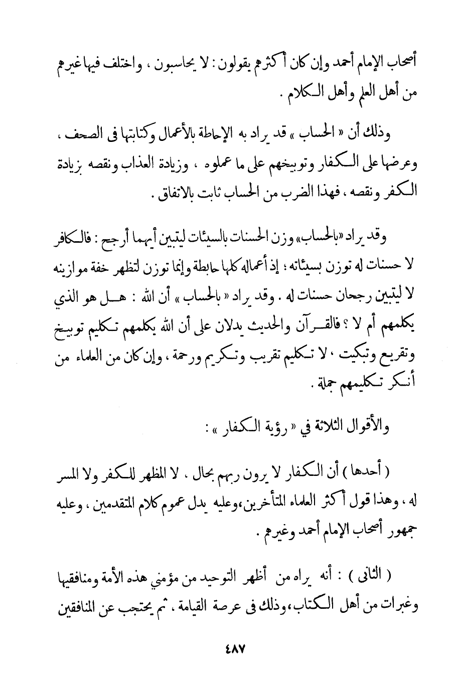 أَصْحَابُ الْإِمَامِ أَحْمَد وَإِنْ كَانَ أَكْثَرُهُمْ يَقُولُونَ: لَا يُحَاسَبُونَ وَاخْتَلَفَ فِيهَا غَيْرُهُمْ مِنْ أَهْلِ الْعِلْمِ وَأَهْلِ الْكَلَامِ. وَذَلِكَ أَنَّ " الْحِسَابَ " قَدْ يُرَادُ بِهِ الْإِحَاطَةُ بِالْأَعْمَالِ وَكِتَابَتُهَا فِي الصُّحُفِ وَعَرْضُهَا عَلَى الْكُفَّارِ وَتَوْبِيخُهُمْ عَلَى مَا عَمِلُوهُ وَزِيَادَةُ الْعَذَابِ وَنَقْصُهُ بِزِيَادَةِ الْكُفْرِ وَنَقْصِهِ فَهَذَا الضَّرْبُ مِنْ الْحِسَابِ ثَابِتٌ بِالِاتِّفَاقِ. وَقَدْ يُرَادُ " بِالْحِسَابِ " وَزْنُ الْحَسَنَاتِ بِالسَّيِّئَاتِ لِيَتَبَيَّنَ أَيُّهُمَا أَرْجَحُ: فَالْكَافِرُ لَا حَسَنَاتِ لَهُ تُوزَنُ بِسَيِّئَاتِهِ؛ إذْ أَعْمَالُهُ كُلُّهَا حَابِطَةٌ وَإِنَّمَا تُوزَنُ لِتَظْهَرَ خِفَّةُ مَوَازِينِهِ لَا لِيَتَبَيَّنَ رُجْحَانُ حَسَنَاتٍ لَهُ. وَقَدْ يُرَادُ " بِالْحِسَابِ " أَنَّ اللَّهَ: هَلْ هُوَ الَّذِي يُكَلِّمُهُمْ أَمْ لَا؟ فَالْقُرْآنُ وَالْحَدِيثُ يَدُلَّانِ عَلَى أَنَّ اللَّهَ يُكَلِّمُهُمْ تَكْلِيمَ تَوْبِيخٍ وَتَقْرِيعٍ وَتَبْكِيتٍ لَا تَكْلِيمَ تَقْرِيبٍ وَتَكْرِيمٍ وَرَحْمَةٍ وَإِنْ كَانَ مِنْ الْعُلَمَاءِ مَنْ أَنْكَرَ تَكْلِيمَهُمْ جُمْلَةً.