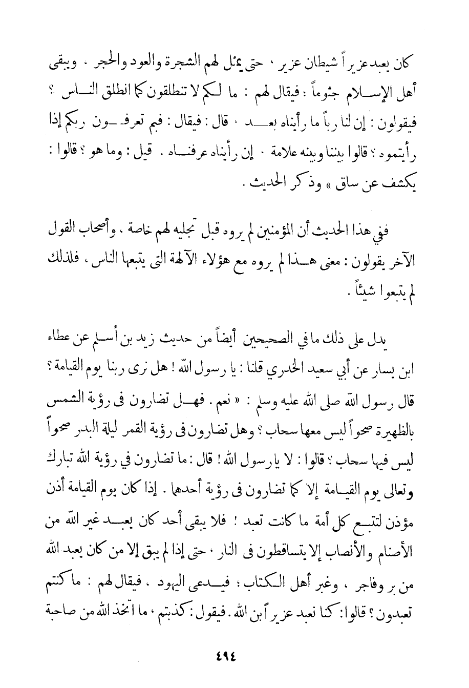 كَانَ يَعْبُدُ عُزَيْرًا شَيْطَانُ عُزَيْرٍ حَتَّى يُمَثَّلَ لَهُمْ الشَّجَرَةُ وَالْعُودُ وَالْحَجَرُ وَيَبْقَى أَهْلُ الْإِسْلَامِ جُثُومًا؛ فَيُقَالُ لَهُمْ: مَا لَكُمْ لَا تَنْطَلِقُونَ كَمَا انْطَلَقَ النَّاسُ؟ فَيَقُولُونَ: إنَّ لَنَا رَبًّا مَا رَأَيْنَاهُ بَعْدُ؛ قَالَ: فَيُقَالُ: فَبِمَ تَعْرِفُونَ رَبَّكُمْ إذَا رَأَيْتُمُوهُ؟ قَالُوا بَيْنَنَا وَبَيْنَهُ عَلَامَةٌ إنْ رَأَيْنَاهُ عَرَفْنَاهُ. قِيلَ: وَمَا هُوَ؟ قَالُوا: يَكْشِفُ عَنْ سَاقٍ} وَذَكَرَ الْحَدِيثَ. فَفِي هَذَا الْحَدِيثِ أَنَّ الْمُؤْمِنِينَ لَمْ يَرَوْهُ قَبْلَ تَجَلِّيهِ لَهُمْ خَاصَّةً وَأَصْحَابُ الْقَوْلِ الْآخَرِ يَقُولُونَ: مَعْنَى هَذَا لَمْ يَرَوْهُ مَعَ هَؤُلَاءِ الْآلِهَةِ الَّتِي يَتْبَعُهَا النَّاسُ فَلِذَلِكَ لَمْ يَتْبَعُوا شَيْئًا. يَدُلُّ عَلَى ذَلِكَ مَا فِي الصَّحِيحَيْنِ أَيْضًا مِنْ حَدِيثِ زَيْدِ بْنِ أَسْلَمَ عَنْ عَطَاءِ بْنِ يَسَارٍ عَنْ أَبِي سَعِيدٍ الخدري {قُلْنَا: يَا رَسُولَ اللَّهِ هَلْ نَرَى رَبَّنَا يَوْمَ الْقِيَامَةِ؟ قَالَ رَسُولُ اللَّهِ صَلَّى اللَّهُ عَلَيْهِ وَسَلَّمَ نَعَمْ. فَهَلْ تُضَارُّونَ فِي رُؤْيَةِ الشَّمْسِ بِالظَّهِيرَةِ صَحْوًا لَيْسَ مَعَهَا سَحَابٌ؟ وَهَلْ تُضَارُّونَ فِي رُؤْيَةِ الْقَمَرِ لَيْلَةَ الْبَدْرِ صَحْوًا لَيْسَ فِيهَا سَحَابٌ؟ قَالُوا: لَا يَا رَسُولَ اللَّهِ قَالَ: مَا تُضَارُّونَ فِي رُؤْيَةِ اللَّهِ تَبَارَكَ وَتَعَالَى يَوْمَ الْقِيَامَةِ إلَّا كَمَا تُضَارُّونَ فِي رُؤْيَةِ أَحَدِهِمَا. إذَا كَانَ يَوْمَ الْقِيَامَةِ أَذَّنَ مُؤَذِّنٌ لِتَتْبَعَ كُلُّ أُمَّةٍ مَا كَانَتْ تَعْبُدُ فَلَا يَبْقَى أَحَدٌ كَانَ يَعْبُدُ غَيْرَ اللَّهِ مِنْ الْأَصْنَامِ وَالْأَنْصَابِ إلَّا يَتَسَاقَطُونَ فِي النَّارِ حَتَّى إذَا لَمْ يَبْقَ إلَّا مَنْ كَانَ يَعْبُدُ اللَّهَ مِنْ بَرٍّ وَفَاجِرٍ وغبر أَهْلِ الْكِتَابِ؛ فَيُدْعَى الْيَهُودُ فَيُقَالُ لَهُمْ: مَا كُنْتُمْ تَعْبُدُونَ؟ قَالُوا: كُنَّا نَعْبُدُ عُزَيْرَ ابْنَ اللَّهِ. فَيَقُولُ: كَذَبْتُمْ مَا اتَّخَذَ اللَّهُ مِنْ صَاحِبَةٍ