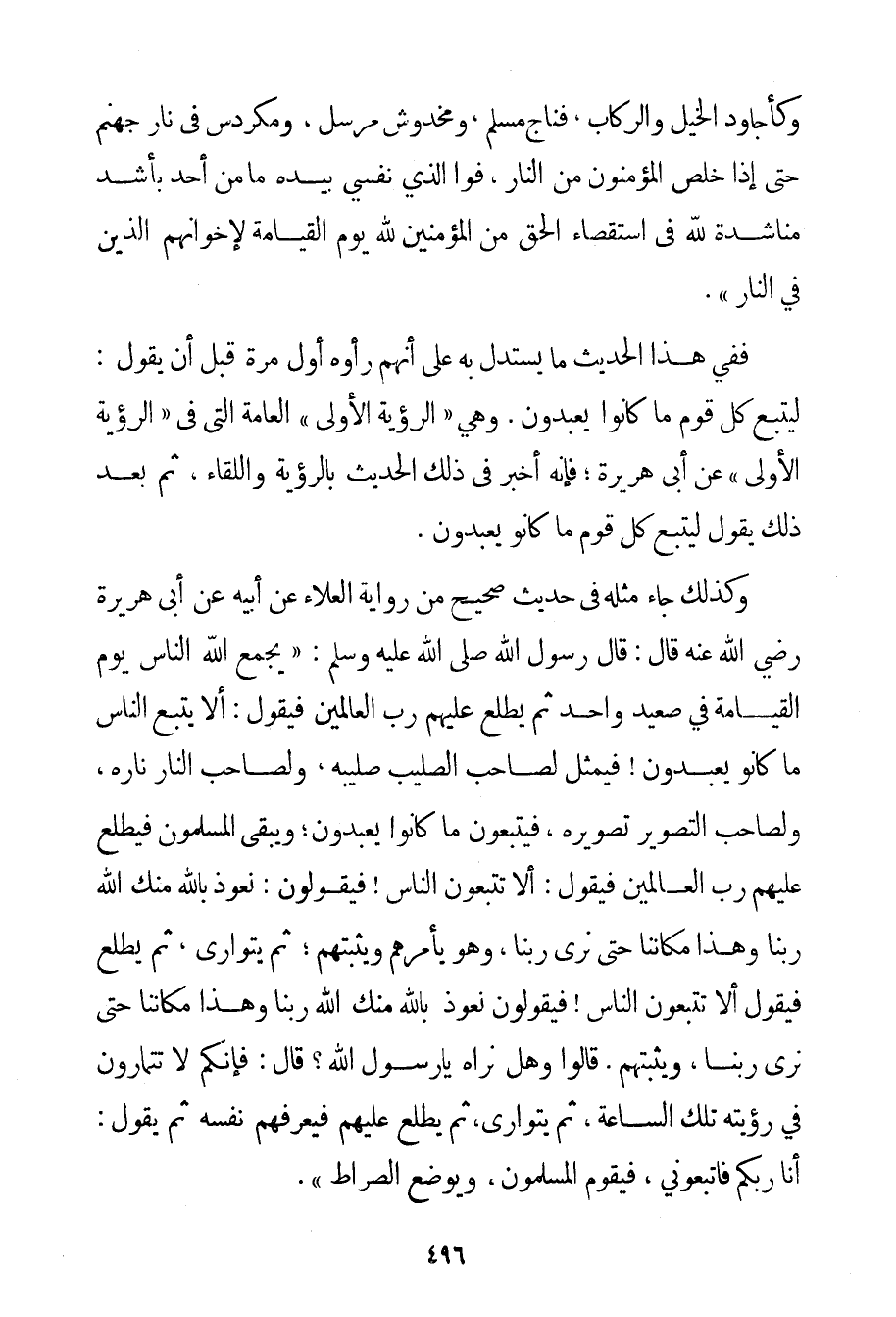 وَكَأَجَاوِدِ الْخَيْلِ وَالرِّكَابِ فَنَاجٍ مُسْلِمٌ وَمَخْدُوشٌ مُرْسَلٌ وَمُكَرْدَسٌ فِي نَارِ جَهَنَّمَ حَتَّى إذَا خَلَصَ الْمُؤْمِنُونَ مِنْ النَّارِ فَوَاَلَّذِي نَفْسِي بِيَدِهِ مَا مِنْ أَحَدٍ بِأَشَدَّ مُنَاشَدَةً لِلَّهِ فِي اسْتِقْصَاءِ الْحَقِّ مِنْ الْمُؤْمِنِينَ لِلَّهِ يَوْمَ الْقِيَامَةِ لِإِخْوَانِهِمْ الَّذِينَ فِي النَّارِ} . فَفِي هَذَا الْحَدِيثِ مَا يُسْتَدَلُّ بِهِ عَلَى أَنَّهُمْ رَأَوْهُ أَوَّلَ مَرَّةٍ قَبْلَ أَنْ يَقُولَ: لِيَتْبَعْ كُلُّ قَوْمٍ مَا كَانُوا يَعْبُدُونَ. وَهِيَ " الرُّؤْيَةُ الْأُولَى " الْعَامَّةُ الَّتِي فِي " الرُّؤْيَةِ الْأُولَى " عَنْ أَبِي هُرَيْرَةَ؛ فَإِنَّهُ أَخْبَرَ فِي ذَلِكَ الْحَدِيثِ بِالرُّؤْيَةِ وَاللِّقَاءِ ثُمَّ بَعْدَ ذَلِكَ يَقُولُ لِيَتْبَعْ كُلُّ قَوْمٍ مَا كَانُوا يَعْبُدُونَ.