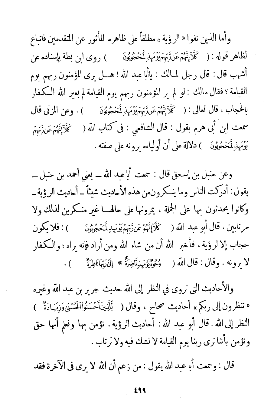 وَأَمَّا الَّذِينَ نَفَوْا " الرُّؤْيَةَ " مُطْلَقًا عَلَى ظَاهِرِهِ الْمَأْثُورِ عَنْ الْمُتَقَدِّمِينَ فَاتِّبَاعٌ لِظَاهِرِ قَوْلِهِ: {كَلَّا إنَّهُمْ عَنْ رَبِّهِمْ يَوْمَئِذٍ لَمَحْجُوبُونَ} رَوَى ابْنُ بَطَّةَ بِإِسْنَادِهِ عَنْ أَشْهَبَ قَالَ: قَالَ رَجُلٌ لِمَالِكِ: يَا أَبَا عَبْدِ اللَّهِ هَلْ يَرَى الْمُؤْمِنُونَ رَبَّهُمْ يَوْمَ الْقِيَامَةِ؟ فَقَالَ مَالِكٌ: لَوْ لَمْ يَرَ الْمُؤْمِنُونَ رَبَّهُمْ يَوْمَ الْقِيَامَةِ لَمْ يُعَيِّرْ اللَّهُ الْكُفَّارَ بِالْحِجَابِ قَالَ تَعَالَى: {كَلَّا إنَّهُمْ عَنْ رَبِّهِمْ يَوْمَئِذٍ لَمَحْجُوبُونَ} . وَعَنْ المزني قَالَ سَمِعْت ابْنَ أَبِي هَرَمٍ يَقُولُ: قَالَ الشَّافِعِيُّ: فِي كِتَابِ اللَّهِ {كَلَّا إنَّهُمْ عَنْ رَبِّهِمْ يَوْمَئِذٍ لَمَحْجُوبُونَ} دَلَالَةٌ عَلَى أَنَّ أَوْلِيَاءَهُ يَرَوْنَهُ عَلَى صِفَتِهِ. وَعَنْ حَنْبَلِ بْنِ إسْحَاقَ قَالَ: سَمِعْت أَبَا عَبْدِ اللَّهِ يَعْنِي أَحْمَد بْنَ حَنْبَلٍ - يَقُولُ: أَدْرَكْت النَّاسَ وَمَا يُنْكِرُونَ مِنْ هَذِهِ الْأَحَادِيثِ شَيْئًا - أَحَادِيثِ الرُّؤْيَةِ - وَكَانُوا يُحَدِّثُونَ بِهَا عَلَى الْجُمْلَةِ يُمِرُّونَهَا عَلَى حَالِهَا غَيْرَ مُنْكِرِينَ لِذَلِكَ وَلَا مُرْتَابِينَ قَالَ أَبُو عَبْدِ اللَّهِ {كَلَّا إنَّهُمْ عَنْ رَبِّهِمْ يَوْمَئِذٍ لَمَحْجُوبُونَ} فَلَا يَكُونُ حِجَابٌ إلَّا لِرُؤْيَةِ فَأَخْبَرَ اللَّهُ أَنَّ مَنْ شَاءَ اللَّهُ وَمَنْ أَرَادَ فَإِنَّهُ يَرَاهُ؛ وَالْكُفَّارُ لَا يَرَوْنَهُ. وَقَالَ: قَالَ اللَّهُ {وُجُوهٌ يَوْمَئِذٍ نَاضِرَةٌ} {إلَى رَبِّهَا نَاظِرَةٌ} . وَالْأَحَادِيثُ الَّتِي تُرْوَى فِي النَّظَرِ إلَى اللَّهِ حَدِيثُ جَرِيرِ بْنِ عَبْدِ اللَّهِ وَغَيْرِهِ {تَنْظُرُونَ إلَى رَبِّكُمْ} أَحَادِيثُ صِحَاحٌ وَقَالَ {لِلَّذِينَ أَحْسَنُوا الْحُسْنَى وَزِيَادَةٌ} النَّظَرُ إلَى اللَّهِ. قَالَ أَبُو عَبْدِ اللَّهِ: أَحَادِيثُ الرُّؤْيَةِ. نُؤْمِنُ بِهَا وَنَعْلَمُ أَنَّهَا حَقٌّ وَنُؤْمِنُ بِأَنَّنَا نَرَى رَبَّنَا يَوْمَ الْقِيَامَةِ لَا نَشُكُّ فِيهِ وَلَا نَرْتَابُ. قَالَ: وَسَمِعْت أَبَا عَبْدِ اللَّهِ يَقُولُ: مَنْ زَعَمَ أَنَّ اللَّهَ لَا يُرَى فِي الْآخِرَةِ فَقَدَ