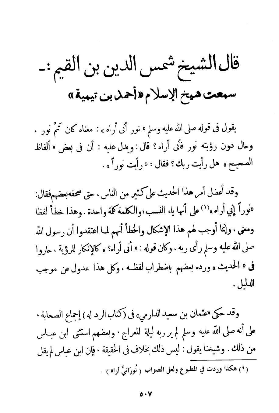 مَعْنَاهُ كَانَ ثَمَّ نُورٌ وَحَالَ دُونَ رُؤْيَتِهِ نُورٌ فَأَنَّى أَرَاهُ؟ قَالَ: وَيَدُلُّ عَلَيْهِ: أَنَّ فِي بَعْضِ " أَلْفَاظِ الصَّحِيحِ " {هَلْ رَأَيْت رَبَّك؟ فَقَالَ: رَأَيْت نُورًا} (*) . وَقَدْ أُعْضِلَ أَمْرُ هَذَا الْحَدِيثِ عَلَى كَثِيرٍ مِنْ النَّاسِ حَتَّى صَحَّفَهُ بَعْضُهُمْ فَقَالَ: {نُورًا إنِّي أَرَاهُ} عَلَى أَنَّهَا يَاءُ النَّسَبِ؛ وَالْكَلِمَةُ كَلِمَةٌ وَاحِدَةٌ. وَهَذَا خَطَأٌ لَفْظًا وَمَعْنًى وَإِنَّمَا أَوْجَبَ لَهُمْ هَذَا الْإِشْكَالَ وَالْخَطَأَ أَنَّهُمْ لَمَّا اعْتَقَدُوا أَنَّ رَسُولَ اللَّهِ صَلَّى اللَّهُ عَلَيْهِ وَسَلَّمَ رَأَى رَبَّهُ وَكَانَ قَوْلُهُ: {أَنَّى أَرَاهُ؟} كَالْإِنْكَارِ لِلرُّؤْيَةِ حَارُوا فِي " الْحَدِيثِ " وَرَدَّهُ بَعْضُهُمْ بِاضْطِرَابِ لَفْظِهِ وَكُلُّ هَذَا عُدُولٌ عَنْ مُوجَبِ الدَّلِيلِ. وَقَدْ حَكَى " عُثْمَانُ بْنُ سَعِيدٍ الدارمي " فِي كِتَابِ الرَّدِّ لَهُ إجْمَاعَ الصَّحَابَةِ عَلَى أَنَّهُ صَلَّى اللَّهُ عَلَيْهِ وَسَلَّمَ لَمْ يَرَ رَبَّهُ لَيْلَةَ الْمِعْرَاجِ وَبَعْضُهُمْ اسْتَثْنَى ابْنَ عَبَّاسٍ مِنْ ذَلِكَ. وَشَيْخُنَا يَقُولُ: لَيْسَ ذَلِكَ بِخِلَافِ فِي الْحَقِيقَةِ فَإِنَّ ابْنَ عَبَّاسٍ لَمْ يَقُلْ