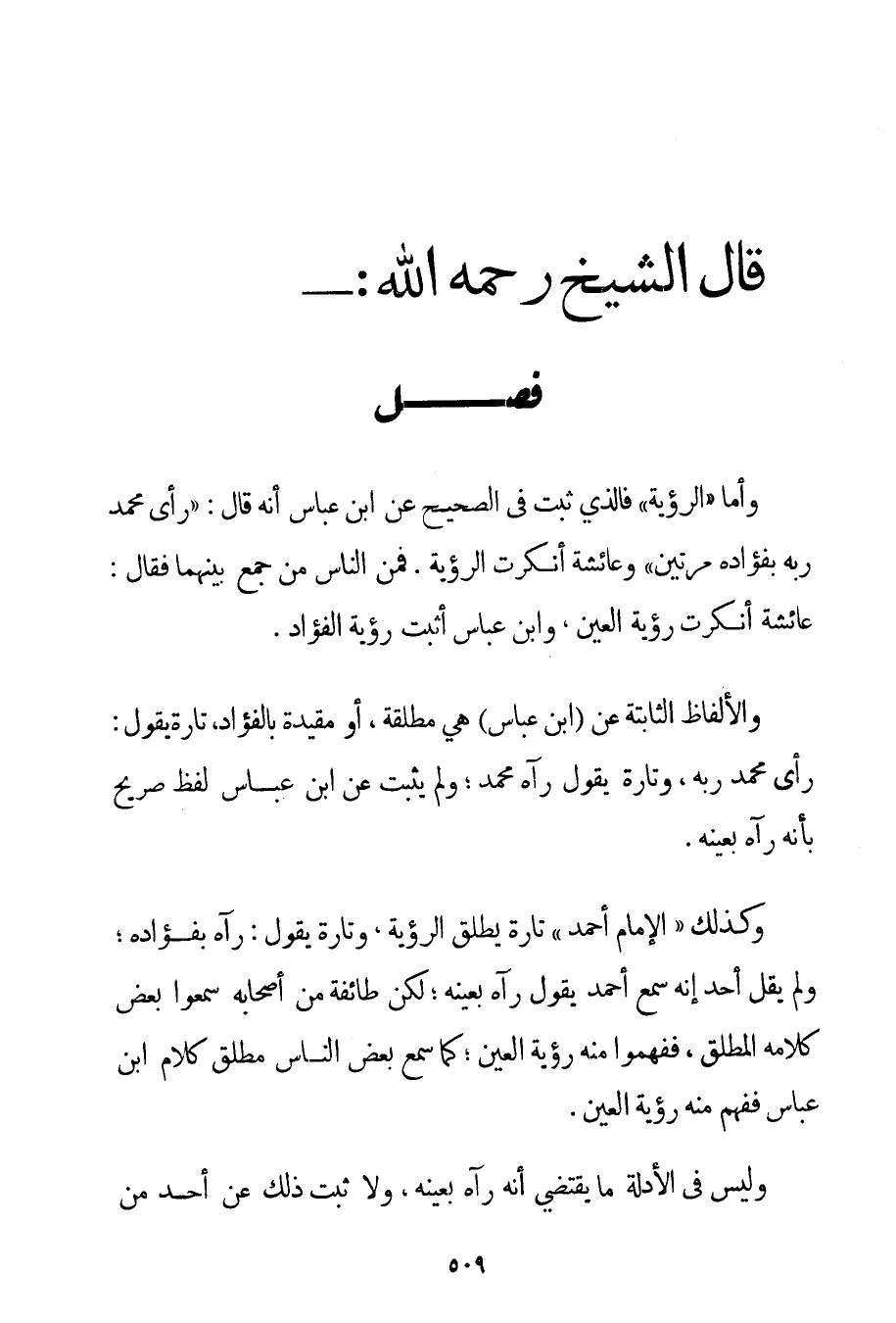 وَأَمَّا " الرُّؤْيَةُ " فَاَلَّذِي ثَبَتَ فِي الصَّحِيحِ عَنْ ابْنِ عَبَّاسٍ أَنَّهُ قَالَ: " رَأَى مُحَمَّدٌ رَبَّهُ بِفُؤَادِهِ مَرَّتَيْنِ " وَعَائِشَةُ أَنْكَرَتْ الرُّؤْيَةَ. فَمِنْ النَّاسِ مَنْ جَمَعَ بَيْنَهُمَا فَقَالَ: عَائِشَةُ أَنْكَرَتْ رُؤْيَةَ الْعَيْنِ وَابْنُ عَبَّاسٍ أَثْبَتَ رُؤْيَةَ الْفُؤَادِ. وَالْأَلْفَاظُ الثَّابِتَةُ عَنْ ابْنِ عَبَّاسٍ هِيَ مُطْلَقَةٌ أَوْ مُقَيَّدَةٌ بِالْفُؤَادِ تَارَةً يَقُولُ: رَأَى مُحَمَّدٌ رَبَّهُ وَتَارَةً يَقُولُ رَآهُ مُحَمَّدٌ؛ وَلَمْ يَثْبُتْ عَنْ ابْنِ عَبَّاسٍ لَفْظٌ صَرِيحٌ بِأَنَّهُ رَآهُ بِعَيْنِهِ. وَكَذَلِكَ " الْإِمَامُ أَحْمَد " تَارَةً يُطْلِقُ الرُّؤْيَةَ؛ وَتَارَةً يَقُولُ: رَآهُ بِفُؤَادِهِ؛ وَلَمْ يَقُلْ أَحَدٌ إنَّهُ سَمِعَ أَحْمَد يَقُولُ رَآهُ بِعَيْنِهِ؛ لَكِنَّ طَائِفَةً مِنْ أَصْحَابِهِ سَمِعُوا بَعْضَ كَلَامِهِ الْمُطْلَقِ فَفَهِمُوا مِنْهُ رُؤْيَةَ الْعَيْنِ؛ كَمَا سَمِعَ بَعْضُ النَّاسِ مُطْلَقَ كَلَامِ ابْنِ عَبَّاسٍ فَفَهِمَ مِنْهُ رُؤْيَةَ الْعَيْنِ. وَلَيْسَ فِي الْأَدِلَّةِ مَا يَقْتَضِي أَنَّهُ رَآهُ بِعَيْنِهِ وَلَا ثَبَتَ ذَلِكَ عَنْ أَحَدٍ مِنْ