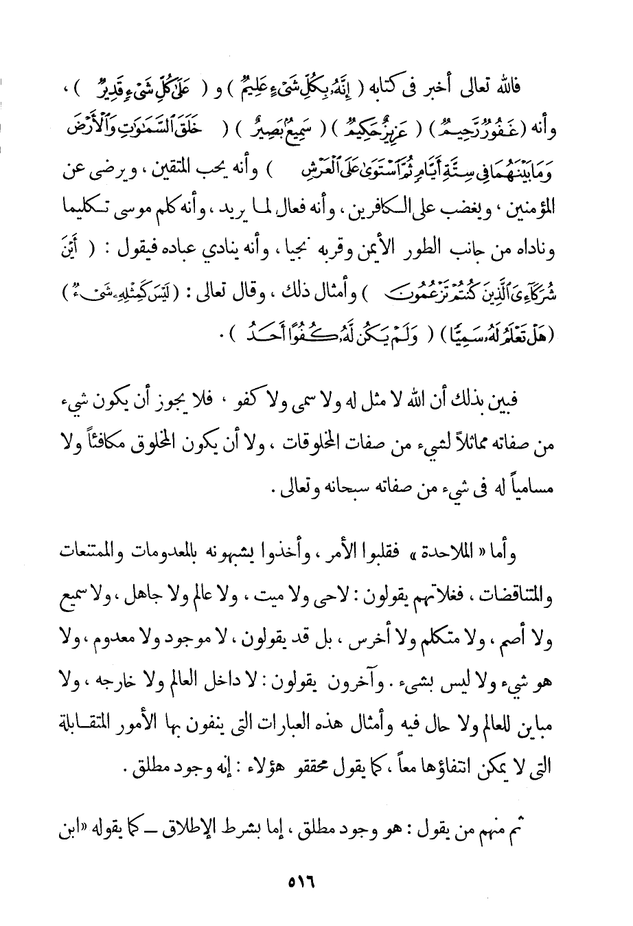 فَاَللَّهُ تَعَالَى أَخْبَرَ فِي كِتَابِهِ إنَّهُ {بِكُلِّ شَيْءٍ عَلِيمٌ} و {عَلَى كُلِّ شَيْءٍ قَدِيرٌ} وَأَنَّهُ {غَفُورٌ رَحِيمٌ} {عَزِيزٌ حَكِيمٌ} {سَمِيعٌ بَصِيرٌ} {خَلَقَ السَّمَاوَاتِ وَالْأَرْضَ وَمَا بَيْنَهُمَا فِي سِتَّةِ أَيَّامٍ ثُمَّ اسْتَوَى عَلَى الْعَرْشِ} وَأَنَّهُ {يُحِبُّ الْمُتَّقِينَ} وَيَرْضَى عَنْ الْمُؤْمِنِينَ وَيَغْضَبُ عَلَى الْكَافِرِينَ وَأَنَّهُ {فَعَّالٌ لِمَا يُرِيدُ} وَأَنَّهُ كَلَّمَ مُوسَى تَكْلِيمًا وَنَادَاهُ مِنْ جَانِبِ الطُّورِ الْأَيْمَنِ وَقَرَّبَهُ نَجِيًّا وَأَنَّهُ يُنَادِي عِبَادَهُ فَيَقُولُ: {أَيْنَ شُرَكَائِيَ الَّذِينَ كُنْتُمْ تَزْعُمُونَ} وَأَمْثَالُ ذَلِكَ وَقَالَ تَعَالَى: {لَيْسَ كَمِثْلِهِ شَيْءٌ} {هَلْ تَعْلَمُ لَهُ سَمِيًّا} {وَلَمْ يَكُنْ لَهُ كُفُوًا أَحَدٌ} . فَبَيَّنَ بِذَلِكَ أَنَّ اللَّهَ لَا مِثْلَ لَهُ وَلَا سَمِيَّ وَلَا كُفُوًا فَلَا يَجُوزُ أَنْ يَكُونَ شَيْءٌ مِنْ صِفَاتِهِ مُمَاثِلًا لِشَيْءِ مِنْ صِفَاتِ الْمَخْلُوقَاتِ وَلَا أَنْ يَكُونَ الْمَخْلُوقُ مُكَافِئًا وَلَا مُسَامِيًا لَهُ فِي شَيْءٍ مِنْ صِفَاتِهِ سُبْحَانَهُ وَتَعَالَى. وَأَمَّا " الْمَلَاحِدَةُ " فَقَلَبُوا الْأَمْرَ وَأَخَذُوا يُشَبِّهُونَهُ بِالْمَعْدُومَاتِ وَالْمُمْتَنِعَاتِ والمتناقضات فَغُلَاتُهُمْ يَقُولُونَ: لَا حَيَّ وَلَا مَيِّتَ وَلَا عَالِمَ وَلَا جَاهِلَ وَلَا سَمِيعَ وَلَا أَصَمَّ وَلَا مُتَكَلِّمَ وَلَا أَخْرَسَ بَلْ قَدْ يَقُولُونَ لَا مَوْجُودَ وَلَا مَعْدُومَ وَلَا هُوَ شَيْءٌ وَلَا لَيْسَ بِشَيْءِ. وَآخَرُونَ يَقُولُونَ: لَا دَاخِلَ الْعَالَمِ وَلَا خَارِجَهُ وَلَا مُبَايِنَ لِلْعَالَمِ وَلَا حَالَّ فِيهِ وَأَمْثَالُ هَذِهِ الْعِبَارَاتِ الَّتِي يَنْفُونَ بِهَا الْأُمُورَ الْمُتَقَابِلَةَ الَّتِي لَا يُمْكِنُ انْتِفَاؤُهَا مَعًا كَمَا يَقُولُ مُحَقِّقُو هَؤُلَاءِ: إنَّهُ وُجُودٌ مُطْلَقٌ. ثُمَّ مِنْهُمْ مَنْ يَقُولُ: هُوَ وُجُودٌ مُطْلَقٌ إمَّا بِشَرْطِ الْإِطْلَاقِ - كَمَا يَقُولُهُ " ابْنُ