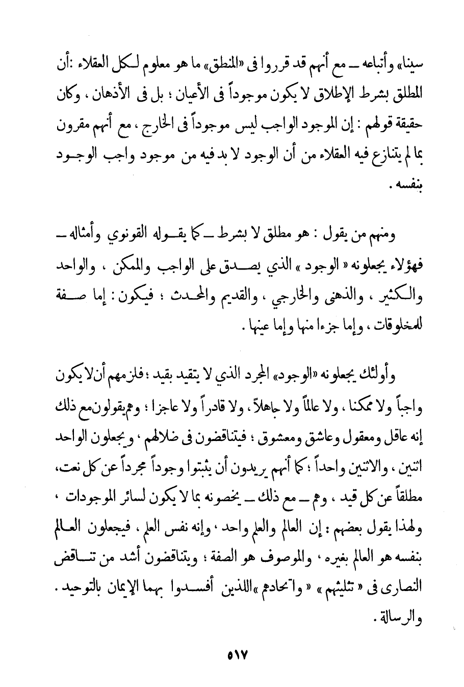 سِينَا " وَأَتْبَاعُهُ - مَعَ أَنَّهُمْ قَدْ قَرَّرُوا فِي " الْمَنْطِقِ " مَا هُوَ مَعْلُومٌ لِكُلِّ الْعُقَلَاءِ: أَنَّ الْمُطْلَقَ بِشَرْطِ الْإِطْلَاقِ لَا يَكُونُ مَوْجُودًا فِي الْأَعْيَانِ؛ بَلْ فِي الْأَذْهَانِ وَكَانَ حَقِيقَةُ قَوْلِهِمْ: إنَّ الْمَوْجُودَ الْوَاجِبَ لَيْسَ مَوْجُودًا فِي الْخَارِجِ مَعَ أَنَّهُمْ مُقِرُّونَ بِمَا لَمْ يَتَنَازَعْ فِيهِ الْعُقَلَاءُ مِنْ أَنَّ الْوُجُودَ لَا بُدَّ فِيهِ مِنْ مَوْجُودٍ وَاجِبِ الْوُجُودِ بِنَفْسِهِ. وَمِنْهُمْ مَنْ يَقُولُ: هُوَ مُطْلَقٌ لَا بِشَرْطِ - كَمَا يَقُولُهُ القونوي وَأَمْثَالُهُ - فَهَؤُلَاءِ يَجْعَلُونَهُ " الْوُجُودَ " الَّذِي يَصْدُقُ عَلَى الْوَاجِبِ وَالْمُمْكِنِ وَالْوَاحِدِ وَالْكَثِيرِ وَالذِّهْنِيِّ وَالْخَارِجِيِّ وَالْقَدِيمِ وَالْمُحْدَثِ؛ فَيَكُونُ: إمَّا صِفَةٌ لِلْمَخْلُوقَاتِ وَإِمَّا جُزْءًا مِنْهَا وَإِمَّا عَيْنُهَا. وَأُولَئِكَ يَجْعَلُونَهُ " الْوُجُودَ " الْمُجَرَّدَ الَّذِي لَا يَتَقَيَّدُ بِقَيْدِ؛ فَلَزِمَهُمْ أَنْ لَا يَكُونَ وَاجِبًا وَلَا مُمْكِنًا وَلَا عَالِمًا وَلَا جَاهِلًا وَلَا قَادِرًا وَلَا عَاجِزًا؛ وَهُمْ يَقُولُونَ مَعَ ذَلِكَ إنَّهُ عَاقِلٌ وَمَعْقُولٌ وَعَاشِقٌ وَمَعْشُوقٌ؛ فَيَتَنَاقَضُونَ فِي ضَلَالِهِمْ وَيَجْعَلُونَ الْوَاحِدَ اثْنَيْنِ وَالِاثْنَيْنِ وَاحِدًا؛ كَمَا أَنَّهُمْ يُرِيدُونَ أَنْ يُثْبِتُوا وُجُودًا مُجَرَّدًا عَنْ كُلِّ نَعْتٍ مُطْلَقًا عَنْ كُلِّ قَيْدٍ وَهُمْ - مَعَ ذَلِكَ - يَخُصُّونَهُ بِمَا لَا يَكُونُ لِسَائِرِ الْمَوْجُودَاتِ وَلِهَذَا يَقُولُ بَعْضُهُمْ: إنَّ الْعَالِمَ وَالْعِلْمَ وَاحِدٌ وَإِنَّهُ نَفْسُ الْعِلْمِ فَيَجْعَلُونَ الْعَالِمَ بِنَفْسِهِ هُوَ الْعَالِمُ بِغَيْرِهِ وَالْمَوْصُوفُ هُوَ الصِّفَةُ؛ وَيَتَنَاقَضُونَ أَشَدَّ مِنْ تَنَاقُضِ النَّصَارَى فِي " تَثْلِيثِهِمْ " " وَاتِّحَادِهِمْ " اللَّذَيْنِ أَفْسَدُوا بِهِمَا الْإِيمَانَ بِالتَّوْحِيدِ، وَالرِّسَالَةِ.