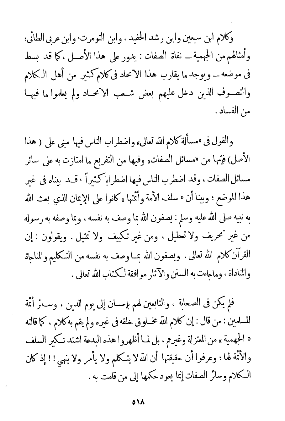 وَكَلَامُ ابْنِ سَبُعَيْنِ وَابْنِ رُشْدٍ الْحَفِيدِ وَابْنِ التومرت وَابْنِ عَرَبِيٍّ الطَّائِيِّ؛ وَأَمْثَالِهِمْ مِنْ الْجَهْمِيَّة - نفاة الصِّفَاتِ: يَدُورُ عَلَى هَذَا الْأَصْلِ كَمَا قَدْ بُسِطَ فِي مَوْضِعِهِ - وَيُوجَدُ مَا يُقَارِبُ هَذَا الِاتِّحَادَ فِي كَلَامِ كَثِيرٍ مِنْ أَهْلِ الْكَلَامِ وَالتَّصَوُّفِ الَّذِينَ دَخَلَ عَلَيْهِمْ بَعْضُ شُعَبِ الِاتِّحَادِ وَلَمْ يَعْلَمُوا مَا فِيهَا مِنْ الْفَسَادِ. وَالْقَوْلُ فِي " مَسْأَلَةِ كَلَامِ اللَّهِ تَعَالَى " وَاضْطِرَابُ النَّاسِ فِيهَا مَبْنِيٌّ عَلَى هَذَا الْأَصْلِ فَإِنَّهَا مِنْ " مَسَائِلِ الصِّفَاتِ " وَفِيهَا مِنْ التَّفْرِيعِ مَا امْتَازَتْ بِهِ عَلَى سَائِرِ مَسَائِلِ الصِّفَاتِ وَقَدْ اضْطَرَبَ النَّاسُ فِيهَا اضْطِرَابًا كَثِيرًا قَدْ بَيَّنَّاهُ فِي غَيْرِ هَذَا الْمَوْضِعِ؛ وَبَيَّنَّا أَنَّ " سَلَفَ الْأُمَّةِ وَأَئِمَّتَهَا " كَانُوا عَلَى الْإِيمَانِ الَّذِي بَعَثَ اللَّهُ بِهِ نَبِيَّهُ صَلَّى اللَّهُ عَلَيْهِ وَسَلَّمَ يَصِفُونَ اللَّهَ بِمَا وَصَفَ بِهِ نَفْسَهُ وَبِمَا وَصَفَهُ بِهِ رَسُولُهُ مِنْ غَيْرِ تَحْرِيفٍ وَلَا تَعْطِيلٍ وَمِنْ غَيْرِ تَكْيِيفٍ وَلَا تَمْثِيلٍ. وَيَقُولُونَ: إنَّ الْقُرْآنَ كَلَامُ اللَّهِ تَعَالَى. وَيَصِفُونَ اللَّهَ بِمَا وَصَفَ بِهِ نَفْسَهُ مِنْ التَّكْلِيمِ وَالْمُنَاجَاةِ وَالْمُنَادَاةِ وَمَا جَاءَتْ بِهِ السُّنَنُ وَالْآثَارُ مُوَافِقَةً لِكِتَابِ اللَّهِ تَعَالَى. فَلَمْ يَكُنْ فِي الصَّحَابَةِ وَالتَّابِعِينَ لَهُمْ بِإِحْسَانِ إلَى يَوْمِ الدِّينِ وَسَائِرِ أَئِمَّةِ الْمُسْلِمِينَ: مَنْ قَالَ: إنَّ كَلَامَ اللَّهِ مَخْلُوقٌ خَلَقَهُ فِي غَيْرِهِ وَلَمْ يَقُمْ بِهِ كَلَامٌ كَمَا قَالَتْهُ " الْجَهْمِيَّة " مِنْ الْمُعْتَزِلَةِ وَغَيْرِهِمْ بَلْ لَمَّا أَظْهَرُوا هَذِهِ الْبِدْعَةَ اشْتَدَّ نَكِيرُ السَّلَفِ وَالْأَئِمَّةِ لَهَا؛ وَعَرَفُوا أَنَّ حَقِيقَتَهَا أَنَّ اللَّهَ لَا يَتَكَلَّمُ وَلَا يَأْمُرُ وَلَا يَنْهَى إذْ كَانَ الْكَلَامُ وَسَائِرُ الصِّفَاتِ إنَّمَا يَعُودُ حُكْمُهَا إلَى مَنْ قَامَتْ بِهِ.