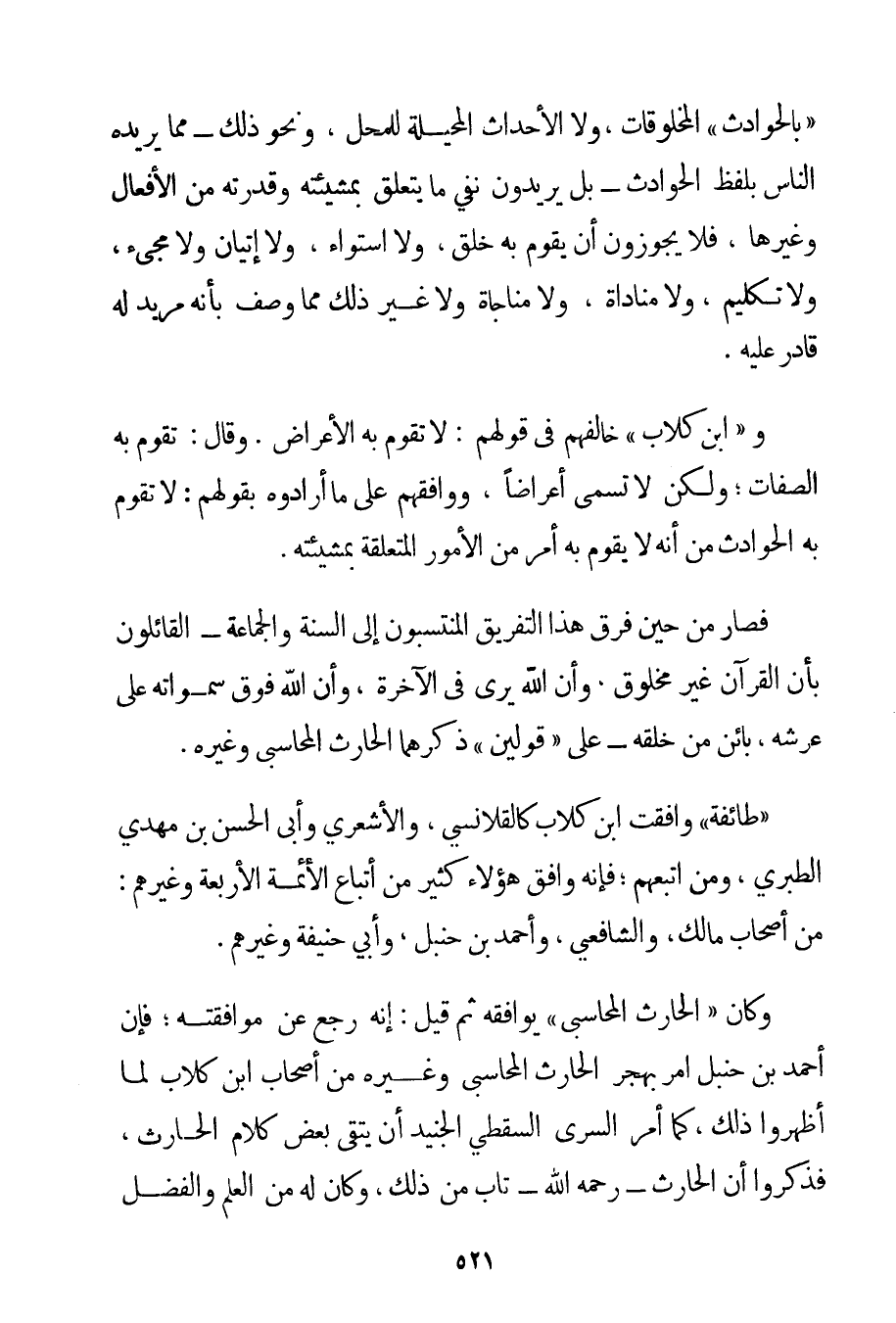 " بِالْحَوَادِثِ " الْمَخْلُوقَاتِ وَلَا الْأَحْدَاثَ الْمُحِيلَةَ لِلْمَحَلِّ وَنَحْوَ ذَلِكَ - مِمَّا يُرِيدُهُ النَّاسُ بِلَفْظِ الْحَوَادِثِ - بَلْ يُرِيدُونَ نَفْيَ مَا يَتَعَلَّقُ بِمَشِيئَتِهِ وَقُدْرَتِهِ مِنْ الْأَفْعَالِ وَغَيْرِهَا فَلَا يُجَوِّزُونَ أَنْ يَقُومَ بِهِ خَلْقٌ وَلَا اسْتِوَاءٌ وَلَا إتْيَانٌ وَلَا مَجِيءٌ وَلَا تَكْلِيمٌ وَلَا مُنَادَاةٌ وَلَا مُنَاجَاةٌ وَلَا غَيْرُ ذَلِكَ مِمَّا وُصِفَ بِأَنَّهُ مُرِيدٌ لَهُ قَادِرٌ عَلَيْهِ. وَابْنُ كُلَّابٍ " خَالَفَهُمْ فِي قَوْلِهِمْ: لَا تَقُومُ بِهِ الْأَعْرَاضُ. وَقَالَ: تَقُومُ بِهِ الصِّفَاتُ؛ وَلَكِنْ لَا تُسَمَّى أَعْرَاضًا وَوَافَقَهُمْ عَلَى مَا أَرَادُوهُ بِقَوْلِهِمْ: لَا تَقُومُ بِهِ الْحَوَادِثُ مِنْ أَنَّهُ لَا يَقُومُ بِهِ أَمْرٌ مِنْ الْأُمُورِ الْمُتَعَلِّقَةِ بِمَشِيئَتِهِ. فَصَارَ مِنْ حِينِ فَرَّقَ هَذَا التَّفْرِيقَ الْمُنْتَسِبُونَ إلَى السُّنَّةِ وَالْجَمَاعَةِ - الْقَائِلُونَ بِأَنَّ الْقُرْآنَ غَيْرُ مَخْلُوقٍ وَأَنَّ اللَّهَ يُرَى فِي الْآخِرَةِ وَأَنَّ اللَّهَ فَوْقَ سَمَوَاتِهِ عَلَى عَرْشِهِ بَائِنٌ مِنْ خَلْقِهِ - عَلَى " قَوْلَيْنِ " ذَكَرَهُمَا الْحَارِثُ المحاسبي وَغَيْرُهُ. " طَائِفَةٌ " وَافَقَتْ ابْنَ كُلَّابٍ كالقلانسي وَالْأَشْعَرِيِّ وَأَبِي الْحَسَنِ بْنِ مَهْدِيٍّ الطبري وَمَنْ اتَّبَعَهُمْ؛ فَإِنَّهُ وَافَقَ هَؤُلَاءِ كَثِيرٌ مِنْ أَتْبَاعِ الْأَئِمَّةِ الْأَرْبَعَةِ وَغَيْرِهِمْ: مِنْ أَصْحَابِ مَالِكٍ وَالشَّافِعِيِّ وَأَحْمَد بْنِ حَنْبَلٍ وَأَبِي حَنِيفَةَ وَغَيْرِهِمْ. وَكَانَ " الْحَارِثُ المحاسبي " يُوَافِقُهُ ثُمَّ قِيلَ: إنَّهُ رَجَعَ عَنْ مُوَافَقَتِهِ؛ فَإِنَّ أَحْمَد بْنَ حَنْبَلٍ أَمَرَ بِهَجْرِ الْحَارِثِ المحاسبي وَغَيْرِهِ مِنْ أَصْحَابِ ابْنِ كُلَّابٍ لَمَّا أَظْهَرُوا ذَلِكَ كَمَا أَمَرَ السَّرِيُّ السقطي الْجُنَيْد أَنْ يَتَّقِيَ بَعْضَ كَلَامِ الْحَارِثِ فَذَكَرُوا أَنَّ الْحَارِثَ - رَحِمَهُ اللَّهُ - تَابَ مِنْ ذَلِكَ وَكَانَ لَهُ مِنْ الْعِلْمِ وَالْفَضْلِ