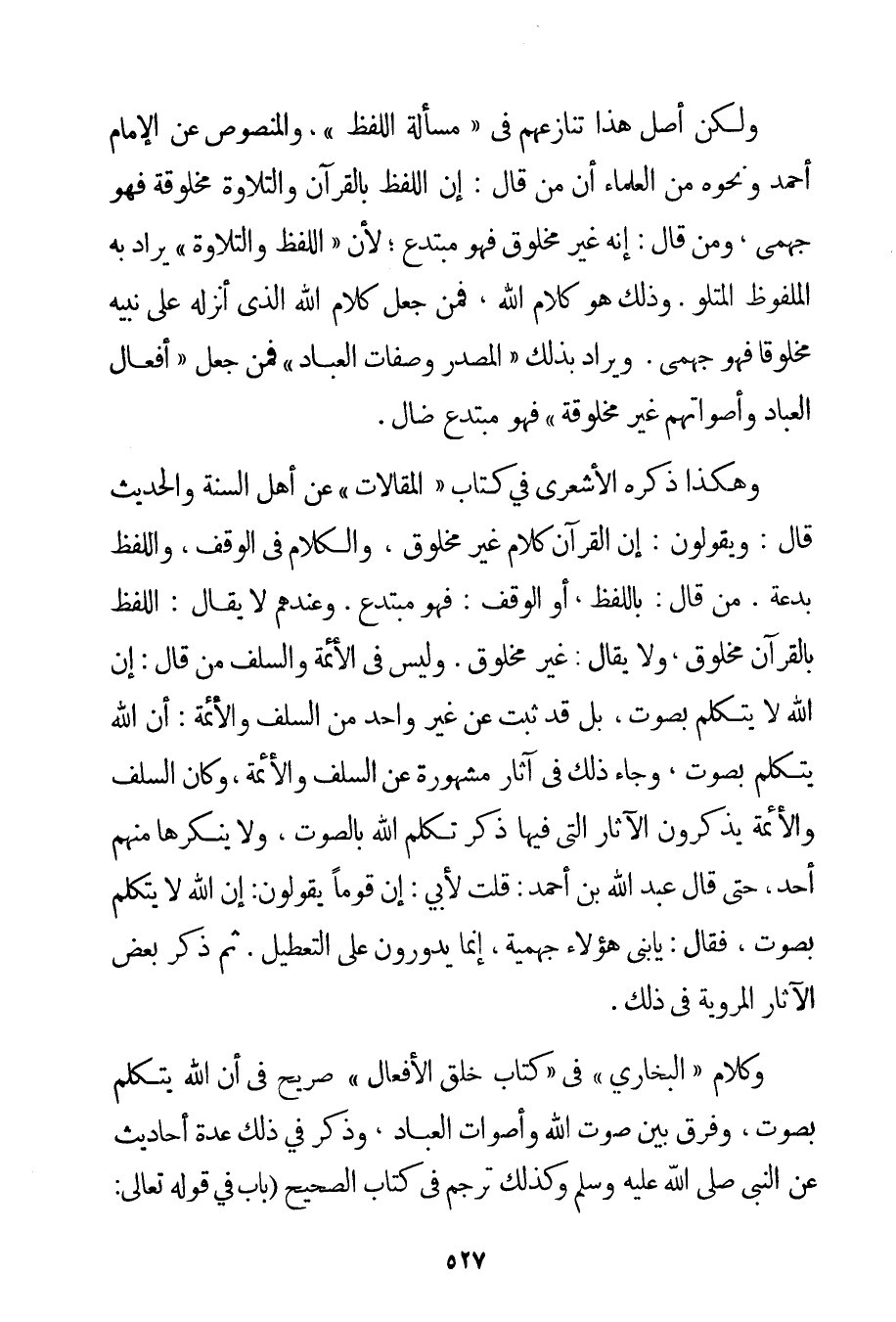 وَلَكِنَّ أَصْلَ هَذَا تَنَازُعُهُمْ فِي " مَسْأَلَةِ اللَّفْظِ " وَالْمَنْصُوصُ عَنْ الْإِمَامِ أَحْمَد وَنَحْوِهِ مِنْ الْعُلَمَاءِ أَنَّ مَنْ قَالَ: إنَّ اللَّفْظَ بِالْقُرْآنِ وَالتِّلَاوَةَ مَخْلُوقَةٌ فَهُوَ جهمي وَمَنْ قَالَ: إنَّهُ غَيْرُ مَخْلُوقٍ فَهُوَ مُبْتَدِعٌ؛ لِأَنَّ " اللَّفْظَ وَالتِّلَاوَةَ " يُرَادُ بِهِ الْمَلْفُوظُ الْمَتْلُوُّ. وَذَلِكَ هُوَ كَلَامُ اللَّهِ فَمَنْ جَعَلَ كَلَامَ اللَّهِ الَّذِي أَنْزَلَهُ عَلَى نَبِيِّهِ مَخْلُوقًا فَهُوَ جهمي. وَيُرَادُ بِذَلِكَ " الْمَصْدَرُ وَصِفَاتُ الْعِبَادِ " فَمَنْ جَعَلَ " أَفْعَالَ الْعِبَادِ وَأَصْوَاتَهُمْ غَيْرَ مَخْلُوقَةٍ " فَهُوَ مُبْتَدِعٌ ضَالٌّ. وَهَكَذَا ذَكَرَهُ الْأَشْعَرِيُّ فِي كِتَابِ " الْمَقَالَاتِ " عَنْ أَهْلِ السُّنَّةِ وَالْحَدِيثِ قَالَ: وَيَقُولُونَ: إنَّ الْقُرْآنَ كَلَامٌ غَيْرُ مَخْلُوقٍ وَالْكَلَامُ فِي الْوَقْفِ وَاللَّفْظِ بِدْعَةٌ. مَنْ قَالَ: بِاللَّفْظِ أَوْ الْوَقْفِ: فَهُوَ مُبْتَدِعٌ. وَعِنْدَهُمْ لَا يُقَالُ: اللَّفْظُ بِالْقُرْآنِ مَخْلُوقٌ وَلَا يُقَالُ: غَيْرُ مَخْلُوقٍ. وَلَيْسَ فِي الْأَئِمَّةِ وَالسَّلَفِ مَنْ قَالَ: إنَّ اللَّهَ لَا يَتَكَلَّمُ بِصَوْتِ بَلْ قَدْ ثَبَتَ عَنْ غَيْرِ وَاحِدٍ مِنْ السَّلَفِ وَالْأَئِمَّةِ: أَنَّ اللَّهَ يَتَكَلَّمُ بِصَوْتِ وَجَاءَ ذَلِكَ فِي آثَارٍ مَشْهُورَةٍ عَنْ السَّلَفِ وَالْأَئِمَّةِ وَكَانَ السَّلَفُ وَالْأَئِمَّةُ يَذْكُرُونَ الْآثَارَ الَّتِي فِيهَا ذَكَرَ تَكَلَّمَ اللَّهُ بِالصَّوْتِ وَلَا يُنْكِرُهَا مِنْهُمْ أَحَدٌ حَتَّى قَالَ عَبْدُ اللَّهِ بْنُ أَحْمَد: قُلْت لِأَبِي: إنَّ قَوْمًا يَقُولُونَ: إنَّ اللَّهَ لَا يَتَكَلَّمُ بِصَوْتِ فَقَالَ: يَا بُنَيَّ هَؤُلَاءِ جهمية إنَّمَا يَدُورُونَ عَلَى التَّعْطِيلِ. ثُمَّ ذَكَرَ بَعْضَ الْآثَارِ الْمَرْوِيَّةِ فِي ذَلِكَ. وَكَلَامُ " الْبُخَارِيِّ " فِي " كِتَابِ خَلْقِ الْأَفْعَالِ " صَرِيحٌ فِي أَنَّ اللَّهَ يَتَكَلَّمُ بِصَوْتِ وَفَرْقٌ بَيْنَ صَوْتِ اللَّهِ وَأَصْوَاتِ الْعِبَادِ وَذَكَرَ فِي ذَلِكَ عِدَّةَ أَحَادِيثَ عَنْ النَّبِيِّ صَلَّى اللَّهُ عَلَيْهِ وَسَلَّمَ وَكَذَلِكَ تَرْجَمَ فِي كِتَابِ الصَّحِيحِ بَابٌ فِي قَوْله تَعَالَى:
