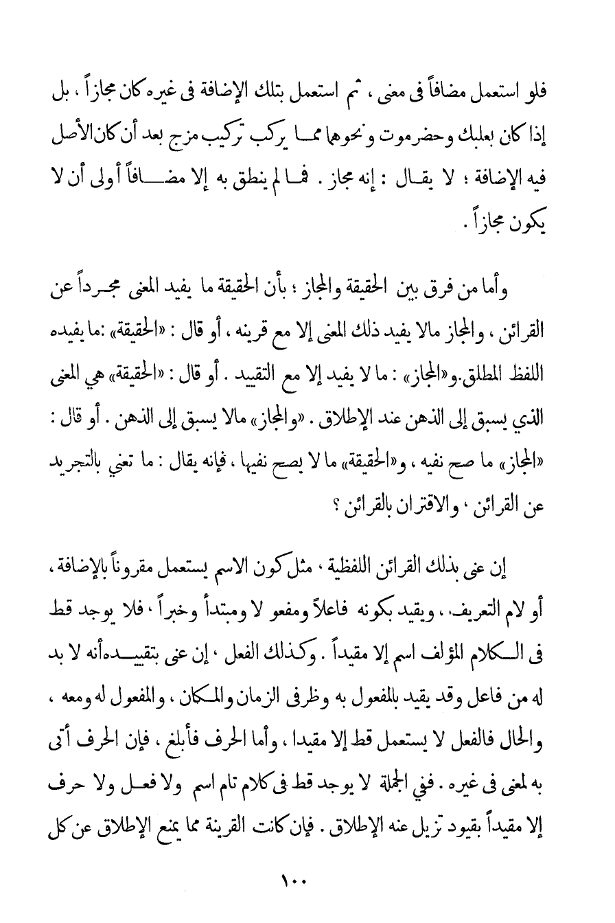 وَأَمَّا مَنْ فَرَّقَ بَيْنَ الْحَقِيقَةِ وَالْمَجَازِ؛ بِأَنَّ الْحَقِيقَةَ مَا يُفِيدُ الْمَعْنَى مُجَرَّدًا عَنْ الْقَرَائِنِ، وَالْمَجَازَ مَا لَا يُفِيدُ ذَلِكَ الْمَعْنَى إلَّا مَعَ قَرِينَةٍ، أَوْ قَالَ: " الْحَقِيقَةُ ": مَا يُفِيدُهُ اللَّفْظُ الْمُطْلَقُ. وَ " الْمَجَازُ ": مَا لَا يُفِيدُ إلَّا مَعَ التَّقْيِيدِ. أَوْ قَالَ: " الْحَقِيقَةُ " هِيَ الْمَعْنَى الَّذِي يَسْبِقُ إلَى الذِّهْنِ عِنْدَ الْإِطْلَاقِ. " وَالْمَجَازُ " مَا لَا يَسْبِقُ إلَى الذِّهْنِ. أَوْ قَالَ: " الْمَجَازُ " مَا صَحَّ نَفْيُهُ وَ " الْحَقِيقَةُ " مَا لَا يَصِحُّ نَفْيُهَا، فَإِنَّهُ يُقَالُ: مَا تَعْنِي بِالتَّجْرِيدِ عَنْ الْقَرَائِنِ وَالِاقْتِرَانِ بِالْقَرَائِنِ؟ إنْ عُنِيَ بِذَلِكَ الْقَرَائِنُ اللَّفْظِيَّةُ مِثْلُ كَوْنِ الِاسْمِ يُسْتَعْمَلُ مَقْرُونًا بِالْإِضَافَةِ أَوْ لَامِ التَّعْرِيفِ وَيُقَيَّدُ بِكَوْنِهِ فَاعِلًا وَمَفْعُولًا وَمُبْتَدَأً وَخَبَرًا فَلَا يُوجَدُ قَطُّ فِي الْكَلَامِ الْمُؤَلَّفِ اسْمٌ إلَّا مُقَيَّدًا. وَكَذَلِكَ الْفِعْلُ إنْ عُنِيَ بِتَقْيِيدِهِ أَنَّهُ لَا بُدَّ لَهُ مِنْ فَاعِلٍ وَقَدْ يُقَيَّدُ بِالْمَفْعُولِ بِهِ وَظَرْفَيْ الزَّمَانِ وَالْمَكَانِ وَالْمَفْعُولِ لَهُ وَمَعَهُ وَالْحَالِ فَالْفِعْلُ لَا يُسْتَعْمَلُ قَطُّ إلَّا مُقَيَّدًا وَأَمَّا الْحَرْفُ فَأَبْلَغُ فَإِنَّ الْحَرْفَ أُتِيَ بِهِ لِمَعْنَى فِي غَيْرِهِ. فَفِي الْجُمْلَةِ لَا يُوجَدُ قَطُّ فِي كَلَامٍ تَامٍّ اسْمٌ وَلَا فِعْلٌ وَلَا حَرْفٌ إلَّا مُقَيَّدًا بِقُيُودِ تُزِيلُ عَنْهُ الْإِطْلَاقَ. فَإِنْ كَانَتْ الْقَرِينَةُ مِمَّا يَمْنَعُ الْإِطْلَاقَ عَنْ كُلِّ