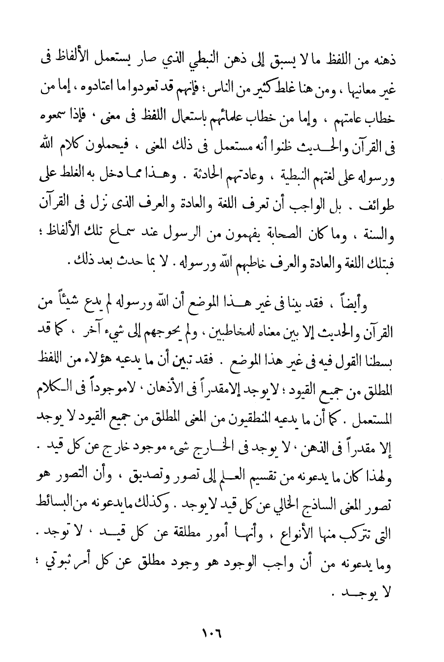 ذِهْنِهِ مِنْ اللَّفْظِ مَا لَا يَسْبِقُ إلَى ذِهْنِ النَّبَطِيِّ الَّذِي صَارَ يَسْتَعْمِلُ الْأَلْفَاظَ فِي غَيْرِ مَعَانِيهَا وَمِنْ هُنَا غَلِطَ كَثِيرٌ مِنْ النَّاسِ؛ فَإِنَّهُمْ قَدْ تَعَوَّدُوا مَا اعْتَادُوهُ إمَّا مِنْ خِطَابِ عَامَّتِهِمْ وَإِمَّا مِنْ خِطَابِ عُلَمَائِهِمْ بِاسْتِعْمَالِ اللَّفْظِ فِي مَعْنًى فَإِذَا سَمِعُوهُ فِي الْقُرْآنِ وَالْحَدِيثِ ظَنُّوا أَنَّهُ مُسْتَعْمَلٌ فِي ذَلِكَ الْمَعْنَى فَيَحْمِلُونَ كَلَامَ اللَّهِ وَرَسُولِهِ عَلَى لُغَتِهِمْ النَّبَطِيَّةِ وَعَادَتِهِمْ الْحَادِثَةِ. وَهَذَا مِمَّا دَخَلَ بِهِ الْغَلَطُ عَلَى طَوَائِفَ، بَلْ الْوَاجِبُ أَنْ تَعْرِفَ اللُّغَةَ وَالْعَادَةَ وَالْعُرْفَ الَّذِي نَزَلَ فِي الْقُرْآنِ وَالسُّنَّةِ وَمَا كَانَ الصَّحَابَةُ يَفْهَمُونَ مِنْ الرَّسُولِ عِنْدَ سَمَاعِ تِلْكَ الْأَلْفَاظِ؛ فَبِتِلْكَ اللُّغَةِ وَالْعَادَةِ وَالْعُرْفِ خَاطَبَهُمْ اللَّهُ وَرَسُولُهُ. لَا بِمَا حَدَثَ بَعْدَ ذَلِكَ. وَأَيْضًا فَقَدْ بَيَّنَّا فِي غَيْرِ هَذَا الْمَوْضِعِ أَنَّ اللَّهَ وَرَسُولَهُ لَمْ يَدَعْ شَيْئًا مِنْ الْقُرْآنِ وَالْحَدِيثِ إلَّا بَيَّنَ مَعْنَاهُ لِلْمُخَاطَبِينَ وَلَمْ يحوجهم إلَى شَيْءٍ آخَرَ كَمَا قَدْ بَسَطْنَا الْقَوْلَ فِيهِ فِي غَيْرِ هَذَا الْمَوْضِعِ. فَقَدْ تَبَيَّنَ أَنَّ مَا يَدَّعِيهِ هَؤُلَاءِ مِنْ اللَّفْظِ الْمُطْلَقِ مِنْ جَمِيعِ الْقُيُودِ؛ لَا يُوجَدُ إلَّا مُقَدَّرًا فِي الْأَذْهَانِ لَا مَوْجُودًا فِي الْكَلَامِ الْمُسْتَعْمَلِ. كَمَا أَنَّ مَا يَدَّعِيهِ الْمَنْطِقِيُّونَ مِنْ الْمَعْنَى الْمُطْلَقِ مِنْ جَمِيعِ الْقُيُودِ لَا يُوجَدُ إلَّا مُقَدَّرًا فِي الذِّهْنِ لَا يُوجَدُ فِي الْخَارِجِ شَيْءٌ مَوْجُودٌ خَارِجٌ عَنْ كُلِّ قَيْدٍ. وَلِهَذَا كَانَ مَا يَدَّعُونَهُ مِنْ تَقْسِيمِ الْعِلْمِ إلَى تَصَوُّرٍ وَتَصْدِيقٍ وَأَنَّ التَّصَوُّرَ هُوَ تَصَوُّرُ الْمَعْنَى السَّاذَجِ الْخَالِي عَنْ كُلِّ قَيْدٍ لَا يُوجَدُ. وَكَذَلِكَ مَا يَدَّعُونَهُ مِنْ الْبَسَائِطِ الَّتِي تَتَرَكَّبُ مِنْهَا الْأَنْوَاعُ وَأَنَّهَا أُمُورٌ مُطْلَقَةٌ عَنْ كُلِّ قَيْدٍ لَا تُوجَدُ. وَمَا يَدَّعُونَهُ مِنْ أَنَّ وَاجِبَ الْوُجُودِ هُوَ وُجُودٌ مُطْلَقٌ عَنْ كُلِّ أَمْرٍ ثُبُوتِيٍّ؛ لَا يُوجَدُ.