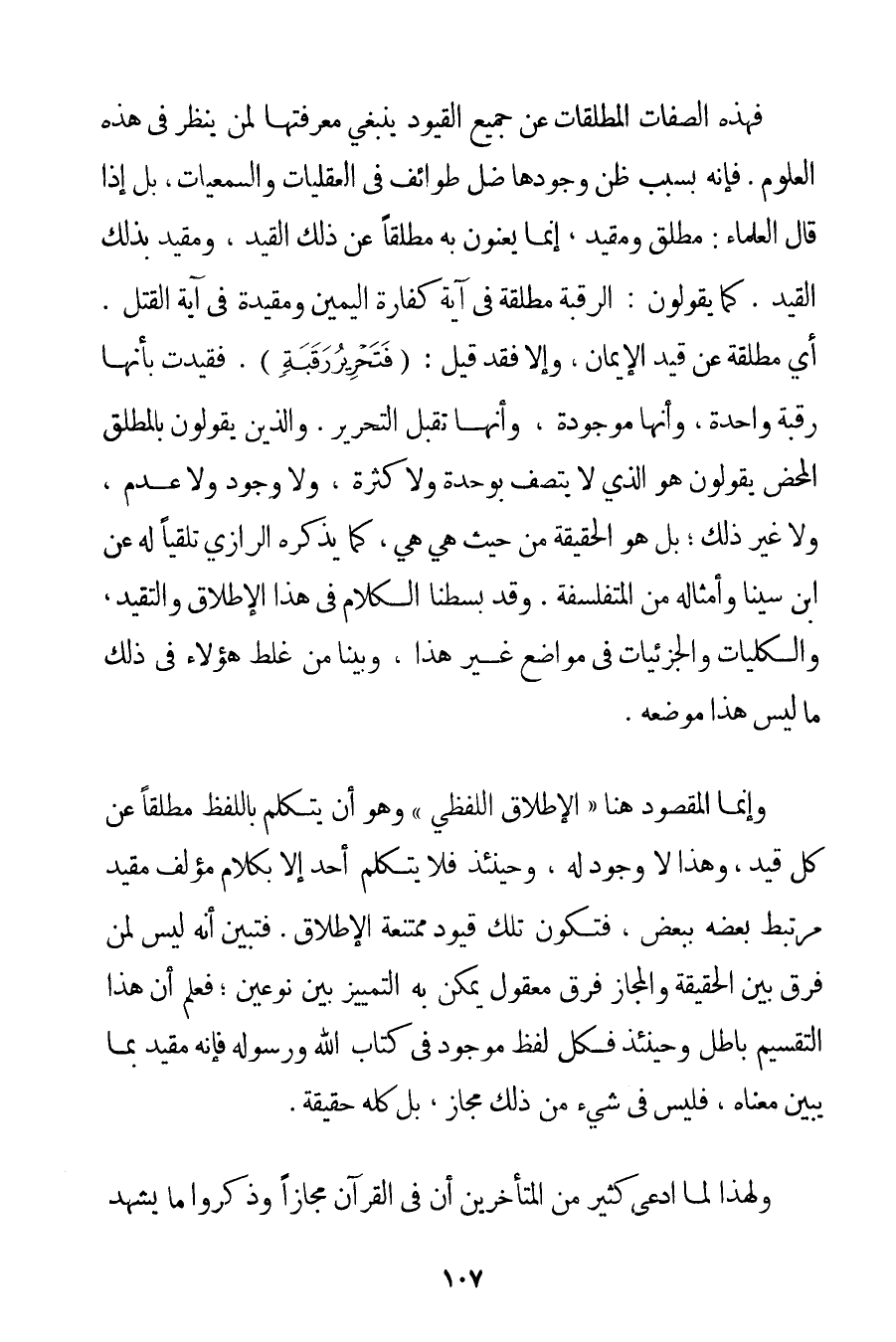 فَهَذِهِ الصِّفَاتُ الْمُطْلَقَاتُ عَنْ جَمِيعِ الْقُيُودِ يَنْبَغِي مَعْرِفَتُهَا لِمَنْ يَنْظُرُ فِي هَذِهِ الْعُلُومِ. فَإِنَّهُ بِسَبَبِ ظَنِّ وُجُودِهَا ضَلَّ طَوَائِفُ فِي الْعَقْلِيَّاتِ وَالسَّمْعِيَّاتِ بَلْ إذَا قَالَ الْعُلَمَاءُ: مُطْلَقٌ وَمُقَيَّدٌ إنَّمَا يَعْنُونَ بِهِ مُطْلَقًا عَنْ ذَلِكَ الْقَيْدِ وَمُقَيَّدًا بِذَلِكَ الْقَيْدِ. كَمَا يَقُولُونَ: الرَّقَبَةُ مُطْلَقَةٌ فِي آيَةِ كَفَّارَةِ الْيَمِينِ وَمُقَيَّدَةٌ فِي آيَةِ الْقَتْلِ. أَيْ مُطْلَقَةٌ عَنْ قَيْدِ الْإِيمَانِ وَإِلَّا فَقَدْ قِيلَ: {فَتَحْرِيرُ رَقَبَةٍ} . فَقُيِّدَتْ بِأَنَّهَا رَقَبَةٌ وَاحِدَةٌ وَأَنَّهَا مَوْجُودَةٌ وَأَنَّهَا تَقْبَلُ التَّحْرِيرَ. وَاَلَّذِينَ يَقُولُونَ بِالْمُطْلَقِ الْمَحْضِ يَقُولُونَ هُوَ الَّذِي لَا يَتَّصِفُ بِوَحْدَةِ وَلَا كَثْرَةٍ وَلَا وُجُودٍ وَلَا عَدَمٍ وَلَا غَيْرِ ذَلِكَ؛ بَلْ هُوَ الْحَقِيقَةُ مِنْ حَيْثُ هِيَ هِيَ كَمَا يَذْكُرُهُ الرَّازِي تَلَقِّيًا لَهُ عَنْ ابْنِ سِينَا وَأَمْثَالِهِ مِنْ الْمُتَفَلْسِفَةِ. وَقَدْ بَسَطْنَا الْكَلَامَ فِي هَذَا الْإِطْلَاقِ وَالتَّقَيُّدِ وَالْكُلِّيَّاتِ وَالْجُزْئِيَّاتِ فِي مَوَاضِعَ غَيْرِ هَذَا وَبَيَّنَّا مِنْ غَلَطِ هَؤُلَاءِ فِي ذَلِكَ مَا لَيْسَ هَذَا مَوْضِعَهُ. وَإِنَّمَا الْمَقْصُودُ هُنَا " الْإِطْلَاقُ اللَّفْظِيُّ " وَهُوَ أَنْ يَتَكَلَّمَ بِاللَّفْظِ مُطْلَقًا عَنْ كُلِّ قَيْدٍ وَهَذَا لَا وُجُودَ لَهُ وَحِينَئِذٍ فَلَا يَتَكَلَّمُ أَحَدٌ إلَّا بِكَلَامِ مُؤَلَّفٍ مُقَيَّدٍ مُرْتَبِطٍ بَعْضُهُ بِبَعْضِ فَتَكُونُ تِلْكَ قُيُودًا مُمْتَنِعَةَ الْإِطْلَاقِ. فَتَبَيَّنَ أَنَّهُ لَيْسَ لِمَنْ فَرَّقَ بَيْنَ الْحَقِيقَةِ وَالْمَجَازِ فَرْقٌ مَعْقُولٌ يُمْكِنُ بِهِ التَّمْيِيزُ بَيْنَ نَوْعَيْنِ؛ فَعُلِمَ أَنَّ هَذَا التَّقْسِيمَ بَاطِلٌ وَحِينَئِذٍ فَكُلُّ لَفْظٍ مَوْجُودٍ فِي كِتَابِ اللَّهِ وَرَسُولِهِ فَإِنَّهُ مُقَيَّدٌ بِمَا يُبَيِّنُ مَعْنَاهُ فَلَيْسَ فِي شَيْءٍ مِنْ ذَلِكَ مَجَازٌ بَلْ كُلُّهُ حَقِيقَةٌ. وَلِهَذَا لَمَّا ادَّعَى كَثِيرٌ مِنْ الْمُتَأَخِّرِينَ أَنَّ فِي الْقُرْآنِ مَجَازًا وَذَكَرُوا مَا يَشْهَدُ