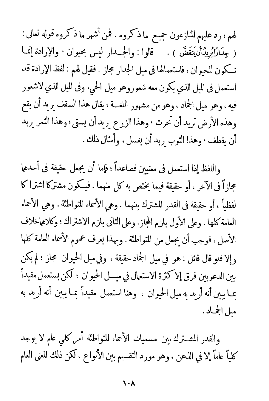 لَهُمْ؛ رَدَّ عَلَيْهِمْ الْمُنَازِعُونَ جَمِيعَ مَا ذَكَرُوهُ. فَمِنْ أَشْهَرِ مَا ذَكَرُوهُ قَوْله تَعَالَى {جِدَارًا يُرِيدُ أَنْ يَنْقَضَّ} . قَالُوا: وَالْجِدَارُ لَيْسَ بِحَيَوَانِ، وَالْإِرَادَةُ إنَّمَا تَكُونُ لِلْحَيَوَانِ؛ فَاسْتِعْمَالُهَا فِي مَيْلِ الْجِدَارِ مَجَازٌ. فَقِيلَ لَهُمْ: لَفْظُ الْإِرَادَةِ قَدْ اُسْتُعْمِلَ فِي الْمَيْلِ الَّذِي يَكُونُ مَعَهُ شُعُورٌ وَهُوَ مَيْلُ الْحَيِّ وَفِي الْمَيْلِ الَّذِي لَا شُعُورَ فِيهِ وَهُوَ مَيْلُ الْجَمَادِ وَهُوَ مِنْ مَشْهُورِ اللُّغَةِ؛ يُقَالُ هَذَا السَّقْفُ يُرِيدُ أَنْ يَقَعَ وَهَذِهِ الْأَرْضُ تُرِيدُ أَنْ تُحْرَثَ وَهَذَا الزَّرْعُ يُرِيدُ أَنْ يُسْقَى؛ وَهَذَا الثَّمَرُ يُرِيدُ أَنْ يُقْطَفَ وَهَذَا الثَّوْبُ يُرِيدُ أَنْ يُغْسَلَ وَأَمْثَالُ ذَلِكَ. وَاللَّفْظُ إذَا اُسْتُعْمِلَ فِي مَعْنَيَيْنِ فَصَاعِدًا؛ فَإِمَّا أَنْ يُجْعَلَ حَقِيقَةً فِي أَحَدِهِمَا مَجَازًا فِي الْآخَرِ أَوْ حَقِيقَةً فِيمَا يَخْتَصُّ بِهِ كُلٌّ مِنْهُمَا فَيَكُونُ مُشْتَرَكًا اشْتِرَاكًا لَفْظِيًّا أَوْ حَقِيقَةً فِي الْقَدْرِ الْمُشْتَرَكِ بَيْنَهُمَا. وَهِيَ الْأَسْمَاءُ الْمُتَوَاطِئَةُ. وَهِيَ الْأَسْمَاءُ الْعَامَّةُ كُلُّهَا. وَعَلَى الْأَوَّلِ يَلْزَمُ الْمَجَازُ. وَعَلَى الثَّانِي يَلْزَمُ الِاشْتِرَاكُ؛ وَكِلَاهُمَا خِلَافُ الْأَصْلِ فَوَجَبَ أَنْ يُجْعَلَ مِنْ الْمُتَوَاطِئَةِ. وَبِهَذَا يُعْرَفُ عُمُومُ الْأَسْمَاءِ الْعَامَّةِ كُلِّهَا وَإِلَّا فَلَوْ قَالَ قَائِلٌ: هُوَ فِي مَيْلِ الْجَمَادِ حَقِيقَةٌ وَفِي مَيْلِ الْحَيَوَانِ مَجَازٌ؛ لَمْ يَكُنْ بَيْنَ الدعويين فَرْقٌ إلَّا كَثْرَةُ الِاسْتِعْمَالِ فِي مَيْلِ الْحَيَوَانِ؛ لَكِنْ يُسْتَعْمَلُ مُقَيَّدًا بِمَا يُبَيِّنُ أَنَّهُ أُرِيدَ بِهِ مَيْلُ الْحَيَوَانِ وَهُنَا اُسْتُعْمِلَ مُقَيَّدًا بِمَا يُبَيِّنُ أَنَّهُ أُرِيدَ بِهِ مَيْلُ الْجَمَادِ. وَالْقَدْرُ الْمُشْتَرَكُ بَيْنَ مُسَمَّيَاتِ الْأَسْمَاءِ الْمُتَوَاطِئَةِ أَمْرٌ كُلِّيٌّ عَامٌّ لَا يُوجَدُ كُلِّيًّا عَامًّا إلَّا فِي الذِّهْنِ وَهُوَ مَوْرِدُ التَّقْسِيمِ بَيْنَ الْأَنْوَاعِ لَكِنَّ ذَلِكَ الْمَعْنَى الْعَامَّ