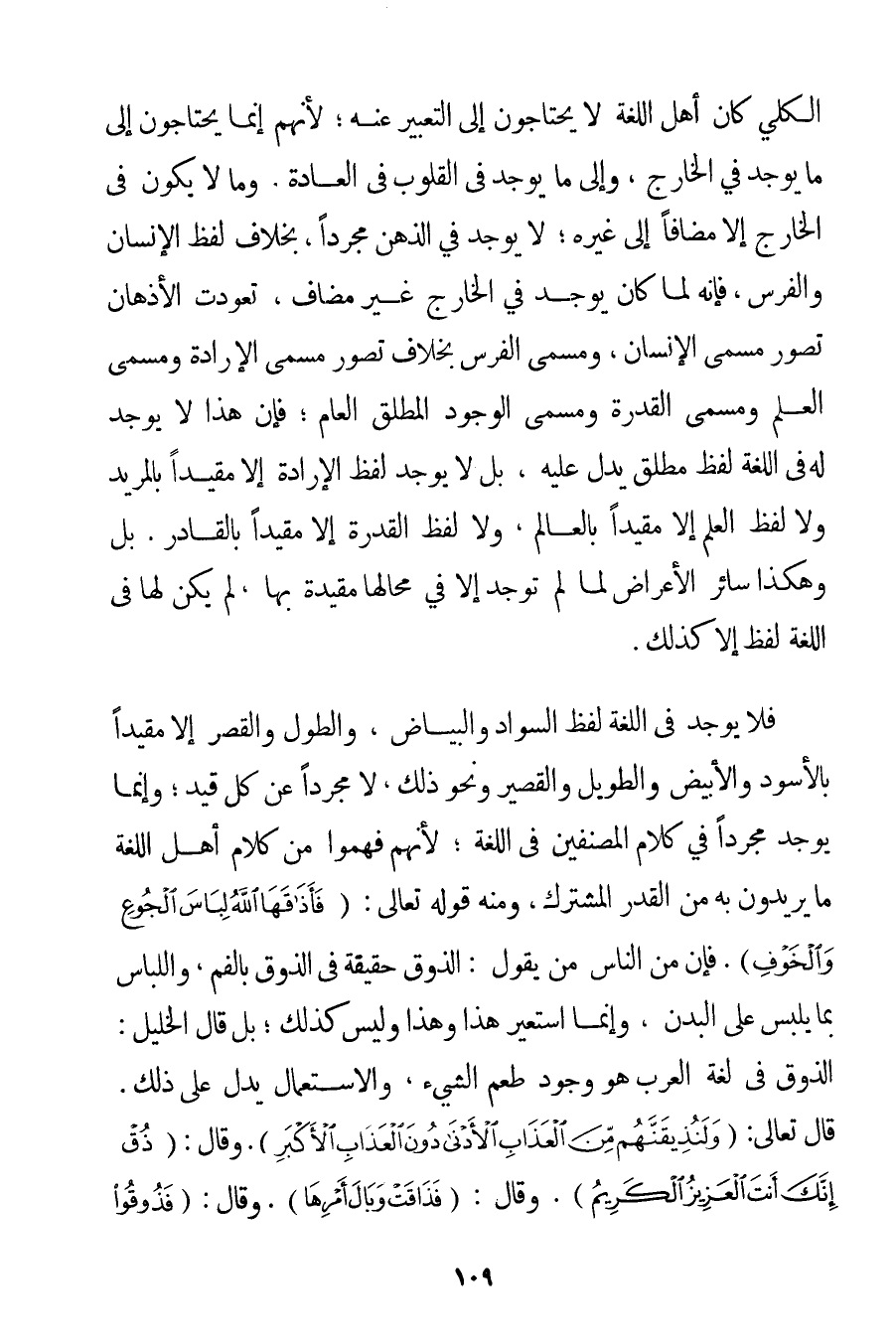 الْكُلِّيَّ كَانَ أَهْلُ اللُّغَةِ لَا يَحْتَاجُونَ إلَى التَّعْبِيرِ عَنْهُ؛ لِأَنَّهُمْ إنَّمَا يَحْتَاجُونَ إلَى مَا يُوجَدُ فِي الْخَارِجِ وَإِلَى مَا يُوجَدُ فِي الْقُلُوبِ فِي الْعَادَةِ. وَمَا لَا يَكُونُ فِي الْخَارِجِ إلَّا مُضَافًا إلَى غَيْرِهِ؛ لَا يُوجَدُ فِي الذِّهْنِ مُجَرَّدًا بِخِلَافِ لَفْظِ الْإِنْسَانِ وَالْفَرَسِ فَإِنَّهُ لَمَّا كَانَ يُوجَدُ فِي الْخَارِجِ غَيْرَ مُضَافٍ تَعَوَّدَتْ الْأَذْهَانُ تَصَوُّرَ مُسَمَّى الْإِنْسَانِ وَمُسَمَّى الْفَرَسِ بِخِلَافِ تَصَوُّرِ مُسَمَّى الْإِرَادَةِ وَمُسَمَّى الْعِلْمِ وَمُسَمَّى الْقُدْرَةِ وَمُسَمَّى الْوُجُودِ الْمُطْلَقِ الْعَامِّ؛ فَإِنَّ هَذَا لَا يُوجَدُ لَهُ فِي اللُّغَةِ لَفْظٌ مُطْلَقٌ يَدُلُّ عَلَيْهِ بَلْ لَا يُوجَدُ لَفْظُ الْإِرَادَةِ إلَّا مُقَيَّدًا بِالْمُرِيدِ وَلَا لَفْظُ الْعِلْمِ إلَّا مُقَيَّدًا بِالْعَالِمِ وَلَا لَفْظُ الْقُدْرَةِ إلَّا مُقَيَّدًا بِالْقَادِرِ. بَلْ وَهَكَذَا سَائِرُ الْأَعْرَاضِ لَمَّا لَمْ تُوجَدْ إلَّا فِي مَحَالِّهَا مُقَيَّدَةً بِهَا لَمْ يَكُنْ لَهَا فِي اللُّغَةِ لَفْظٌ إلَّا كَذَلِكَ. فَلَا يُوجَدُ فِي اللُّغَةِ لَفْظُ السَّوَادِ وَالْبَيَاضِ وَالطُّولِ وَالْقِصَرِ إلَّا مُقَيَّدًا بِالْأَسْوَدِ وَالْأَبْيَضِ وَالطَّوِيلِ وَالْقَصِيرِ وَنَحْوِ ذَلِكَ لَا مُجَرَّدًا عَنْ كُلِّ قَيْدٍ؛ وَإِنَّمَا يُوجَدُ مُجَرَّدًا فِي كَلَامِ الْمُصَنِّفِينَ فِي اللُّغَةِ؛ لِأَنَّهُمْ فَهِمُوا مِنْ كَلَامِ أَهْلِ اللُّغَةِ مَا يُرِيدُونَ بِهِ مِنْ الْقَدْرِ الْمُشْتَرَكِ وَمِنْهُ قَوْله تَعَالَى {فَأَذَاقَهَا اللَّهُ لِبَاسَ الْجُوعِ وَالْخَوْفِ} . فَإِنَّ مِنْ النَّاسِ مَنْ يَقُولُ: الذَّوْقُ حَقِيقَةٌ فِي الذَّوْقِ بِالْفَمِ، وَاللِّبَاسُ بِمَا يُلْبَسُ عَلَى الْبَدَنِ، وَإِنَّمَا اُسْتُعِيرَ هَذَا وَهَذَا وَلَيْسَ كَذَلِكَ؛ بَلْ قَالَ الْخَلِيلُ: الذَّوْقُ فِي لُغَةِ الْعَرَبِ هُوَ وُجُودُ طَعْمِ الشَّيْءِ وَالِاسْتِعْمَالُ يَدُلُّ عَلَى ذَلِكَ. قَالَ تَعَالَى: {وَلَنُذِيقَنَّهُمْ مِنَ الْعَذَابِ الْأَدْنَى دُونَ الْعَذَابِ الْأَكْبَرِ} . وَقَالَ: {ذُقْ إنَّكَ أَنْتَ الْعَزِيزُ الْكَرِيمُ} . وَقَالَ: {فَذَاقَتْ وَبَالَ أَمْرِهَا} . وَقَالَ: {فَذُوقُوا