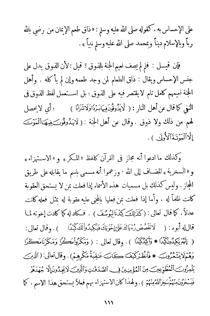 وَكَذَلِكَ مَا ادَّعَوْا أَنَّهُ مَجَازٌ فِي الْقُرْآنِ كَلَفْظِ " الْمَكْرِ " وَ " الِاسْتِهْزَاءِ " وَ " السُّخْرِيَةِ " الْمُضَافِ إلَى اللَّهِ وَزَعَمُوا أَنَّهُ مُسَمًّى بِاسْمِ مَا يُقَابِلُهُ عَلَى طَرِيقِ الْمَجَازِ وَلَيْسَ كَذَلِكَ بَلْ مُسَمَّيَاتُ هَذِهِ الْأَسْمَاءِ إذَا فُعِلَتْ بِمَنْ لَا يَسْتَحِقُّ الْعُقُوبَةَ كَانَتْ ظُلْمًا لَهُ وَأَمَّا إذَا فُعِلَتْ بِمَنْ فَعَلَهَا بِالْمَجْنِيِّ عَلَيْهِ عُقُوبَةً لَهُ بِمِثْلِ فِعْلِهِ كَانَتْ عَدْلًا كَمَا قَالَ تَعَالَى: {كَذَلِكَ كِدْنَا لِيُوسُفَ} . فَكَادَ لَهُ كَمَا كَادَتْ إخْوَتُهُ لَمَّا قَالَ لَهُ أَبُوهُ: {لَا تَقْصُصْ رُؤْيَاكَ عَلَى إخْوَتِكَ فَيَكِيدُوا لَكَ كَيْدًا} . وَقَالَ تَعَالَى: {إنَّهُمْ يَكِيدُونَ كَيْدًا} {وَأَكِيدُ كَيْدًا} . وَقَالَ تَعَالَى: {وَمَكَرُوا مَكْرًا وَمَكَرْنَا مَكْرًا وَهُمْ لَا يَشْعُرُونَ} {فَانْظُرْ كَيْفَ كَانَ عَاقِبَةُ مَكْرِهِمْ} . وَقَالَ تَعَالَى: {الَّذِينَ يَلْمِزُونَ الْمُطَّوِّعِينَ مِنَ الْمُؤْمِنِينَ فِي الصَّدَقَاتِ وَالَّذِينَ لَا يَجِدُونَ إلَّا جُهْدَهُمْ فَيَسْخَرُونَ مِنْهُمْ سَخِرَ اللَّهُ مِنْهُمْ} . وَلِهَذَا كَانَ الِاسْتِهْزَاءُ بِهِمْ فِعْلًا يَسْتَحِقُّ هَذَا الِاسْمَ كَمَا