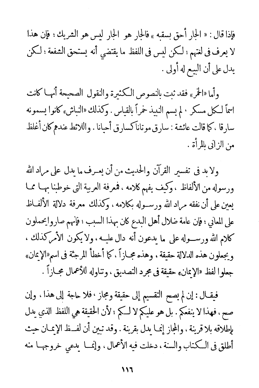 وَلَا بُدَّ فِي تَفْسِيرِ الْقُرْآنِ وَالْحَدِيثِ مِنْ أَنْ يُعْرَفَ مَا يَدُلُّ عَلَى مُرَادِ اللَّهِ وَرَسُولِهِ مِنْ الْأَلْفَاظِ وَكَيْفَ يُفْهَمُ كَلَامُهُ، فَمَعْرِفَةُ الْعَرَبِيَّةِ الَّتِي خُوطِبْنَا بِهَا مِمَّا يُعِينُ عَلَى أَنْ نَفْقَهَ مُرَادَ اللَّهِ وَرَسُولِهِ بِكَلَامِهِ، وَكَذَلِكَ مَعْرِفَةُ دَلَالَةِ الْأَلْفَاظِ عَلَى الْمَعَانِي؛ فَإِنَّ عَامَّةَ ضَلَالِ أَهْلِ الْبِدَعِ كَانَ بِهَذَا السَّبَبِ؛ فَإِنَّهُمْ صَارُوا يَحْمِلُونَ كَلَامَ اللَّهِ وَرَسُولِهِ عَلَى مَا يَدَّعُونَ أَنَّهُ دَالٌّ عَلَيْهِ وَلَا يَكُونُ الْأَمْرُ كَذَلِكَ وَيَجْعَلُونَ هَذِهِ الدَّلَالَةَ حَقِيقَةً، وَهَذِهِ مَجَازًا، كَمَا أَخْطَأَ الْمُرْجِئَةُ فِي اسْمِ " الْإِيمَانِ " جَعَلُوا لَفْظَ " الْإِيمَانِ " حَقِيقَةً فِي مُجَرَّدِ التَّصْدِيقِ وَتَنَاوُلِهِ لِلْأَعْمَالِ مَجَازًا. فَيُقَالُ: إنْ لَمْ يَصِحَّ التَّقْسِيمُ إلَى حَقِيقَةٍ وَمَجَازٍ فَلَا حَاجَةَ إلَى هَذَا وَإِنْ صَحَّ فَهَذَا لَا يَنْفَعُكُمْ. بَلْ هُوَ عَلَيْكُمْ لَا لَكُمْ؛ لِأَنَّ الْحَقِيقَةَ هِيَ اللَّفْظُ الَّذِي يَدُلُّ بِإِطْلَاقِهِ بِلَا قَرِينَةٍ وَالْمَجَازُ إنَّمَا يَدُلُّ بِقَرِينَةٍ. وَقَدْ تَبَيَّنَ أَنَّ لَفْظَ الْإِيمَانِ حَيْثُ أُطْلِقَ فِي الْكِتَابِ وَالسُّنَّةِ دَخَلَتْ فِيهِ الْأَعْمَالُ وَإِنَّمَا يَدَّعِي خُرُوجَهَا مِنْهُ