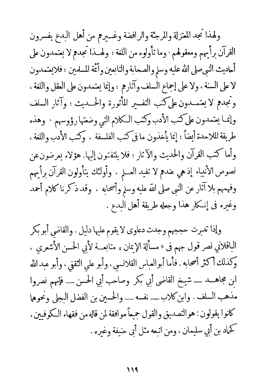 وَلِهَذَا تَجِدُ الْمُعْتَزِلَةَ وَالْمُرْجِئَةَ وَالرَّافِضَةَ وَغَيْرَهُمْ مِنْ أَهْلِ الْبِدَعِ يُفَسِّرُونَ الْقُرْآنَ بِرَأْيِهِمْ وَمَعْقُولِهِمْ وَمَا تَأَوَّلُوهُ مِنْ اللُّغَةِ؛ وَلِهَذَا تَجِدُهُمْ لَا يَعْتَمِدُونَ عَلَى أَحَادِيثِ النَّبِيِّ صَلَّى اللَّهُ عَلَيْهِ وَسَلَّمَ وَالصَّحَابَةِ وَالتَّابِعِينَ وَأَئِمَّةِ الْمُسْلِمِينَ؛ فَلَا يَعْتَمِدُونَ لَا عَلَى السُّنَّةِ وَلَا عَلَى إجْمَاعِ السَّلَفِ وَآثَارِهِمْ؛ وَإِنَّمَا يَعْتَمِدُونَ عَلَى الْعَقْلِ وَاللُّغَةِ وَتَجِدُهُمْ لَا يَعْتَمِدُونَ عَلَى كُتُبِ التَّفْسِيرِ الْمَأْثُورَةِ وَالْحَدِيثِ؛ وَآثَارِ السَّلَفِ وَإِنَّمَا يَعْتَمِدُونَ عَلَى كُتُبِ الْأَدَبِ وَكُتُبِ الْكَلَامِ الَّتِي وَضَعَتْهَا رُءُوسُهُمْ وَهَذِهِ طَرِيقَةُ الْمَلَاحِدَةِ أَيْضًا؛ إنَّمَا يَأْخُذُونَ مَا فِي كُتُبِ الْفَلْسَفَةِ وَكُتُبِ الْأَدَبِ وَاللُّغَةِ وَأَمَّا كُتُبُ الْقُرْآنِ وَالْحَدِيثِ وَالْآثَارِ؛ فَلَا يَلْتَفِتُونَ إلَيْهَا. هَؤُلَاءِ يُعْرِضُونَ عَنْ نُصُوصِ الْأَنْبِيَاءِ إذْ هِيَ عِنْدَهُمْ لَا تُفِيدُ الْعِلْمَ وَأُولَئِكَ يَتَأَوَّلُونَ الْقُرْآنَ بِرَأْيِهِمْ وَفَهْمِهِمْ بِلَا آثَارٍ عَنْ النَّبِيِّ صَلَّى اللَّهُ عَلَيْهِ وَسَلَّمَ وَأَصْحَابِهِ وَقَدْ ذَكَرْنَا كَلَامَ أَحْمَد وَغَيْرِهِ فِي إنْكَارِ هَذَا وَجَعْلِهِ طَرِيقَةَ أَهْلِ الْبِدَعِ. وَإِذَا تَدَبَّرْتَ حُجَجَهُمْ وَجَدْت دَعَاوَى لَا يَقُومُ عَلَيْهَا دَلِيلٌ. وَالْقَاضِي أَبُو بَكْرٍ الْبَاقِلَانِي نَصَرَ قَوْلَ جَهْمٍ فِي " مَسْأَلَةِ الْإِيمَانِ " مُتَابَعَةً لِأَبِي الْحَسَنِ الْأَشْعَرِيِّ وَكَذَلِكَ أَكْثَرُ أَصْحَابِهِ. فَأَمَّا أَبُو الْعَبَّاسِ القلانسي وَأَبُو عَلِيٍّ الثَّقَفِيُّ وَأَبُو عَبْدِ اللَّهِ بْنُ مُجَاهِدٍ شَيْخُ الْقَاضِي أَبِي بَكْرٍ وَصَاحِبُ أَبِي الْحَسَنِ - فَإِنَّهُمْ نَصَرُوا مَذْهَبَ السَّلَفِ. وَابْنُ كِلَابٍ - نَفْسُهُ - وَالْحُسَيْنُ بْنُ الْفَضْلِ البجلي وَنَحْوُهُمَا كَانُوا يَقُولُونَ: هُوَ التَّصْدِيقُ وَالْقَوْلُ جَمِيعًا مُوَافَقَةً لِمَنْ قَالَهُ مِنْ فُقَهَاءِ الْكُوفِيِّينَ كَحَمَّادِ بْنِ أَبِي سُلَيْمَانَ وَمَنْ اتَّبَعَهُ مِثْلِ أَبِي حَنِيفَةَ وَغَيْرِهِ.