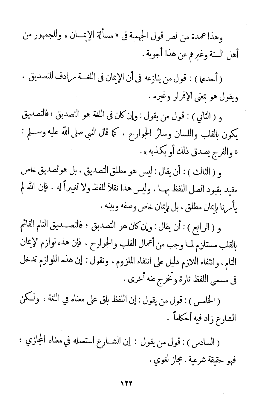 وَالثَّالِثُ: أَنْ يُقَالَ: لَيْسَ هُوَ مُطْلَقَ التَّصْدِيقِ بَلْ هُوَ تَصْدِيقٌ خَاصٌّ مُقَيَّدٌ بِقُيُودِ اتَّصَلَ اللَّفْظُ بِهَا وَلَيْسَ هَذَا نَقْلًا لِلَّفْظِ وَلَا تَغْيِيرًا لَهُ فَإِنَّ اللَّهَ لَمْ يَأْمُرْنَا بِإِيمَانِ مُطْلَقٍ بَلْ بِإِيمَانِ خَاصٍّ وَصَفَهُ وَبَيَّنَهُ.