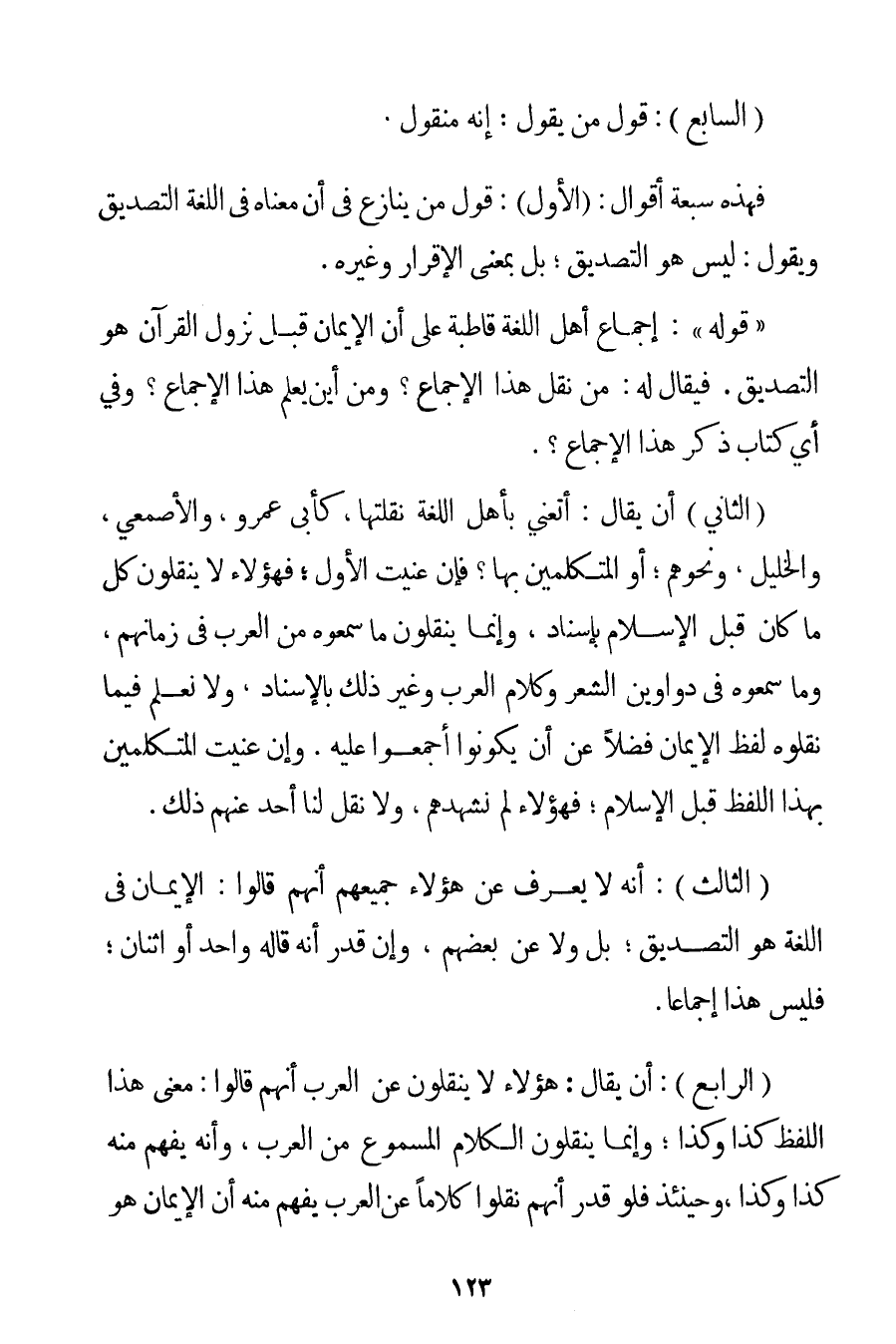 السَّابِعُ: قَوْلُ مَنْ يَقُولُ: إنَّهُ مَنْقُولٌ. فَهَذِهِ سَبْعَةُ أَقْوَالٍ: (الْأَوَّلُ) : قَوْلُ مَنْ يُنَازِعُ فِي أَنَّ مَعْنَاهُ فِي اللُّغَةِ التَّصْدِيقُ وَيَقُولُ: لَيْسَ هُوَ التَّصْدِيقَ؛ بَلْ بِمَعْنَى الْإِقْرَارِ وَغَيْرِهِ. " قَوْلُهُ ": إجْمَاعُ أَهْلِ اللُّغَةِ قَاطِبَةً عَلَى أَنَّ الْإِيمَانَ قَبْلَ نُزُولِ الْقُرْآنِ هُوَ التَّصْدِيقُ. فَيُقَالُ لَهُ: مَنْ نَقَلَ هَذَا الْإِجْمَاعَ؟ وَمِنْ أَيْنَ يُعْلَمُ هَذَا الْإِجْمَاعُ؟ وَفِي أَيِّ كِتَابٍ ذُكِرَ هَذَا الْإِجْمَاعُ؟ . (الثَّانِي) : أَنْ يُقَالَ: أَتَعْنِي بِأَهْلِ اللُّغَةِ نَقَلَتَهَا كَأَبِي عَمْرٍو وَالْأَصْمَعِيِّ وَالْخَلِيلِ وَنَحْوِهِمْ؛ أَوْ الْمُتَكَلِّمِينَ بِهَا؟ فَإِنْ عَنَيْت الْأَوَّلَ؛ فَهَؤُلَاءِ لَا يَنْقُلُونَ كُلَّ مَا كَانَ قَبْلَ الْإِسْلَامِ بِإِسْنَادِ وَإِنَّمَا يَنْقُلُونَ مَا سَمِعُوهُ مِنْ الْعَرَبِ فِي زَمَانِهِمْ وَمَا سَمِعُوهُ فِي دَوَاوِينِ الشِّعْرِ وَكَلَامِ الْعَرَبِ وَغَيْرِ ذَلِكَ بِالْإِسْنَادِ وَلَا نَعْلَمُ فِيمَا نَقَلُوهُ لَفْظَ الْإِيمَانِ فَضْلًا عَنْ أَنْ يَكُونُوا أَجْمَعُوا عَلَيْهِ. وَإِنْ عَنَيْت الْمُتَكَلِّمِينَ بِهَذَا اللَّفْظِ قَبْلَ الْإِسْلَامِ؛ فَهَؤُلَاءِ لَمْ نَشْهَدْهُمْ وَلَا نَقَلَ لَنَا أَحَدٌ عَنْهُمْ ذَلِكَ. (الثَّالِثُ) : أَنَّهُ لَا يُعْرَفُ عَنْ هَؤُلَاءِ جَمِيعِهِمْ أَنَّهُمْ قَالُوا: الْإِيمَانُ فِي اللُّغَةِ هُوَ التَّصْدِيقُ؛ بَلْ وَلَا عَنْ بَعْضِهِمْ وَإِنْ قُدِّرَ أَنَّهُ قَالَهُ وَاحِدٌ أَوْ اثْنَانِ؛ فَلَيْسَ هَذَا إجْمَاعًا. (الرَّابِعُ) : أَنْ يُقَالَ: هَؤُلَاءِ لَا يَنْقُلُونَ عَنْ الْعَرَبِ أَنَّهُمْ قَالُوا: مَعْنَى هَذَا اللَّفْظِ كَذَا وَكَذَا؛ وَإِنَّمَا يَنْقُلُونَ الْكَلَامَ الْمَسْمُوعَ مِنْ الْعَرَبِ وَأَنَّهُ يُفْهَمُ مِنْهُ كَذَا وَكَذَا وَحِينَئِذٍ فَلَوْ قُدِّرَ أَنَّهُمْ نَقَلُوا كَلَامًا عَنْ الْعَرَبِ يُفْهَمُ مِنْهُ أَنَّ الْإِيمَانَ هُوَ