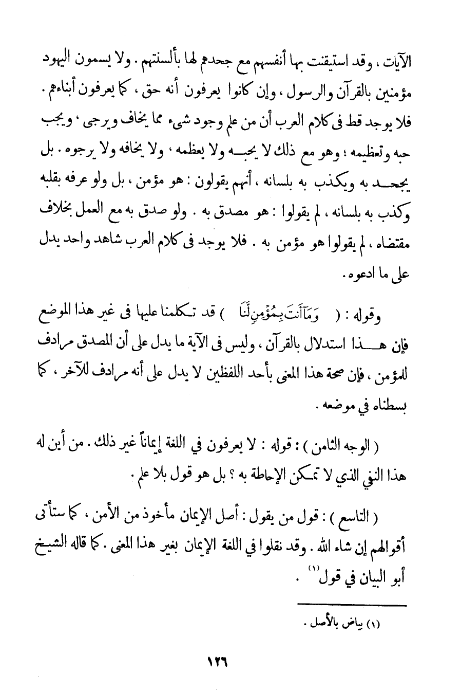 الْآيَاتِ وَقَدْ اسْتَيْقَنَتْ بِهَا أَنْفُسُهُمْ مَعَ جَحْدِهِمْ لَهَا بِأَلْسِنَتِهِمْ، وَلَا يُسَمُّونَ الْيَهُودَ مُؤْمِنِينَ بِالْقُرْآنِ وَالرَّسُولِ وَإِنْ كَانُوا يَعْرِفُونَ أَنَّهُ حَقٌّ كَمَا يَعْرِفُونَ أَبْنَاءَهُمْ. فَلَا يُوجَدُ قَطُّ فِي كَلَامِ الْعَرَبِ أَنَّ مَنْ عَلِمَ وُجُودَ شَيْءٍ مِمَّا يُخَافُ وَيُرْجَى وَيَجِبُ حُبُّهُ وَتَعْظِيمُهُ؛ وَهُوَ مَعَ ذَلِكَ لَا يُحِبُّهُ وَلَا يُعَظِّمُهُ وَلَا يَخَافُهُ وَلَا يَرْجُوهُ، بَلْ يَجْحَدُ بِهِ وَيُكَذِّبُ بِهِ بِلِسَانِهِ أَنَّهُمْ يَقُولُونَ: هُوَ مُؤْمِنٌ، بَلْ وَلَوْ عَرَفَهُ بِقَلْبِهِ وَكَذَّبَ بِهِ بِلِسَانِهِ لَمْ يَقُولُوا: هُوَ مُصَدِّقٌ بِهِ. وَلَوْ صَدَّقَ بِهِ مَعَ الْعَمَلِ بِخِلَافِ مُقْتَضَاهُ لَمْ يَقُولُوا هُوَ مُؤْمِنٌ بِهِ. فَلَا يُوجَدُ فِي كَلَامِ الْعَرَبِ شَاهِدٌ وَاحِدٌ يَدُلُّ عَلَى مَا ادَّعَوْهُ. وَقَوْلُهُ: {وَمَا أَنْتَ بِمُؤْمِنٍ لَنَا} قَدْ تَكَلَّمْنَا عَلَيْهَا فِي غَيْرِ هَذَا الْمَوْضِعِ فَإِنَّ هَذَا اسْتِدْلَالٌ بِالْقُرْآنِ وَلَيْسَ فِي الْآيَةِ مَا يَدُلُّ عَلَى أَنَّ الْمُصَدِّقَ مُرَادِفٌ لِلْمُؤْمِنِ فَإِنَّ صِحَّةَ هَذَا الْمَعْنَى بِأَحَدِ اللَّفْظَيْنِ لَا يَدُلُّ عَلَى أَنَّهُ مُرَادِفٌ لِلْآخَرِ كَمَا بَسَطْنَاهُ فِي مَوْضِعِهِ. (الْوَجْهُ الثَّامِنُ) : قَوْلُهُ: لَا يَعْرِفُونَ فِي اللُّغَةِ إيمَانًا غَيْرَ ذَلِكَ. مِنْ أَيْنَ لَهُ هَذَا النَّفْيُ الَّذِي لَا تُمْكِنُ الْإِحَاطَةُ بِهِ؟ بَلْ هُوَ قَوْل بِلَا عِلْمٍ. (التَّاسِعُ) : قَوْل مَنْ يَقُولُ: أَصْلُ الْإِيمَانِ مَأْخُوذٌ مِنْ الْأَمْنِ كَمَا سَتَأْتِي أَقْوَالُهُمْ إنْ شَاءَ اللَّهُ. وَقَدْ نَقَلُوا فِي اللُّغَةِ الْإِيمَانَ بِغَيْرِ هَذَا الْمَعْنَى. كَمَا قَالَهُ الشَّيْخُ أَبُو الْبَيَانِ فِي قَوْل (1) .