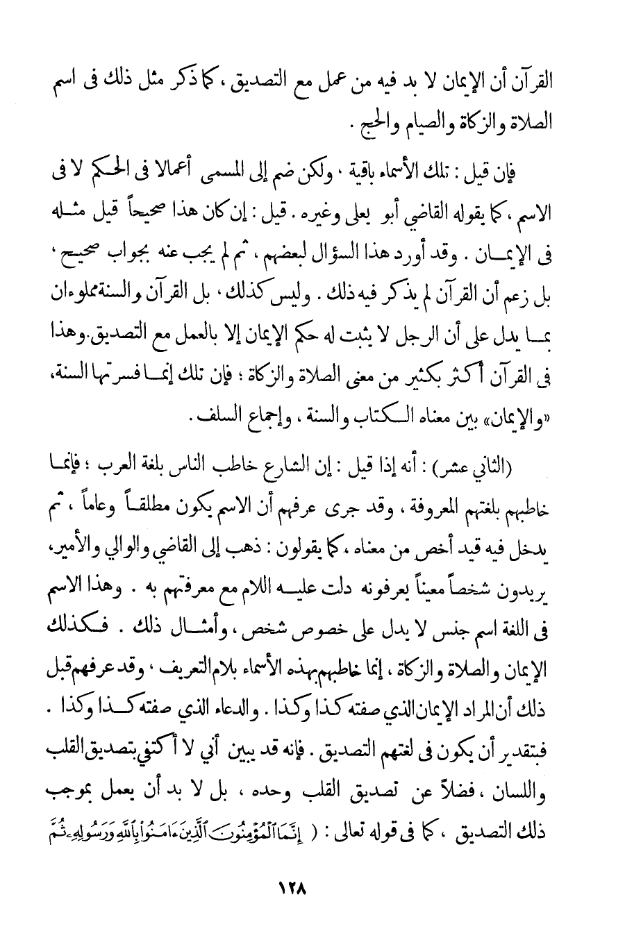 الْقُرْآنِ أَنَّ الْإِيمَانَ لَا بُدَّ فِيهِ مِنْ عَمَلٍ مَعَ التَّصْدِيقِ كَمَا ذُكِرَ مِثْلُ ذَلِكَ فِي اسْمِ الصَّلَاةِ وَالزَّكَاةِ وَالصِّيَامِ وَالْحَجِّ. فَإِنْ قِيلَ: تِلْكَ الْأَسْمَاءُ بَاقِيَةٌ وَلَكِنْ ضَمَّ إلَى الْمُسَمَّى أَعْمَالًا فِي الْحُكْمِ لَا فِي الِاسْمِ كَمَا يَقُولُهُ الْقَاضِي أَبُو يَعْلَى وَغَيْرُهُ. قِيلَ: إنْ كَانَ هَذَا صَحِيحًا قِيلَ مِثْلُهُ فِي الْإِيمَانِ. وَقَدْ أَوْرَدَ هَذَا السُّؤَالَ لِبَعْضِهِمْ ثُمَّ لَمْ يُجِبْ عَنْهُ بِجَوَابِ صَحِيحٍ بَلْ زَعَمَ أَنَّ الْقُرْآنَ لَمْ يُذْكَرْ فِيهِ ذَلِكَ. وَلَيْسَ كَذَلِكَ بَلْ الْقُرْآنُ وَالسُّنَّةُ مَمْلُوءَانِ بِمَا يَدُلُّ عَلَى أَنَّ الرَّجُلَ لَا يَثْبُتُ لَهُ حُكْمُ الْإِيمَانِ إلَّا بِالْعَمَلِ مَعَ التَّصْدِيقِ. وَهَذَا فِي الْقُرْآنِ أَكْثَرُ بِكَثِيرِ مِنْ مَعْنَى الصَّلَاةِ وَالزَّكَاةِ. فَإِنَّ تِلْكَ إنَّمَا فَسَّرَتْهَا السُّنَّةُ " وَالْإِيمَانُ " بَيَّنَ مَعْنَاهُ الْكِتَابُ وَالسُّنَّةُ وَإِجْمَاعُ السَّلَفِ. (الثَّانِيَ عَشَرَ) : أَنَّهُ إذَا قِيلَ: إنَّ الشَّارِعَ خَاطَبَ النَّاسَ بِلُغَةِ الْعَرَبِ؛ فَإِنَّمَا خَاطَبَهُمْ بِلُغَتِهِمْ الْمَعْرُوفَةِ وَقَدْ جَرَى عُرْفُهُمْ أَنَّ الِاسْمَ يَكُونُ مُطْلَقًا وَعَامًّا ثُمَّ يَدْخُلُ فِيهِ قَيْدٌ أَخَصُّ مِنْ مَعْنَاهُ كَمَا يَقُولُونَ: ذَهَبَ إلَى الْقَاضِي وَالْوَالِي وَالْأَمِيرِ يُرِيدُونَ شَخْصًا مُعَيَّنًا يَعْرِفُونَهُ دَلَّتْ عَلَيْهِ اللَّامُ مَعَ مَعْرِفَتِهِمْ بِهِ. وَهَذَا الِاسْمُ فِي اللُّغَةِ اسْمُ جِنْسٍ لَا يَدُلُّ عَلَى خُصُوصِ شَخْصٍ وَأَمْثَالِ ذَلِكَ. فَكَذَلِكَ الْإِيمَانُ وَالصَّلَاةُ وَالزَّكَاةُ إنَّمَا خَاطَبَهُمْ بِهَذِهِ الْأَسْمَاءِ بِلَامِ التَّعْرِيفِ وَقَدْ عَرَّفَهُمْ قَبْلَ ذَلِكَ أَنَّ الْمُرَادَ الْإِيمَانُ الَّذِي صِفَتُهُ كَذَا وَكَذَا. وَالدُّعَاءُ الَّذِي صِفَتُهُ كَذَا وَكَذَا. فَبِتَقْدِيرِ أَنْ يَكُونَ فِي لُغَتِهِمْ التَّصْدِيقُ. فَإِنَّهُ قَدْ يُبَيِّنُ أَنِّي لَا أَكْتَفِي بِتَصْدِيقِ الْقَلْبِ وَاللِّسَانِ فَضْلًا عَنْ تَصْدِيقِ الْقَلْبِ وَحْدَهُ بَلْ لَا بُدَّ أَنْ يَعْمَلَ بِمُوجِبِ ذَلِكَ التَّصْدِيقِ كَمَا فِي قَوْله تَعَالَى {إنَّمَا الْمُؤْمِنُونَ الَّذِينَ آمَنُوا بِاللَّهِ وَرَسُولِهِ ثُمَّ