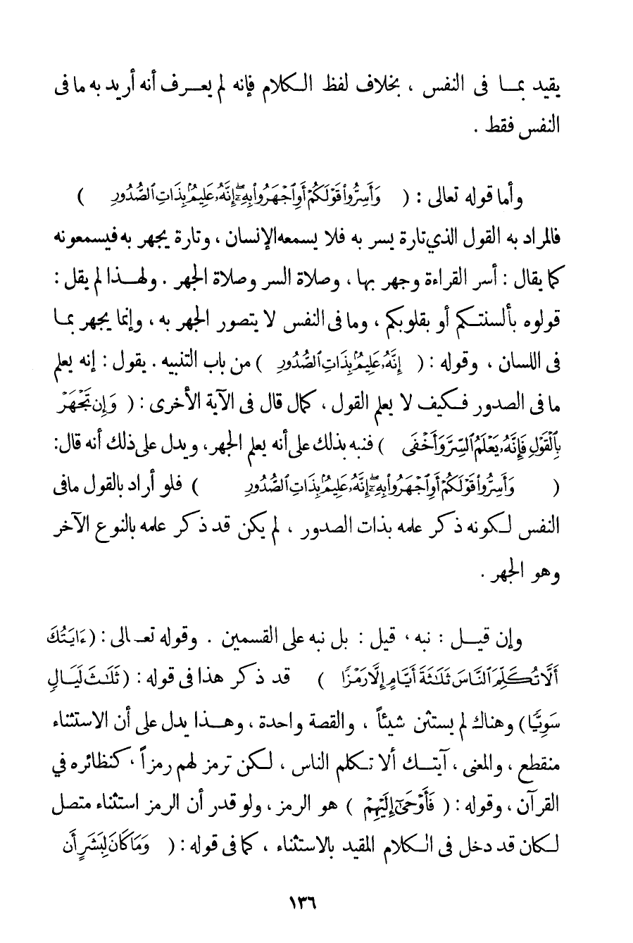 يُقَيَّدُ بِمَا فِي النَّفْسِ بِخِلَافِ لَفْظِ الْكَلَامِ فَإِنَّهُ لَمْ يُعْرَفْ أَنَّهُ أُرِيدَ بِهِ مَا فِي النَّفْسِ فَقَطْ. وَأَمَّا قَوْله تَعَالَى {وَأَسِرُّوا قَوْلَكُمْ أَوِ اجْهَرُوا بِهِ إنَّهُ عَلِيمٌ بِذَاتِ الصُّدُورِ} فَالْمُرَادُ بِهِ الْقَوْلُ الَّذِي تَارَةً يُسِرُّ بِهِ فَلَا يَسْمَعُهُ الْإِنْسَانُ وَتَارَةً يَجْهَرُ بِهِ فَيَسْمَعُونَهُ كَمَا يُقَالُ: أَسَرَّ الْقِرَاءَةَ وَجَهَرَ بِهَا وَصَلَاةُ السِّرِّ وَصَلَاةُ الْجَهْرِ. وَلِهَذَا لَمْ يَقُلْ: قُولُوهُ بِأَلْسِنَتِكُمْ أَوْ بِقُلُوبِكُمْ وَمَا فِي النَّفْسِ لَا يُتَصَوَّرُ الْجَهْرُ بِهِ وَإِنَّمَا يُجْهَرُ بِمَا فِي اللِّسَانِ وَقَوْلُهُ: {إنَّهُ عَلِيمٌ بِذَاتِ الصُّدُورِ} مِنْ بَابِ التَّنْبِيهِ. يَقُولُ: إنَّهُ يَعْلَمُ مَا فِي الصُّدُورِ فَكَيْفَ لَا يَعْلَمُ الْقَوْلَ كَمَا قَالَ فِي الْآيَةِ الْأُخْرَى: {وَإِنْ تَجْهَرْ بِالْقَوْلِ فَإِنَّهُ يَعْلَمُ السِّرَّ وَأَخْفَى} فَنَبَّهَ بِذَلِكَ عَلَى أَنَّهُ يَعْلَمُ الْجَهْرَ وَيَدُلُّ عَلَى ذَلِكَ أَنَّهُ قَالَ: {وَأَسِرُّوا قَوْلَكُمْ أَوِ اجْهَرُوا بِهِ إنَّهُ عَلِيمٌ بِذَاتِ الصُّدُورِ} فَلَوْ أَرَادَ بِالْقَوْلِ مَا فِي النَّفْسِ لِكَوْنِهِ ذَكَرَ عِلْمَهُ بِذَاتِ الصُّدُورِ لَمْ يَكُنْ قَدْ ذَكَرَ عِلْمَهُ بِالنَّوْعِ الْآخَرِ وَهُوَ الْجَهْرُ. وَإِنْ قِيلَ: نَبَّهَ، قِيلَ: بَلْ نَبَّهَ عَلَى الْقِسْمَيْنِ. وقَوْله تَعَالَى {آيَتُكَ أَلَّا تُكَلِّمَ النَّاسَ ثَلَاثَةَ أَيَّامٍ إلَّا رَمْزًا} قَدْ ذَكَرَ هَذَا فِي قَوْلِهِ: {ثَلَاثَ لَيَالٍ سَوِيًّا} وَهُنَاكَ لَمْ يَسْتَثْنِ شَيْئًا، وَالْقِصَّةُ وَاحِدَةٌ وَهَذَا يَدُلُّ عَلَى أَنَّ الِاسْتِثْنَاءَ مُنْقَطِعٌ وَالْمَعْنَى آيَتُك أَلَّا تُكَلِّمَ النَّاسَ لَكِنْ تَرْمُزُ لَهُمْ رَمْزًا كَنَظَائِرِهِ فِي الْقُرْآنِ، وَقَوْلُهُ: {فَأَوْحَى إلَيْهِمْ} هُوَ الرَّمْزُ وَلَوْ قُدِّرَ أَنَّ الرَّمْزَ اسْتِثْنَاءٌ مُتَّصِلٌ لَكَانَ قَدْ دَخَلَ فِي الْكَلَامِ الْمُقَيَّدِ بِالِاسْتِثْنَاءِ كَمَا فِي قَوْلِهِ: {وَمَا كَانَ لِبَشَرٍ أَنْ