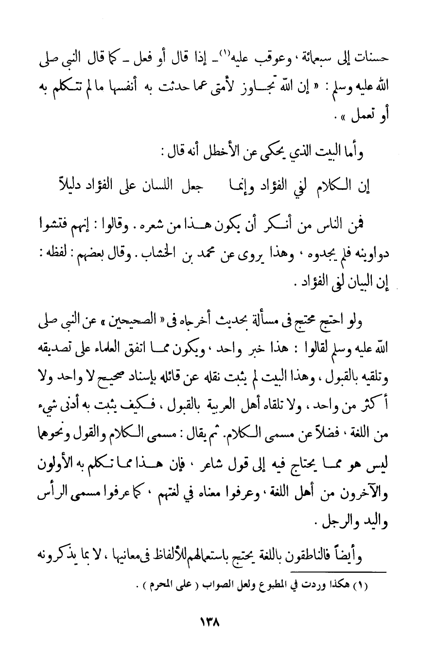 فَمِنْ النَّاسِ مَنْ أَنْكَرَ أَنْ يَكُونَ هَذَا مِنْ شِعْرِهِ. وَقَالُوا: إنَّهُمْ فَتَّشُوا دَوَاوِينَهُ فَلَمْ يَجِدُوهُ، وَهَذَا يُرْوَى عَنْ مُحَمَّدِ بْنِ الْخَشَّابِ. وَقَالَ بَعْضُهُمْ: لَفْظُهُ: إنَّ الْبَيَانَ لَفِي الْفُؤَادِ. وَلَوْ احْتَجَّ مُحْتَجٌّ فِي مَسْأَلَةٍ بِحَدِيثِ أَخْرَجَاهُ فِي " الصَّحِيحَيْنِ " عَنْ النَّبِيِّ صَلَّى اللَّهُ عَلَيْهِ وَسَلَّمَ لَقَالُوا: هَذَا خَبَرٌ وَاحِدٌ وَيَكُونُ مِمَّا اتَّفَقَ الْعُلَمَاءُ عَلَى تَصْدِيقِهِ وَتَلَقِّيهِ بِالْقَبُولِ وَهَذَا الْبَيْتُ لَمْ يُثْبِتْ نَقْلَهُ عَنْ قَائِلِهِ بِإِسْنَادِ صَحِيحٍ لَا وَاحِدٌ وَلَا أَكْثَرُ مِنْ وَاحِدٍ وَلَا تَلَقَّاهُ أَهْلُ الْعَرَبِيَّةِ بِالْقَبُولِ فَكَيْفَ يَثْبُتُ بِهِ أَدْنَى شَيْءٍ مِنْ اللُّغَةِ فَضْلًا عَنْ مُسَمَّى الْكَلَامِ. ثُمَّ يُقَالُ: مُسَمَّى الْكَلَامِ وَالْقَوْلِ وَنَحْوِهِمَا لَيْسَ هُوَ مِمَّا يُحْتَاجُ فِيهِ إلَى قَوْلِ شَاعِرٍ فَإِنَّ هَذَا مِمَّا تَكَلَّمَ بِهِ الْأَوَّلُونَ والآخرون مِنْ أَهْلِ اللُّغَةِ وَعَرَفُوا مَعْنَاهُ فِي لُغَتِهِمْ كَمَا عَرَفُوا مُسَمَّى الرَّأْسِ وَالْيَدِ وَالرِّجْلِ. وَأَيْضًا فَالنَّاطِقُونَ بِاللُّغَةِ يُحْتَجُّ بِاسْتِعْمَالِهِمْ لِلْأَلْفَاظِ فِي مَعَانِيهَا لَا بِمَا يَذْكُرُونَهُ