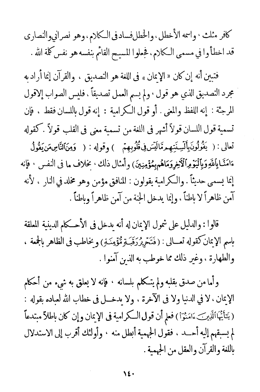 كَافِرٌ مُثَلِّثٌ وَاسْمُهُ الْأَخْطَلُ وَالْخَطَلُ فَسَادٌ فِي الْكَلَامِ وَهُوَ نَصْرَانِيٌّ وَالنَّصَارَى قَدْ أَخْطَئُوا فِي مُسَمَّى الْكَلَامِ فَجَعَلُوا الْمَسِيحَ الْقَائِمَ بِنَفْسِهِ هُوَ نَفْسَ كَلِمَةِ اللَّهِ. فَتَبَيَّنَ أَنَّهُ إنْ كَانَ " الْإِيمَانُ " فِي اللُّغَةِ هُوَ التَّصْدِيقَ وَالْقُرْآنُ إنَّمَا أَرَادَ بِهِ مُجَرَّدَ التَّصْدِيقِ الَّذِي هُوَ قَوْلٌ وَلَمْ يُسَمِّ الْعَمَلَ تَصْدِيقًا فَلَيْسَ الصَّوَابُ إلَّا قَوْلُ الْمُرْجِئَةِ: إنَّهُ اللَّفْظُ وَالْمَعْنَى. أَوْ قَوْلُ الكَرَّامِيَة: إنَّهُ قَوْلٌ بِاللِّسَانِ فَقَطْ فَإِنَّ تَسْمِيَةَ قَوْلِ اللِّسَانِ قَوْلًا أَشْهَرُ فِي اللُّغَةِ مِنْ تَسْمِيَةِ مَعْنًى فِي الْقَلْبِ قَوْلًا. كَقَوْلِهِ تَعَالَى: {يَقُولُونَ بِأَلْسِنَتِهِمْ مَا لَيْسَ فِي قُلُوبِهِمْ} وَقَوْلُهُ: {وَمِنَ النَّاسِ مَنْ يَقُولُ آمَنَّا بِاللَّهِ وَبِالْيَوْمِ الْآخِرِ وَمَا هُمْ بِمُؤْمِنِينَ} وَأَمْثَالُ ذَلِكَ بِخِلَافِ مَا فِي النَّفْسِ فَإِنَّهُ إنَّمَا يُسَمَّى حَدِيثًا. والكَرَّامِيَة يَقُولُونَ: الْمُنَافِقُ مُؤْمِنٌ وَهُوَ مُخَلَّدٌ فِي النَّارِ لِأَنَّهُ آمَنَ ظَاهِرًا لَا بَاطِنًا وَإِنَّمَا يَدْخُلُ الْجَنَّةَ مَنْ آمَنَ ظَاهِرًا وَبَاطِنًا. قَالُوا: وَالدَّلِيلُ عَلَى شُمُولِ الْإِيمَانِ لَهُ أَنَّهُ يَدْخُلُ فِي الْأَحْكَامِ الدِّينِيَّةِ الْمُتَعَلِّقَةِ بِاسْمِ الْإِيمَانِ كَقَوْلِهِ تَعَالَى: {فَتَحْرِيرُ رَقَبَةٍ مُؤْمِنَةٍ} وَيُخَاطَبُ فِي الظَّاهِرِ بِالْجُمُعَةِ وَالطَّهَارَةِ وَغَيْرِ ذَلِكَ مِمَّا خُوطِبَ بِهِ الَّذِينَ آمَنُوا. وَأَمَّا مَنْ صَدَّقَ بِقَلْبِهِ وَلَمْ يَتَكَلَّمْ بِلِسَانِهِ فَإِنَّهُ لَا يَتَعَلَّقُ بِهِ شَيْءٌ مِنْ أَحْكَامِ الْإِيمَانِ لَا فِي الدُّنْيَا وَلَا فِي الْآخِرَةِ وَلَا يَدْخُلُ فِي خِطَابِ اللَّهِ لِعِبَادِهِ بِقَوْلِهِ: {يَا أَيُّهَا الَّذِينَ آمَنُوا} فَعُلِمَ أَنَّ قَوْلَ الكَرَّامِيَة فِي الْإِيمَانِ وَإِنْ كَانَ بَاطِلًا مُبْتَدَعًا لَمْ يَسْبِقْهُمْ إلَيْهِ أَحَدٌ فَقَوْلُ الْجَهْمِيَّة أَبْطَلُ مِنْهُ وَأُولَئِكَ أَقْرَبُ إلَى الِاسْتِدْلَالِ بِاللُّغَةِ وَالْقُرْآنِ وَالْعَقْلِ مِنْ الْجَهْمِيَّة.