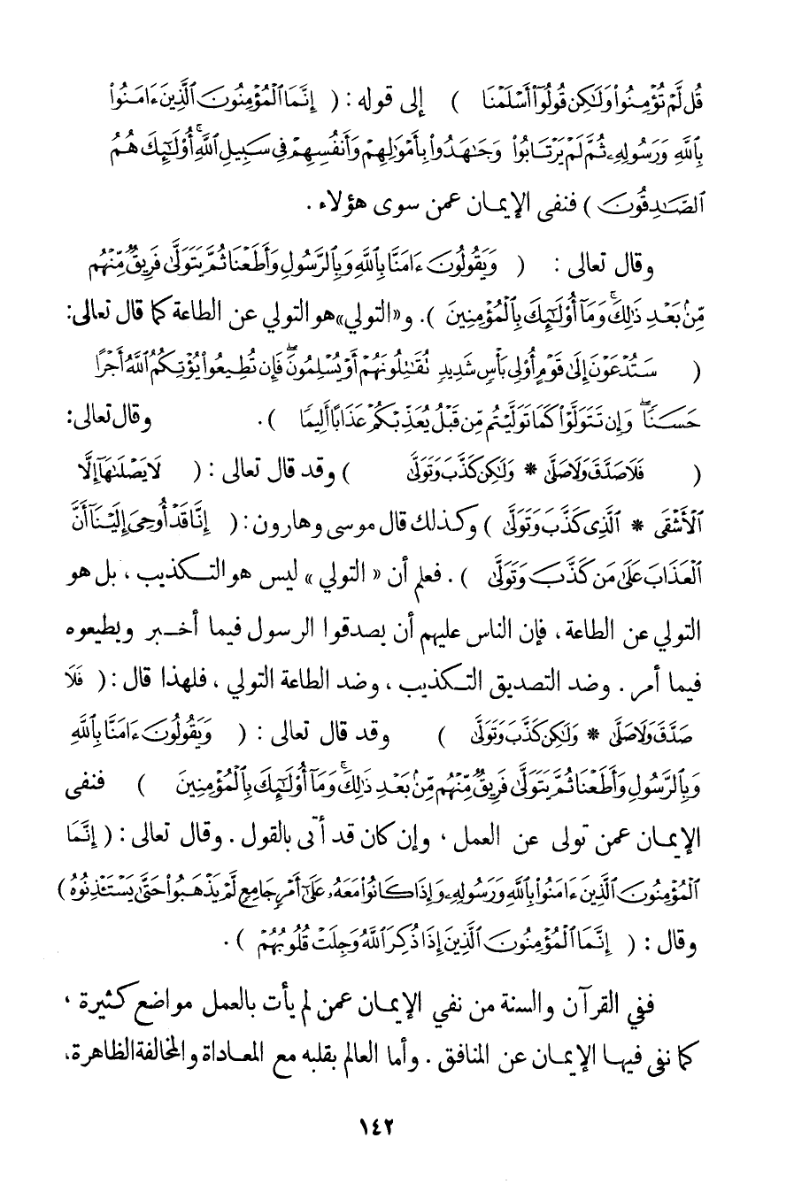 قُلْ لَمْ تُؤْمِنُوا وَلَكِنْ قُولُوا أَسْلَمْنَا} إلَى قَوْلِهِ: {إنَّمَا الْمُؤْمِنُونَ الَّذِينَ آمَنُوا بِاللَّهِ وَرَسُولِهِ ثُمَّ لَمْ يَرْتَابُوا وَجَاهَدُوا بِأَمْوَالِهِمْ وَأَنْفُسِهِمْ فِي سَبِيلِ اللَّهِ أُولَئِكَ هُمُ الصَّادِقُونَ} فَنَفَى الْإِيمَانَ عَمَّنْ سِوَى هَؤُلَاءِ. وَقَالَ تَعَالَى: {وَيَقُولُونَ آمَنَّا بِاللَّهِ وَبِالرَّسُولِ وَأَطَعْنَا ثُمَّ يَتَوَلَّى فَرِيقٌ مِنْهُمْ مِنْ بَعْدِ ذَلِكَ وَمَا أُولَئِكَ بِالْمُؤْمِنِينَ} . و " التَّوَلِّي " هُوَ التَّوَلِّي عَنْ الطَّاعَةِ كَمَا قَالَ تَعَالَى: {سَتُدْعَوْنَ إلَى قَوْمٍ أُولِي بَأْسٍ شَدِيدٍ تُقَاتِلُونَهُمْ أَوْ يُسْلِمُونَ فَإِنْ تُطِيعُوا يُؤْتِكُمُ اللَّهُ أَجْرًا حَسَنًا وَإِنْ تَتَوَلَّوْا كَمَا تَوَلَّيْتُمْ مِنْ قَبْلُ يُعَذِّبْكُمْ عَذَابًا أَلِيمًا} . وَقَالَ تَعَالَى: {فَلَا صَدَّقَ وَلَا صَلَّى} {وَلَكِنْ كَذَّبَ وَتَوَلَّى} وَقَدْ قَالَ تَعَالَى: {لَا يَصْلَاهَا إلَّا الْأَشْقَى} {الَّذِي كَذَّبَ وَتَوَلَّى} وَكَذَلِكَ قَالَ مُوسَى وَهَارُونُ: {إنَّا قَدْ أُوحِيَ إلَيْنَا أَنَّ الْعَذَابَ عَلَى مَنْ كَذَّبَ وَتَوَلَّى} . فَعُلِمَ أَنَّ " التَّوَلِّيَ " لَيْسَ هُوَ التَّكْذِيبَ بَلْ هُوَ التَّوَلِّي عَنْ الطَّاعَةِ فَإِنَّ النَّاسَ عَلَيْهِمْ أَنْ يُصَدِّقُوا الرَّسُولَ فِيمَا أَخْبَرَ وَيُطِيعُوهُ فِيمَا أَمَرَ. وَضِدُّ التَّصْدِيقِ التَّكْذِيبُ وَضِدُّ الطَّاعَةِ التَّوَلِّي فَلِهَذَا قَالَ: {فَلَا صَدَّقَ وَلَا صَلَّى} {وَلَكِنْ كَذَّبَ وَتَوَلَّى} وَقَدْ قَالَ تَعَالَى: {وَيَقُولُونَ آمَنَّا بِاللَّهِ وَبِالرَّسُولِ وَأَطَعْنَا ثُمَّ يَتَوَلَّى فَرِيقٌ مِنْهُمْ مِنْ بَعْدِ ذَلِكَ وَمَا أُولَئِكَ بِالْمُؤْمِنِينَ} فَنَفَى الْإِيمَانَ عَمَّنْ تَوَلَّى عَنْ الْعَمَلِ وَإِنْ كَانَ قَدْ أَتَى بِالْقَوْلِ. وَقَالَ تَعَالَى: {إنَّمَا الْمُؤْمِنُونَ الَّذِينَ آمَنُوا بِاللَّهِ وَرَسُولِهِ وَإِذَا كَانُوا مَعَهُ عَلَى أَمْرٍ جَامِعٍ لَمْ يَذْهَبُوا حَتَّى يَسْتَأْذِنُوهُ} وَقَالَ: {إنَّمَا الْمُؤْمِنُونَ الَّذِينَ إذَا ذُكِرَ اللَّهُ وَجِلَتْ قُلُوبُهُمْ} . فَفِي الْقُرْآنِ وَالسُّنَّةِ مِنْ نَفْيِ الْإِيمَانِ عَمَّنْ لَمْ يَأْتِ بِالْعَمَلِ مَوَاضِعُ كَثِيرَةٌ كَمَا نَفَى فِيهَا الْإِيمَانَ عَنْ الْمُنَافِقِ. وَأَمَّا الْعَالِمُ بِقَلْبِهِ مَعَ الْمُعَادَاةِ وَالْمُخَالَفَةِ الظَّاهِرَةِ