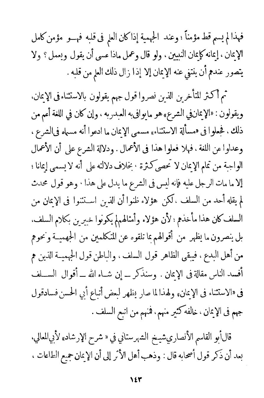 ثُمَّ أَكْثَرُ الْمُتَأَخِّرِينَ الَّذِينَ نَصَرُوا قَوْلَ جَهْمٍ يَقُولُونَ بِالِاسْتِثْنَاءِ فِي الْإِيمَانِ وَيَقُولُونَ: " الْإِيمَانُ فِي الشَّرْعِ " هُوَ مَا يُوَافِي بِهِ الْعَبْدُ رَبَّهُ وَإِنْ كَانَ فِي اللُّغَةِ أَعَمُّ مِنْ ذَلِكَ فَجَعَلُوا فِي " مَسْأَلَةِ الِاسْتِثْنَاءِ " مُسَمَّى الْإِيمَانِ مَا ادَّعَوْا أَنَّهُ مُسَمَّاهُ فِي الشَّرْعِ وَعَدَلُوا عَنْ اللُّغَةِ. فَهَلَّا فَعَلُوا هَذَا فِي الْأَعْمَالِ. وَدَلَالَةُ الشَّرْعِ عَلَى أَنَّ الْأَعْمَالَ الْوَاجِبَةَ مِنْ تَمَامِ الْإِيمَانِ لَا تُحْصَى كَثْرَةً بِخِلَافِ دَلَالَتِهِ عَلَى أَنَّهُ لَا يُسَمَّى إيمَانًا؛ إلَّا مَا مَاتَ الرَّجُلُ عَلَيْهِ فَإِنَّهُ لَيْسَ فِي الشَّرْعِ مَا يَدُلُّ عَلَى هَذَا وَهُوَ قَوْلٌ مُحْدَثٌ لَمْ يَقُلْهُ أَحَدٌ مِنْ السَّلَفِ لَكِنَّ هَؤُلَاءِ ظَنُّوا أَنَّ الَّذِينَ اسْتَثْنَوْا فِي الْإِيمَانِ مِنْ السَّلَفِ كَانَ هَذَا مَأْخَذَهُمْ؛ لِأَنَّ هَؤُلَاءِ وَأَمْثَالَهُمْ لَمْ يَكُونُوا خَبِيرِينَ بِكَلَامِ السَّلَفِ بَلْ يَنْصُرُونَ مَا يَظْهَرُ مِنْ أَقْوَالِهِمْ بِمَا تَلَقَّوْهُ عَنْ الْمُتَكَلِّمِينَ مِنْ الْجَهْمِيَّة وَنَحْوِهِمْ مِنْ أَهْلِ الْبِدَعِ فَيَبْقَى الظَّاهِرُ قَوْلُ السَّلَفِ وَالْبَاطِنُ قَوْلُ الْجَهْمِيَّة الَّذِينَ هُمْ أَفْسَدُ النَّاسِ مَقَالَةً فِي الْإِيمَانِ. وَسَنَذْكُرُ - إنْ شَاءَ اللَّهُ - أَقْوَالَ السَّلَفِ فِي " الِاسْتِثْنَاءِ فِي الْإِيمَانِ " وَلِهَذَا لَمَّا صَارَ يَظْهَرُ لِبَعْضِ أَتْبَاعِ أَبِي الْحَسَنِ فَسَادُ قَوْلِ جَهْمٍ فِي الْإِيمَانِ خَالَفَهُ كَثِيرٌ مِنْهُمْ فَمِنْهُمْ مَنْ اتَّبَعَ السَّلَفَ. قَالَ أَبُو الْقَاسِمِ الْأَنْصَارِيُّ شَيْخُ الشِّهْرِسْتَانِيّ فِي " شَرْحِ الْإِرْشَادِ " لِأَبِي الْمَعَالِي بَعْدَ أَنْ ذَكَرَ قَوْلَ أَصْحَابِهِ قَالَ: وَذَهَبَ أَهْلُ الْأَثَرِ إلَى أَنَّ الْإِيمَانَ جَمِيعُ الطَّاعَاتِ