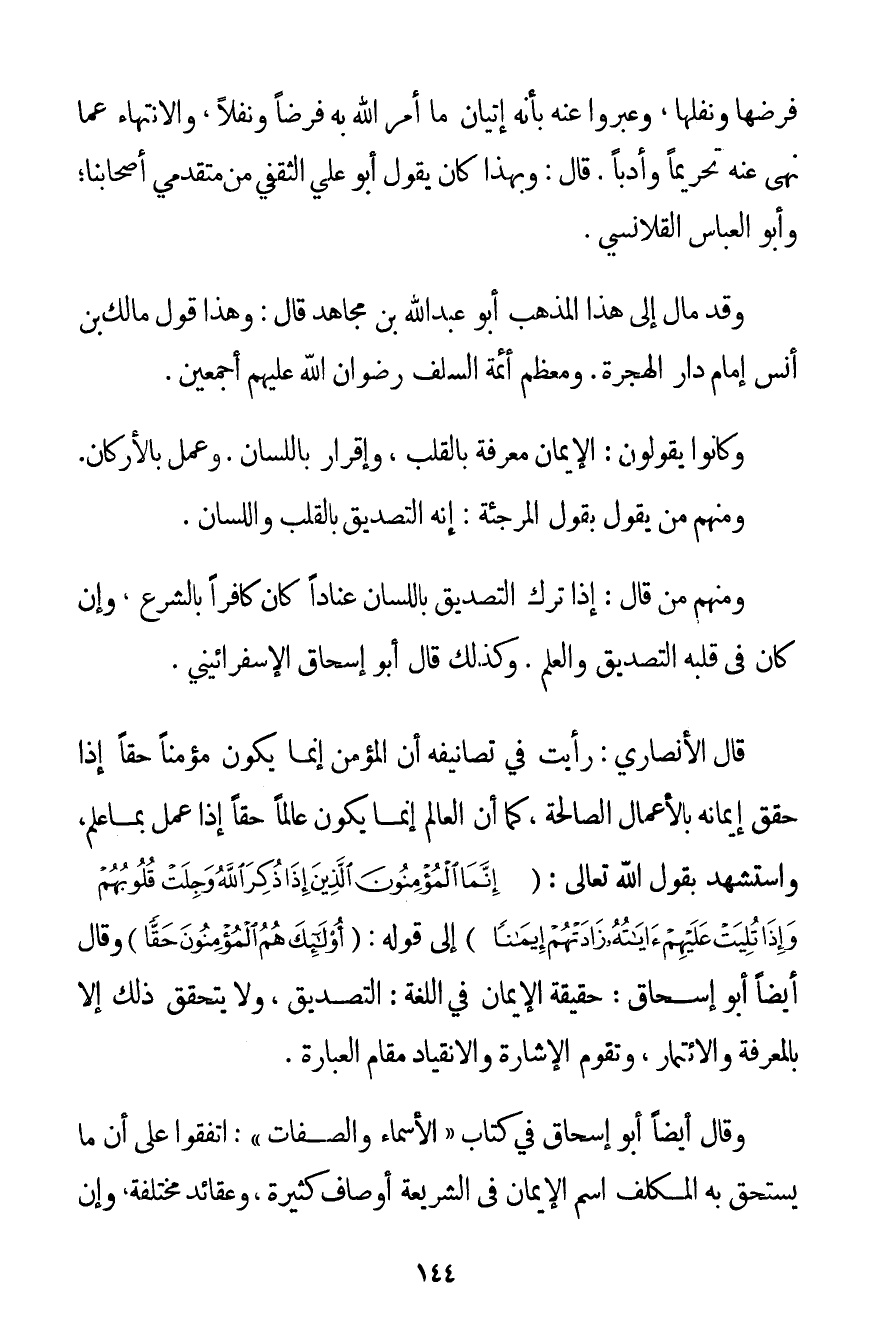 فَرْضِهَا وَنَفْلِهَا وَعَبَّرُوا عَنْهُ بِأَنَّهُ إتْيَانُ مَا أَمَرَ اللَّهُ بِهِ فَرْضًا وَنَفْلًا وَالِانْتِهَاءُ عَمَّا نَهَى عَنْهُ تَحْرِيمًا وَأَدَبًا. قَالَ: وَبِهَذَا كَانَ يَقُولُ أَبُو عَلِيٍّ الثَّقَفِيُّ مِنْ مُتَقَدِّمِي أَصْحَابِنَا؛ وَأَبُو الْعَبَّاسِ القلانسي. وَقَدْ مَالَ إلَى هَذَا الْمَذْهَبِ أَبُو عَبْدِ اللَّهِ بْنُ مُجَاهِدٍ قَالَ: وَهَذَا قَوْلُ مَالِكِ بْنِ أَنَسٍ إمَامِ دَارِ الْهِجْرَةِ، وَمُعْظَمِ أَئِمَّةِ السَّلَفِ رِضْوَانُ اللَّهِ عَلَيْهِمْ أَجْمَعِينَ. وَكَانُوا يَقُولُونَ: الْإِيمَانُ مَعْرِفَةٌ بِالْقَلْبِ وَإِقْرَارٌ بِاللِّسَانِ وَعَمَلٌ بِالْأَرْكَانِ. وَمِنْهُمْ مَنْ يَقُولُ بِقَوْلِ الْمُرْجِئَةِ: إنَّهُ التَّصْدِيقُ بِالْقَلْبِ وَاللِّسَانِ. وَمِنْهُمْ مَنْ قَالَ: إذَا تَرَكَ التَّصْدِيقَ بِاللِّسَانِ عِنَادًا كَانَ كَافِرًا بِالشَّرْعِ وَإِنْ كَانَ فِي قَلْبِهِ التَّصْدِيقُ وَالْعِلْمُ. وَكَذَلِكَ قَالَ أَبُو إسْحَاقَ الإسفراييني. قَالَ الْأَنْصَارِيُّ: رَأَيْت فِي تَصَانِيفِهِ أَنَّ الْمُؤْمِنَ إنَّمَا يَكُونُ مُؤْمِنًا حَقًّا إذَا حَقَّقَ إيمَانَهُ بِالْأَعْمَالِ الصَّالِحَةِ كَمَا أَنَّ الْعَالِمَ إنَّمَا يَكُونُ عَالِمًا حَقًّا إذَا عَمِلَ بِمَا عَلِمَ وَاسْتَشْهَدَ بِقَوْلِ اللَّهِ تَعَالَى: {إنَّمَا الْمُؤْمِنُونَ الَّذِينَ إذَا ذُكِرَ اللَّهُ وَجِلَتْ قُلُوبُهُمْ وَإِذَا تُلِيَتْ عَلَيْهِمْ آيَاتُهُ زَادَتْهُمْ إيمَانًا} إلَى قَوْلِهِ: {أُولَئِكَ هُمُ الْمُؤْمِنُونَ حَقًّا} وَقَالَ أَيْضًا أَبُو إسْحَاقَ: حَقِيقَةُ الْإِيمَانِ فِي اللُّغَةِ: التَّصْدِيقُ وَلَا يَتَحَقَّقُ ذَلِكَ إلَّا بِالْمَعْرِفَةِ والائتمار، وَتَقُومُ الْإِشَارَةُ وَالِانْقِيَادُ مَقَامَ الْعِبَارَةِ. وَقَالَ أَيْضًا أَبُو إسْحَاقَ فِي كِتَابِ " الْأَسْمَاءِ وَالصِّفَاتِ ": اتَّفَقُوا عَلَى أَنَّ مَا يَسْتَحِقُّ بِهِ الْمُكَلَّفُ اسْمَ الْإِيمَانِ فِي الشَّرِيعَةِ أَوْصَافٌ كَثِيرَةٌ وَعَقَائِدُ مُخْتَلِفَةٌ وَإِنْ