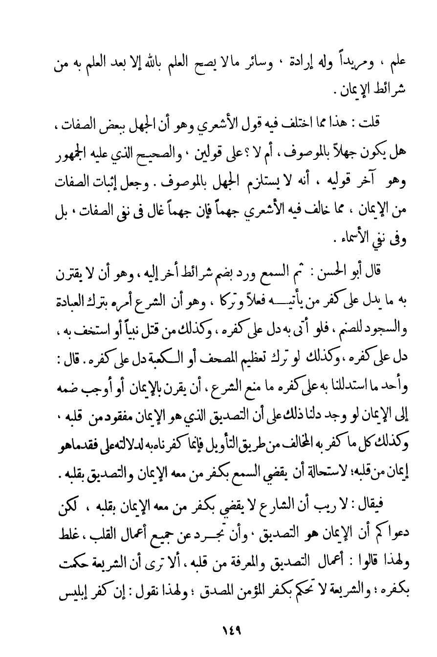 عِلْمٌ وَمُرِيدًا وَلَهُ إرَادَةٌ وَسَائِرُ مَا لَا يَصِحُّ الْعِلْمُ بِاَللَّهِ إلَّا بَعْدَ الْعِلْمِ بِهِ مِنْ شَرَائِطِ الْإِيمَانِ. قُلْت: هَذَا مِمَّا اخْتَلَفَ فِيهِ قَوْلَ الْأَشْعَرِيِّ وَهُوَ أَنَّ الْجَهْلَ بِبَعْضِ الصِّفَاتِ هَلْ يَكُونُ جَهْلًا بِالْمَوْصُوفِ أَمْ لَا؟ عَلَى قَوْلَيْنِ وَالصَّحِيحُ الَّذِي عَلَيْهِ الْجُمْهُورُ وَهُوَ آخِرُ قَوْلَيْهِ أَنَّهُ لَا يَسْتَلْزِمُ الْجَهْلَ بِالْمَوْصُوفِ. وَجَعْلُ إثْبَاتِ الصِّفَاتِ مِنْ الْإِيمَانِ مِمَّا خَالَفَ فِيهِ الْأَشْعَرِيُّ جَهْمًا فَإِنَّ جَهْمًا غَالٍ فِي نَفْيِ الصِّفَاتِ بَلْ وَفِي نَفْيِ الْأَسْمَاءِ. قَالَ أَبُو الْحَسَنِ: ثُمَّ السَّمْعُ وَرَدَ بِضَمِّ شَرَائِطَ أُخَرَ إلَيْهِ وَهُوَ أَنْ لَا يَقْتَرِنَ بِهِ مَا يَدُلُّ عَلَى كُفْرِ مَنْ يَأْتِيهِ فِعْلًا وَتَرْكًا وَهُوَ أَنَّ الشَّرْعَ أَمَرَهُ بِتَرْكِ الْعِبَادَةِ وَالسُّجُودِ لِلصَّنَمِ فَلَوْ أَتَى بِهِ دَلَّ عَلَى كُفْرِهِ وَكَذَلِكَ مَنْ قَتَلَ نَبِيًّا أَوْ اسْتَخَفَّ بِهِ دَلَّ عَلَى كُفْرِهِ وَكَذَلِكَ لَوْ تَرَكَ تَعْظِيمَ الْمُصْحَفِ أَوْ الْكَعْبَةِ دَلَّ عَلَى كُفْرِهِ. قَالَ: وَأَحَدُ مَا اسْتَدْلَلْنَا بِهِ عَلَى كُفْرِهِ مَا مَنَعَ الشَّرْعُ أَنْ يُقْرَنَ بِالْإِيمَانِ أَوْ أَوْجَبَ ضَمَّهُ إلَى الْإِيمَانِ لَوْ وُجِدَ دَلَّنَا ذَلِكَ عَلَى أَنَّ التَّصْدِيقَ الَّذِي هُوَ الْإِيمَانُ مَفْقُودٌ مِنْ قَلْبِهِ وَكَذَلِكَ كُلُّ مَا كَفَرَ بِهِ الْمُخَالِفُ مِنْ طَرِيقِ التَّأْوِيلِ فَإِنَّمَا كَفَّرْنَاهُ بِهِ لِدَلَالَتِهِ عَلَى فَقْدِ مَا هُوَ إيمَانٌ مِنْ قَلْبِهِ؛ لِاسْتِحَالَةِ أَنْ يَقْضِيَ السَّمْعُ بِكُفْرِ مَنْ مَعَهُ الْإِيمَانُ وَالتَّصْدِيقُ بِقَلْبِهِ. فَيُقَالُ: لَا رَيْبَ أَنَّ الشَّارِعَ لَا يَقْضِي بِكُفْرِ مَنْ مَعَهُ الْإِيمَانُ بِقَلْبِهِ لَكِنَّ دَعْوَاكُمْ أَنَّ الْإِيمَانَ هُوَ التَّصْدِيقُ وَإِنْ تَجَرَّدَ عَنْ جَمِيعِ أَعْمَالِ الْقَلْبِ غَلَطٌ، وَلِهَذَا قَالُوا: أَعْمَالُ التَّصْدِيقِ وَالْمَعْرِفَةِ مِنْ قَلْبِهِ أَلَا تَرَى أَنَّ الشَّرِيعَةَ حَكَمَتْ بِكُفْرِهِ؛ وَالشَّرِيعَةُ لَا تَحْكُمُ بِكُفْرِ الْمُؤْمِنِ الْمُصَدِّقِ؛ وَلِهَذَا نَقُولُ: إنَّ كُفْرَ إبْلِيسَ