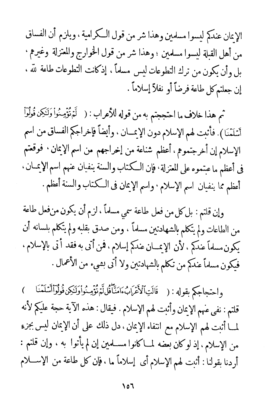الْإِيمَانَ عِنْدَكُمْ لَيْسُوا مُسْلِمِينَ وَهَذَا شَرٌّ مِنْ قَوْلِ الكَرَّامِيَة وَيَلْزَمُ أَنَّ الْفُسَّاقَ مِنْ أَهْلِ الْقِبْلَةِ لَيْسُوا مُسْلِمِينَ؛ وَهَذَا شَرٌّ مِنْ قَوْلِ الْخَوَارِجِ وَالْمُعْتَزِلَةِ وَغَيْرِهِمْ بَلْ وَأَنْ يَكُونَ مَنْ تَرَكَ التَّطَوُّعَاتِ لَيْسَ مُسْلِمًا إذْ كَانَتْ التَّطَوُّعَاتُ طَاعَةً لِلَّهِ إنْ جَعَلْتُمْ كُلَّ طَاعَةٍ فَرْضًا أَوْ نَفْلًا إسْلَامًا. ثُمَّ هَذَا خِلَافُ مَا احْتَجَجْتُمْ بِهِ مِنْ قَوْلِهِ لِلْأَعْرَابِ: {لَمْ تُؤْمِنُوا وَلَكِنْ قُولُوا أَسْلَمْنَا} . فَأَثْبَتَ لَهُمْ الْإِسْلَامَ دُونَ الْإِيمَانِ وَأَيْضًا فَإِخْرَاجُكُمْ الْفُسَّاقَ مِنْ اسْمِ الْإِسْلَامِ إنْ أَخَرَجْتُمُوهُمْ أَعْظَمُ شَنَاعَةً مِنْ إخْرَاجِهِمْ مِنْ اسْمِ الْإِيمَانِ فَوَقَعْتُمْ فِي أَعْظَمِ مَا عِبْتُمُوهُ عَلَى الْمُعْتَزِلَةِ فَإِنَّ الْكِتَابَ وَالسُّنَّةَ يَنْفِيَانِ عَنْهُمْ اسْمَ الْإِيمَانِ أَعْظَمَ مِمَّا يَنْفِيَانِ اسْمَ الْإِسْلَامِ وَاسْمُ الْإِيمَانِ فِي الْكِتَابِ وَالسُّنَّةِ أَعْظَمُ. وَإِنْ قُلْتُمْ: بَلْ كُلُّ مَنْ فَعَلَ طَاعَةً سُمِّيَ مُسْلِمًا لَزِمَ أَنْ يَكُونَ مَنْ فَعَلَ طَاعَةً مِنْ الطَّاعَاتِ وَلَمْ يَتَكَلَّمْ بِالشَّهَادَتَيْنِ مُسْلِمًا وَمَنْ صَدَّقَ بِقَلْبِهِ وَلَمْ يَتَكَلَّمْ بِلِسَانِهِ أَنْ يَكُونَ مُسْلِمًا عِنْدَكُمْ لِأَنَّ الْإِيمَانَ عِنْدَكُمْ إسْلَامٌ فَمَنْ أَتَى بِهِ فَقَدْ أَتَى بِالْإِسْلَامِ فَيَكُونُ مُسْلِمًا عِنْدَكُمْ مَنْ تَكَلَّمَ بِالشَّهَادَتَيْنِ وَلَا أَتَى بِشَيْءِ مِنْ الْأَعْمَالِ. وَاحْتِجَاجُكُمْ بِقَوْلِهِ: {قَالَتِ الْأَعْرَابُ آمَنَّا قُلْ لَمْ تُؤْمِنُوا وَلَكِنْ قُولُوا أَسْلَمْنَا} قُلْتُمْ: نَفَى عَنْهُمْ الْإِيمَانَ وَأَثْبَتَ لَهُمْ الْإِسْلَامَ. فَيُقَالُ: هَذِهِ الْآيَةُ حُجَّةٌ عَلَيْكُمْ لِأَنَّهُ لَمَّا أَثْبَتَ لَهُمْ الْإِسْلَامَ مَعَ انْتِفَاءِ الْإِيمَانِ دَلَّ ذَلِكَ عَلَى أَنَّ الْإِيمَانَ لَيْسَ بِجُزْءِ مِنْ الْإِسْلَامِ إذْ لَوْ كَانَ بَعْضُهُ لَمَا كَانُوا مُسْلِمِينَ إنْ لَمْ يَأْتُوا بِهِ وَإِنْ قُلْتُمْ: أَرَدْنَا بِقَوْلِنَا: أَثْبَتَ لَهُمْ الْإِسْلَامَ أَيْ إسْلَامًا مَا فَإِنَّ كُلَّ طَاعَةٍ مِنْ الْإِسْلَامِ