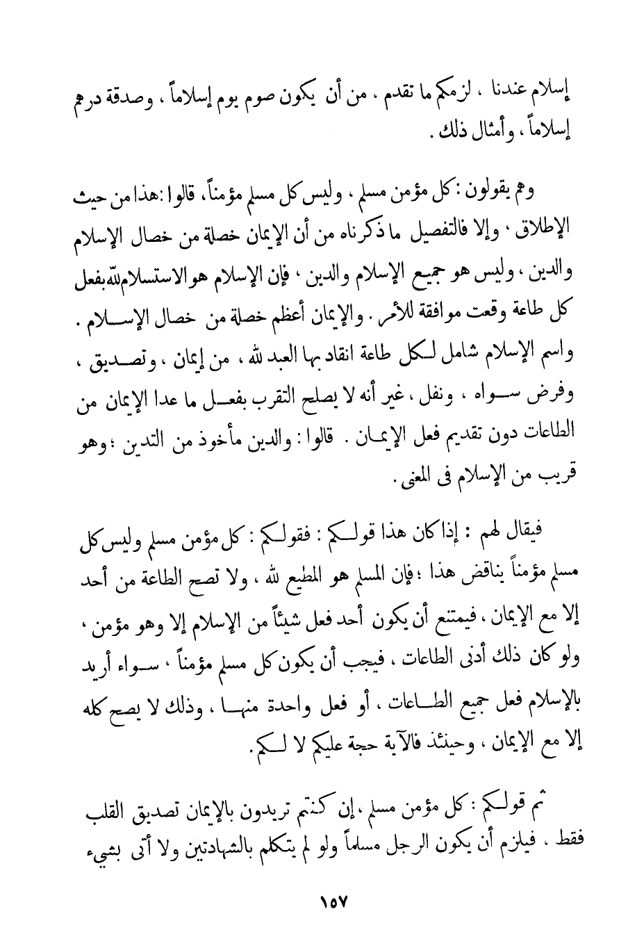 إسْلَامٌ عِنْدَنَا لَزِمَكُمْ مَا تَقَدَّمَ مِنْ أَنْ يَكُونَ صَوْمُ يَوْمٍ إسْلَامًا وَصَدَقَةُ دِرْهَمٍ إسْلَامًا وَأَمْثَالُ ذَلِكَ. وَهُمْ يَقُولُونَ: كُلُّ مُؤْمِنٍ مُسْلِمٌ وَلَيْسَ كُلُّ مُسْلِمٍ مُؤْمِنًا قَالُوا: هَذَا مِنْ حَيْثُ الْإِطْلَاقُ وَإِلَّا فَالتَّفْصِيلُ مَا ذَكَرْنَاهُ مِنْ أَنَّ الْإِيمَانَ خَصْلَةٌ مِنْ خِصَالِ الْإِسْلَامِ وَالدِّينِ وَلَيْسَ هُوَ جَمِيعُ الْإِسْلَامِ وَالدِّينِ فَإِنَّ الْإِسْلَامَ هُوَ الِاسْتِسْلَامُ لِلَّهِ بِفِعْلِ كُلِّ طَاعَةٍ وَقَعَتْ مُوَافِقَةً لِلْأَمْرِ. وَالْإِيمَانُ أَعْظَمُ خَصْلَةٍ مِنْ خِصَالِ الْإِسْلَامِ. وَاسْمُ الْإِسْلَامِ شَامِلٌ لِكُلِّ طَاعَةٍ انْقَادَ بِهَا الْعَبْدُ لِلَّهِ مِنْ إيمَانٍ وَتَصْدِيقٍ وَفَرْضٍ سِوَاهُ وَنَفْلٍ غَيْرَ أَنَّهُ لَا يَصْلُحُ التَّقَرُّبُ بِفِعْلِ مَا عَدَا الْإِيمَانَ مِنْ الطَّاعَاتِ دُونَ تَقْدِيمِ فِعْلِ الْإِيمَانِ. قَالُوا: وَالدِّينُ مَأْخُوذٌ مِنْ التَّدَيُّنِ؛ وَهُوَ قَرِيبٌ مِنْ الْإِسْلَامِ فِي الْمَعْنَى. فَيُقَالُ لَهُمْ: إذَا كَانَ هَذَا قَوْلَكُمْ: فَقَوْلُكُمْ: كُلُّ مُؤْمِنٍ مُسْلِمٌ وَلَيْسَ كُلُّ مُسْلِمٍ مُؤْمِنًا يُنَاقِضُ هَذَا؛ فَإِنَّ الْمُسْلِمَ هُوَ الْمُطِيعُ لِلَّهِ وَلَا تَصِحُّ الطَّاعَةُ مِنْ أَحَدٍ إلَّا مَعَ الْإِيمَانِ فَيَمْتَنِعُ أَنْ يَكُونَ أَحَدٌ فَعَلَ شَيْئًا مِنْ الْإِسْلَامِ إلَّا وَهُوَ مُؤْمِنٌ وَلَوْ كَانَ ذَلِكَ أَدْنَى الطَّاعَاتِ فَيَجِبُ أَنْ يَكُونَ كُلُّ مُسْلِمٍ مُؤْمِنًا سَوَاءٌ أُرِيدَ بِالْإِسْلَامِ فِعْلُ جَمِيعِ الطَّاعَاتِ أَوْ فِعْلُ وَاحِدَةٍ مِنْهَا وَذَلِكَ لَا يَصِحُّ كُلُّهُ إلَّا مَعَ الْإِيمَانِ وَحِينَئِذٍ فَالْآيَةُ حُجَّةٌ عَلَيْكُمْ لَا لَكُمْ. ثُمَّ قَوْلُكُمْ: كُلُّ مُؤْمِنٍ مُسْلِمٌ إنْ كُنْتُمْ تُرِيدُونَ بِالْإِيمَانِ تَصْدِيقَ الْقَلْبِ فَقَطْ فَيَلْزَمُ أَنْ يَكُونَ الرَّجُلُ مُسْلِمًا وَلَوْ لَمْ يَتَكَلَّمْ بِالشَّهَادَتَيْنِ وَلَا أَتَى بِشَيْءِ