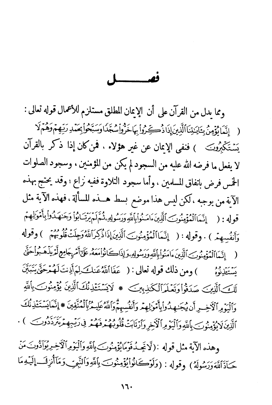 وَمِمَّا يَدُلُّ مِنْ الْقُرْآنِ عَلَى أَنَّ الْإِيمَانَ الْمُطْلَقَ مُسْتَلْزِمٌ لِلْأَعْمَالِ قَوْله تَعَالَى {إنَّمَا يُؤْمِنُ بِآيَاتِنَا الَّذِينَ إذَا ذُكِّرُوا بِهَا خَرُّوا سُجَّدًا وَسَبَّحُوا بِحَمْدِ رَبِّهِمْ وَهُمْ لَا يَسْتَكْبِرُونَ} فَنَفَى الْإِيمَانَ عَنْ غَيْرِ هَؤُلَاءِ فَمَنْ كَانَ إذَا ذَكَرَ بِالْقُرْآنِ لَا يَفْعَلُ مَا فَرَضَهُ اللَّهُ عَلَيْهِ مِنْ السُّجُودِ لَمْ يَكُنْ مِنْ الْمُؤْمِنِينَ وَسُجُودُ الصَّلَوَاتِ الْخَمْسِ فَرْضٌ بِاتِّفَاقِ الْمُسْلِمِينَ وَأَمَّا سُجُودُ التِّلَاوَةِ فَفِيهِ نِزَاعٌ؛ وَقَدْ يَحْتَجُّ بِهَذِهِ الْآيَةِ مَنْ يُوجِبُهُ لَكِنْ لَيْسَ هَذَا مَوْضِعَ بَسْطِ هَذِهِ الْمَسْأَلَةِ فَهَذِهِ الْآيَةُ مِثْلُ قَوْلِهِ: {إنَّمَا الْمُؤْمِنُونَ الَّذِينَ آمَنُوا بِاللَّهِ وَرَسُولِهِ ثُمَّ لَمْ يَرْتَابُوا وَجَاهَدُوا بِأَمْوَالِهِمْ وَأَنْفُسِهِمْ} . وَقَوْلِهِ: {إنَّمَا الْمُؤْمِنُونَ الَّذِينَ إذَا ذُكِرَ اللَّهُ وَجِلَتْ قُلُوبُهُمْ} وَقَوْلِهِ {إنَّمَا الْمُؤْمِنُونَ الَّذِينَ آمَنُوا بِاللَّهِ وَرَسُولِهِ وَإِذَا كَانُوا مَعَهُ عَلَى أَمْرٍ جَامِعٍ لَمْ يَذْهَبُوا حَتَّى يَسْتَأْذِنُوهُ} وَمِنْ ذَلِكَ قَوْله تَعَالَى {عَفَا اللَّهُ عَنْكَ لِمَ أَذِنْتَ لَهُمْ حَتَّى يَتَبَيَّنَ لَكَ الَّذِينَ صَدَقُوا وَتَعْلَمَ الْكَاذِبِينَ} {لَا يَسْتَأْذِنُكَ الَّذِينَ يُؤْمِنُونَ بِاللَّهِ وَالْيَوْمِ الْآخِرِ أَنْ يُجَاهِدُوا بِأَمْوَالِهِمْ وَأَنْفُسِهِمْ وَاللَّهُ عَلِيمٌ بِالْمُتَّقِينَ} {إنَّمَا يَسْتَأْذِنُكَ الَّذِينَ لَا يُؤْمِنُونَ بِاللَّهِ وَالْيَوْمِ الْآخِرِ وَارْتَابَتْ قُلُوبُهُمْ فَهُمْ فِي رَيْبِهِمْ يَتَرَدَّدُونَ} . وَهَذِهِ الْآيَةُ مِثْلُ قَوْلِهِ: {لَا تَجِدُ قَوْمًا يُؤْمِنُونَ بِاللَّهِ وَالْيَوْمِ الْآخِرِ يُوَادُّونَ مَنْ حَادَّ اللَّهَ وَرَسُولَهُ} وَقَوْلِهِ: {وَلَوْ كَانُوا يُؤْمِنُونَ بِاللَّهِ وَالنَّبِيِّ وَمَا أُنْزِلَ إلَيْهِ