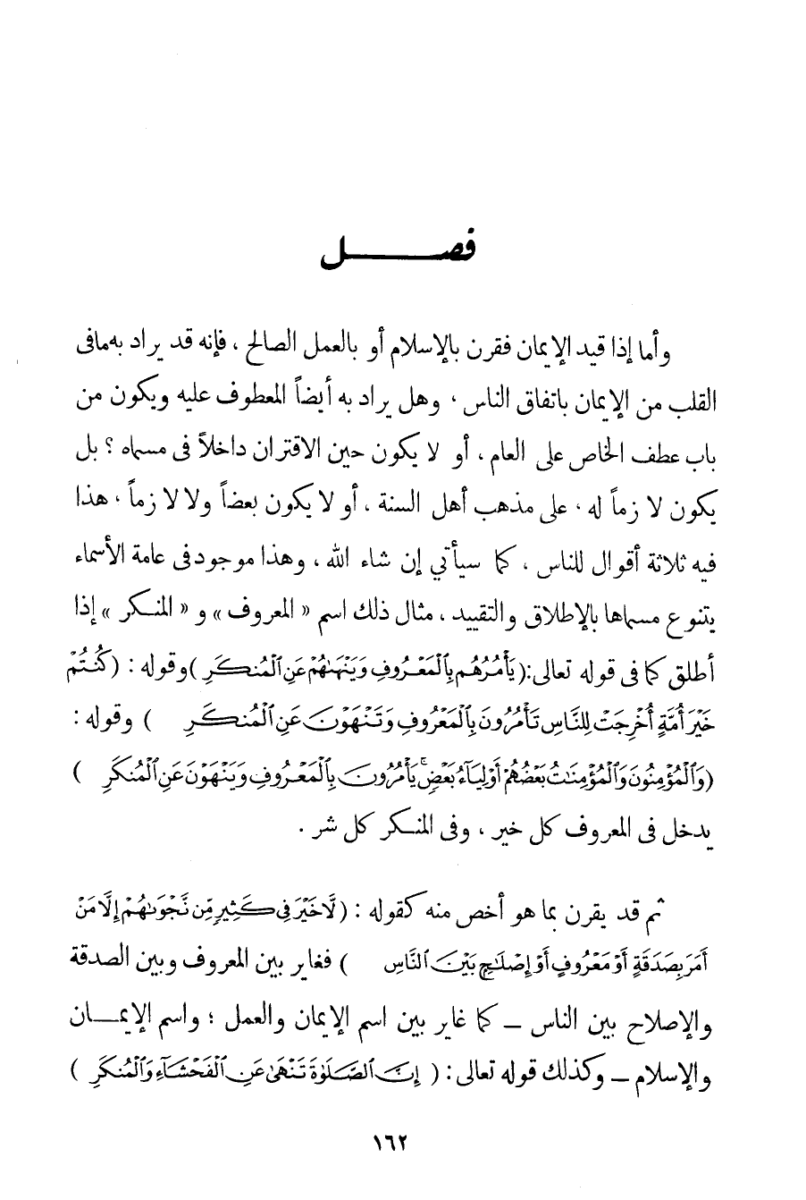 وَأَمَّا إذَا قُيِّدَ الْإِيمَانُ فَقُرِنَ بِالْإِسْلَامِ أَوْ بِالْعَمَلِ الصَّالِحِ فَإِنَّهُ قَدْ يُرَادُ بِهِ مَا فِي الْقَلْبِ مِنْ الْإِيمَانِ بِاتِّفَاقِ النَّاسِ وَهَلْ يُرَادُ بِهِ أَيْضًا الْمَعْطُوفُ عَلَيْهِ وَيَكُونُ مِنْ بَابِ عَطْفِ الْخَاصِّ عَلَى الْعَامِّ أَوْ لَا يَكُونُ حِينَ الِاقْتِرَانِ دَاخِلًا فِي مُسَمَّاهُ؟ بَلْ يَكُونُ لَازِمًا لَهُ عَلَى مَذْهَبِ أَهْلِ السُّنَّةِ أَوْ لَا يَكُونُ بَعْضًا وَلَا لَازِمًا هَذَا فِيهِ ثَلَاثَةُ أَقْوَالٍ لِلنَّاسِ كَمَا سَيَأْتِي إنْ شَاءَ اللَّهُ وَهَذَا مَوْجُودٌ فِي عَامَّةِ الْأَسْمَاءِ يَتَنَوَّعُ مُسَمَّاهَا بِالْإِطْلَاقِ وَالتَّقْيِيدِ مِثَالُ ذَلِكَ اسْمُ " الْمَعْرُوفِ " وَ " الْمُنْكَرِ " إذَا أُطْلِقَ كَمَا فِي قَوْله تَعَالَى {يَأْمُرُهُمْ بِالْمَعْرُوفِ وَيَنْهَاهُمْ عَنِ الْمُنْكَرِ} وَقَوْلُهُ: {كُنْتُمْ خَيْرَ أُمَّةٍ أُخْرِجَتْ لِلنَّاسِ تَأْمُرُونَ بِالْمَعْرُوفِ وَتَنْهَوْنَ عَنِ الْمُنْكَرِ} وَقَوْلُهُ: {وَالْمُؤْمِنُونَ وَالْمُؤْمِنَاتُ بَعْضُهُمْ أَوْلِيَاءُ بَعْضٍ يَأْمُرُونَ بِالْمَعْرُوفِ وَيَنْهَوْنَ عَنِ الْمُنْكَرِ} يَدْخُلُ فِي الْمَعْرُوفِ كُلُّ خَيْرٍ وَفِي الْمُنْكَرِ كُلُّ شَرٍّ. ثُمَّ قَدْ يُقْرَنُ بِمَا هُوَ أَخَصُّ مِنْهُ كَقَوْلِهِ: {لَا خَيْرَ فِي كَثِيرٍ مِنْ نَجْوَاهُمْ إلَّا مَنْ أَمَرَ بِصَدَقَةٍ أَوْ مَعْرُوفٍ أَوْ إصْلَاحٍ بَيْنَ النَّاسِ} فَغَايَرَ بَيْنَ الْمَعْرُوفِ وَبَيْنَ الصَّدَقَةِ وَالْإِصْلَاحِ بَيْنَ النَّاسِ - كَمَا غَايَرَ بَيْنَ اسْمِ الْإِيمَانِ وَالْعَمَلِ؛ وَاسْمِ الْإِيمَانِ وَالْإِسْلَامِ - وَكَذَلِكَ قَوْله تَعَالَى {إنَّ الصَّلَاةَ تَنْهَى عَنِ الْفَحْشَاءِ وَالْمُنْكَرِ} غَايَرَ