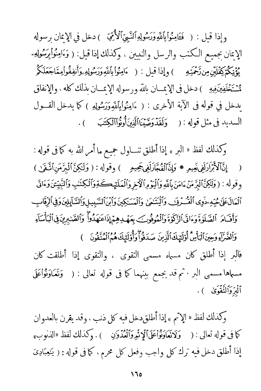 وَإِذَا قِيلَ: {فَآمِنُوا بِاللَّهِ وَرَسُولِهِ النَّبِيِّ الْأُمِّيِّ} دَخَلَ فِي الْإِيمَانِ بِرَسُولِهِ الْإِيمَانُ بِجَمِيعِ الْكُتُبِ وَالرُّسُلِ وَالنَّبِيِّينَ وَكَذَلِكَ إذَا قِيلَ: {وَآمِنُوا بِرَسُولِهِ يُؤْتِكُمْ كِفْلَيْنِ مِنْ رَحْمَتِهِ} وَإِذَا قِيلَ: {آمِنُوا بِاللَّهِ وَرَسُولِهِ وَأَنْفِقُوا مِمَّا جَعَلَكُمْ مُسْتَخْلَفِينَ فِيهِ} دَخَلَ فِي الْإِيمَانِ بِاَللَّهِ وَرَسُولِهِ الْإِيمَانُ بِذَلِكَ كُلِّهِ وَالْإِنْفَاقُ يَدْخُلُ فِي قَوْلِهِ فِي الْآيَةِ الْأُخْرَى: {آمِنُوا بِاللَّهِ وَرَسُولِهِ} كَمَا يَدْخُلُ الْقَوْلُ السَّدِيدُ فِي مِثْلِ قَوْلِهِ: {وَلَقَدْ وَصَّيْنَا الَّذِينَ أُوتُوا الْكِتَابَ} . وَكَذَلِكَ لَفْظُ " الْبِرِّ " إذَا أُطْلِقَ تَنَاوَلَ جَمِيعَ مَا أَمَرَ اللَّهُ بِهِ كَمَا فِي قَوْلِهِ: {إنَّ الْأَبْرَارَ لَفِي نَعِيمٍ} {وَإِنَّ الْفُجَّارَ لَفِي جَحِيمٍ} وَقَوْلِهِ: {وَلَكِنَّ الْبِرَّ مَنِ اتَّقَى} وَقَوْلِهِ: {وَلَكِنَّ الْبِرَّ مَنْ آمَنَ بِاللَّهِ وَالْيَوْمِ الْآخِرِ وَالْمَلَائِكَةِ وَالْكِتَابِ وَالنَّبِيِّينَ وَآتَى الْمَالَ عَلَى حُبِّهِ ذَوِي الْقُرْبَى وَالْيَتَامَى وَالْمَسَاكِينَ وَابْنَ السَّبِيلِ وَالسَّائِلِينَ وَفِي الرِّقَابِ وَأَقَامَ الصَّلَاةَ وَآتَى الزَّكَاةَ وَالْمُوفُونَ بِعَهْدِهِمْ إذَا عَاهَدُوا وَالصَّابِرِينَ فِي الْبَأْسَاءِ وَالضَّرَّاءِ وَحِينَ الْبَأْسِ أُولَئِكَ الَّذِينَ صَدَقُوا وَأُولَئِكَ هُمُ الْمُتَّقُونَ} فَالْبِرُّ إذَا أُطْلِقَ كَانَ مُسَمَّاهُ مُسَمَّى التَّقْوَى وَالتَّقْوَى إذَا أُطْلِقَتْ كَانَ مُسَمَّاهَا مُسَمَّى الْبِرِّ ثُمَّ قَدْ يُجْمَعُ بَيْنَهُمَا كَمَا فِي قَوْله تَعَالَى {وَتَعَاوَنُوا عَلَى الْبِرِّ وَالتَّقْوَى} . وَكَذَلِكَ لَفْظُ " الْإِثْمِ " إذَا أُطْلِقَ دَخَلَ فِيهِ كُلُّ ذَنْبٍ وَقَدْ يُقْرَنُ بِالْعُدْوَانِ كَمَا فِي قَوْله تَعَالَى {وَلَا تَعَاوَنُوا عَلَى الْإِثْمِ وَالْعُدْوَانِ} . وَكَذَلِكَ لَفْظُ " الذُّنُوبِ " إذَا أُطْلِقَ دَخَلَ فِيهِ تَرْكُ كُلِّ وَاجِبٍ وَفِعْلُ كُلِّ مُحَرَّمٍ كَمَا فِي قَوْلِهِ: {يَا عِبَادِيَ