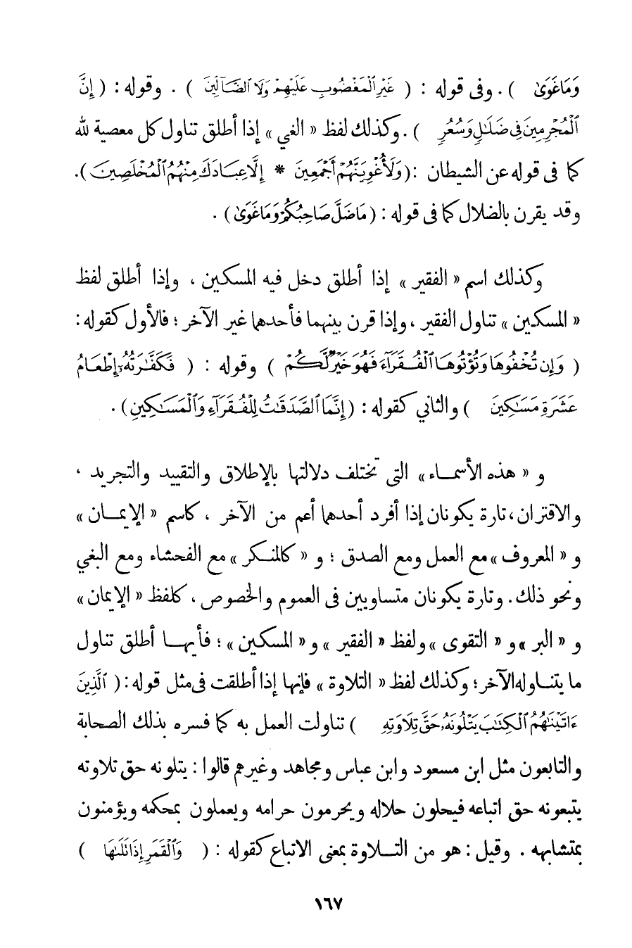 وَمَا غَوَى} . وَفِي قَوْلِهِ: {غَيْرِ الْمَغْضُوبِ عَلَيْهِمْ وَلَا الضَّالِّينَ} . وَقَوْلِهِ: {إنَّ الْمُجْرِمِينَ فِي ضَلَالٍ وَسُعُرٍ} . وَكَذَلِكَ لَفْظُ " الْغَيِّ " إذَا أُطْلِقَ تَنَاوَلَ كُلَّ مَعْصِيَةٍ لِلَّهِ كَمَا فِي قَوْلِهِ عَنْ الشَّيْطَانِ: {وَلَأُغْوِيَنَّهُمْ أَجْمَعِينَ} {إلَّا عِبَادَكَ مِنْهُمُ الْمُخْلَصِينَ} . وَقَدْ يُقْرَنُ بِالضَّلَالِ كَمَا فِي قَوْلِهِ: {مَا ضَلَّ صَاحِبُكُمْ وَمَا غَوَى} . وَكَذَلِكَ اسْمُ " الْفَقِيرِ " إذَا أُطْلِقَ دَخَلَ فِيهِ الْمِسْكِينُ وَإِذَا أُطْلِقَ لَفْظُ " الْمِسْكِينِ " تَنَاوَلَ الْفَقِيرَ وَإِذَا قُرِنَ بَيْنَهُمَا فَأَحَدُهُمَا غَيْرُ الْآخَرِ؛ فَالْأَوَّلُ كَقَوْلِهِ: {وَإِنْ تُخْفُوهَا وَتُؤْتُوهَا الْفُقَرَاءَ فَهُوَ خَيْرٌ لَكُمْ} وَقَوْلِهِ: {فَكَفَّارَتُهُ إطْعَامُ عَشَرَةِ مَسَاكِينَ} وَالثَّانِي كَقَوْلِهِ: {إنَّمَا الصَّدَقَاتُ لِلْفُقَرَاءِ وَالْمَسَاكِينِ} . وَ " هَذِهِ الْأَسْمَاءُ " الَّتِي تَخْتَلِفُ دَلَالَتُهَا بِالْإِطْلَاقِ وَالتَّقْيِيدِ وَالتَّجْرِيدِ وَالِاقْتِرَانِ تَارَةً يَكُونَانِ إذَا أُفْرِدَ أَحَدُهُمَا أَعَمَّ مِنْ الْآخَرِ كَاسْمِ " الْإِيمَانِ " وَ " الْمَعْرُوفِ " مَعَ الْعَمَلِ وَمَعَ الصِّدْقِ؛ وَ " كَالْمُنْكَرِ " مَعَ الْفَحْشَاءِ وَمَعَ الْبَغْيِ وَنَحْوِ ذَلِكَ. وَتَارَةً يَكُونَانِ مُتَسَاوِيَيْنِ فِي الْعُمُومِ وَالْخُصُوصِ كَلَفْظِ " الْإِيمَانِ " وَ " الْبِرِّ " وَ " التَّقْوَى " وَلَفْظِ " الْفَقِيرِ " وَ " الْمِسْكِينِ "؛ فَأَيُّهَا أُطْلِقَ تَنَاوَلَ مَا يَتَنَاوَلُهُ الْآخَرُ؛ وَكَذَلِكَ لَفْظُ " التِّلَاوَةِ " فَإِنَّهَا إذَا أُطْلِقَتْ فِي مِثْلِ قَوْلِهِ: {الَّذِينَ آتَيْنَاهُمُ الْكِتَابَ يَتْلُونَهُ حَقَّ تِلَاوَتِهِ} تَنَاوَلَتْ الْعَمَلَ بِهِ كَمَا فَسَّرَهُ بِذَلِكَ الصَّحَابَةُ وَالتَّابِعُونَ مِثْلَ ابْنِ مَسْعُودٍ وَابْنِ عَبَّاسٍ وَمُجَاهِدٍ وَغَيْرِهِمْ قَالُوا: يَتْلُونَهُ حَقَّ تِلَاوَتِهِ يَتَّبِعُونَهُ حَقَّ اتِّبَاعِهِ فَيُحِلُّونَ حَلَالَهُ وَيُحَرِّمُونَ حَرَامَهُ وَيَعْمَلُونَ بِمُحْكَمِهِ وَيُؤْمِنُونَ بِمُتَشَابِهِهِ. وَقِيلَ: هُوَ مِنْ التِّلَاوَةِ بِمَعْنَى الِاتِّبَاعِ كَقَوْلِهِ: {وَالْقَمَرِ إذَا تَلَاهَا}