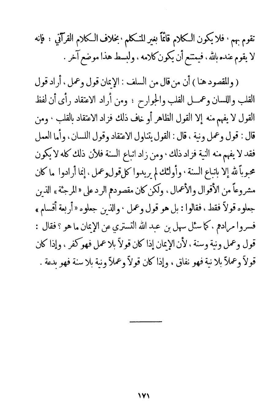 وَالْمَقْصُودُ هُنَا أَنَّ مَنْ قَالَ مِنْ السَّلَفِ: الْإِيمَانُ قَوْلٌ وَعَمَلٌ أَرَادَ قَوْلَ الْقَلْبِ وَاللِّسَانِ وَعَمَلَ الْقَلْبِ وَالْجَوَارِحِ؛ وَمَنْ أَرَادَ الِاعْتِقَادَ رَأَى أَنَّ لَفْظَ الْقَوْلِ لَا يُفْهَمُ مِنْهُ إلَّا الْقَوْلُ الظَّاهِرُ أَوْ خَافَ ذَلِكَ فَزَادَ الِاعْتِقَادُ بِالْقَلْبِ وَمَنْ قَالَ: قَوْلٌ وَعَمَلٌ وَنِيَّةٌ قَالَ: الْقَوْلُ يَتَنَاوَلُ الِاعْتِقَادَ وَقَوْلَ اللِّسَانِ وَأَمَّا الْعَمَلُ فَقَدْ لَا يُفْهَمُ مِنْهُ النِّيَّةُ فَزَادَ ذَلِكَ وَمَنْ زَادَ اتِّبَاعَ السُّنَّةِ فَلِأَنَّ ذَلِكَ كُلَّهُ لَا يَكُونُ مَحْبُوبًا لِلَّهِ إلَّا بِاتِّبَاعِ السُّنَّةِ وَأُولَئِكَ لَمْ يُرِيدُوا كُلَّ قَوْلٍ وَعَمَلٍ إنَّمَا أَرَادُوا مَا كَانَ مَشْرُوعًا مِنْ الْأَقْوَالِ وَالْأَعْمَالِ وَلَكِنْ كَانَ مَقْصُودُهُمْ الرَّدَّ عَلَى " الْمُرْجِئَةِ " الَّذِينَ جَعَلُوهُ قَوْلًا فَقَطْ فَقَالُوا: بَلْ هُوَ قَوْلٌ وَعَمَلٌ وَاَلَّذِينَ جَعَلُوهُ " أَرْبَعَةَ أَقْسَامٍ " فَسَّرُوا مُرَادَهُمْ كَمَا سُئِلَ سَهْلُ بْنُ عَبْدِ اللَّهِ التستري عَنْ الْإِيمَانِ مَا هُوَ؟ فَقَالَ: قَوْلٌ وَعَمَلٌ وَنِيَّةٌ وَسُنَّةٌ لِأَنَّ الْإِيمَانَ إذَا كَانَ قَوْلًا بِلَا عَمَلٍ فَهُوَ كُفْرٌ وَإِذَا كَانَ قَوْلًا وَعَمَلًا بِلَا نِيَّةٍ فَهُوَ نِفَاقٌ وَإِذَا كَانَ قَوْلًا وَعَمَلًا وَنِيَّةً بِلَا سُنَّةٍ فَهُوَ بِدْعَةٌ.